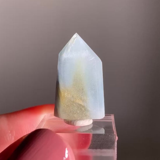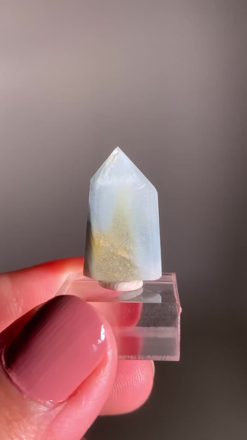 This rare Blue Amphibole tower features soft, ethereal shades of blue and white, often with cloud-like inclusions that create a dreamy, celestial appearance. Known for its calming and spiritual energy, Blue Amphibole is believed to support intuition, mental clarity, and inner peace. Polished into a sleek tower, it’s ideal for meditation and bringing a serene touch to any space.