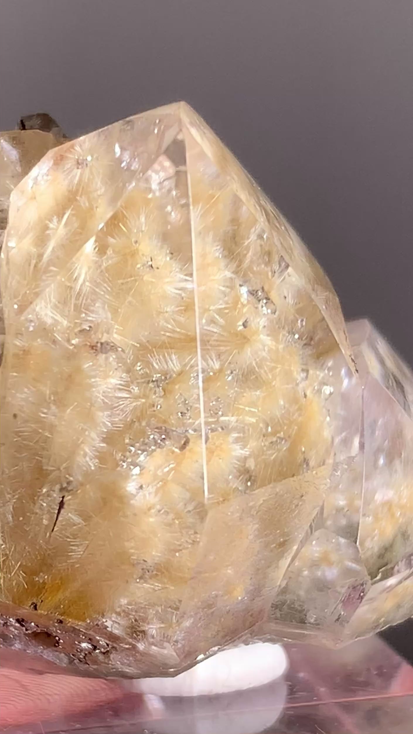 This collector’s grade semi-polished Gold Flower Rutile cluster from Brazil showcases exquisite sprays of radiant golden tree rutile forming flower-like patterns within clear quartz. Look closely and you’ll find numerous tiny manifestation crystals growing upon the rutile—an extraordinary and rare natural occurrence. With its semi-polished finish, this piece beautifully balances raw texture and refined shine, making it a true treasure for serious mineral enthusiasts and collectors.