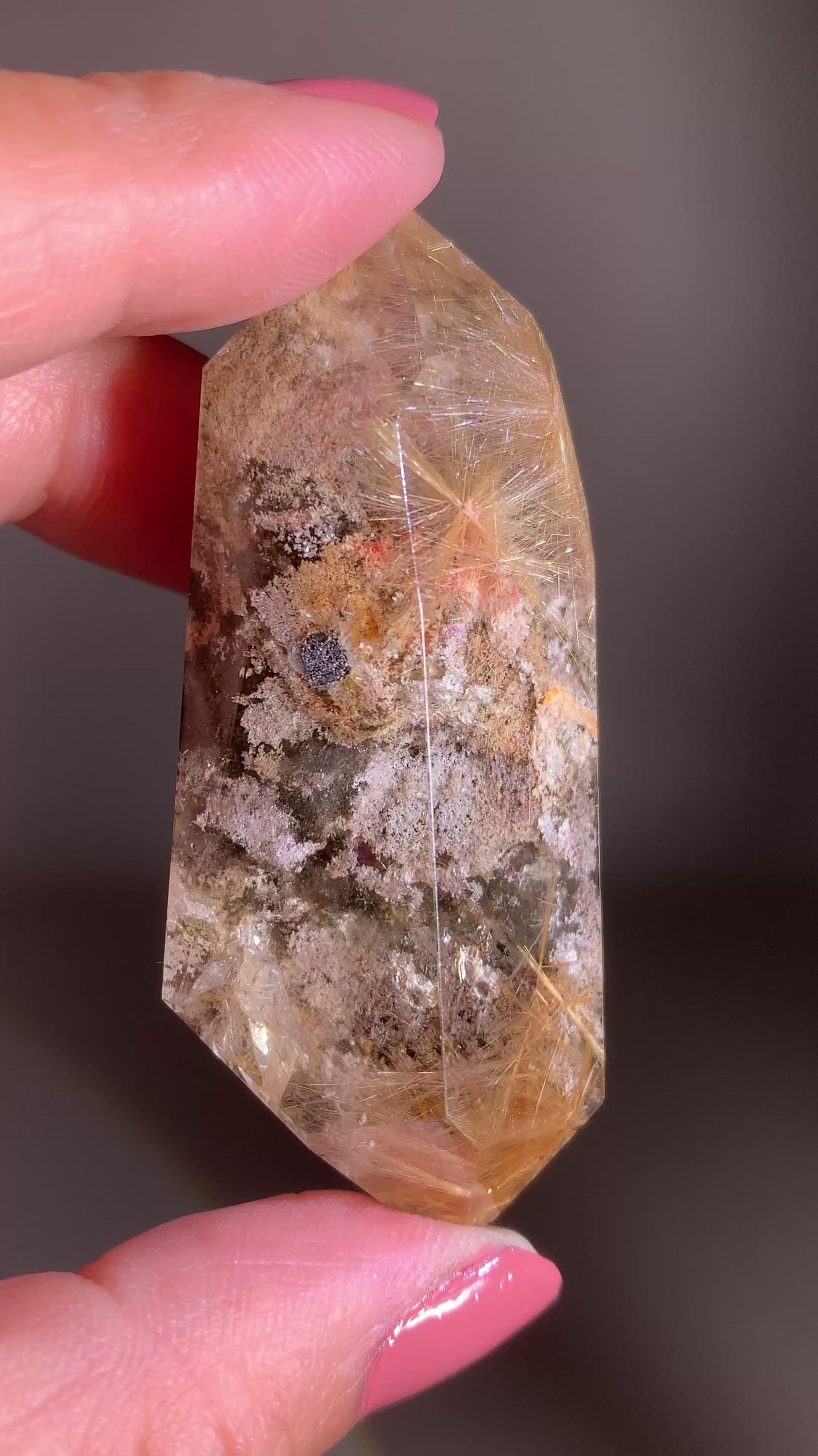 This collector’s piece features a double-terminated Gold Rutile Flower Quartz from Brazil, highlighted by radiant golden rutile blooms and natural garden inclusions. Its complete crystal formation and intricate internal landscapes create exceptional depth and visual interest from every angle. A rare and striking specimen with outstanding character, perfect for serious collectors and refined display.