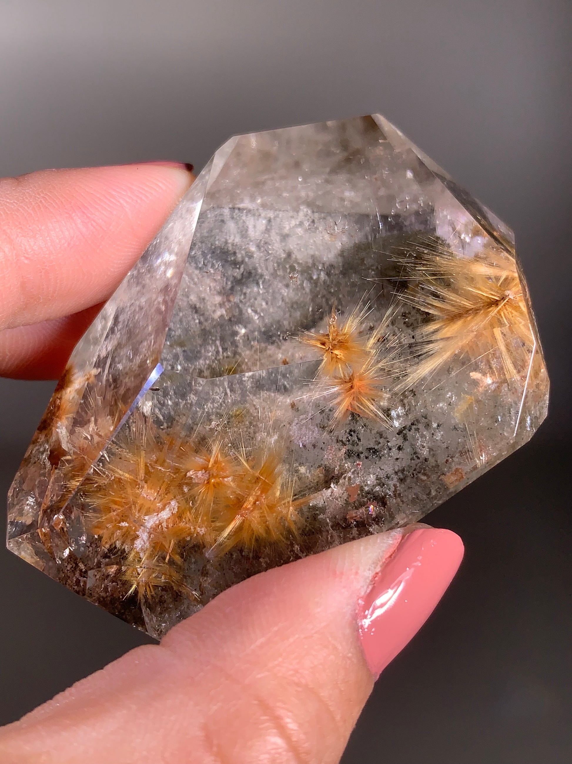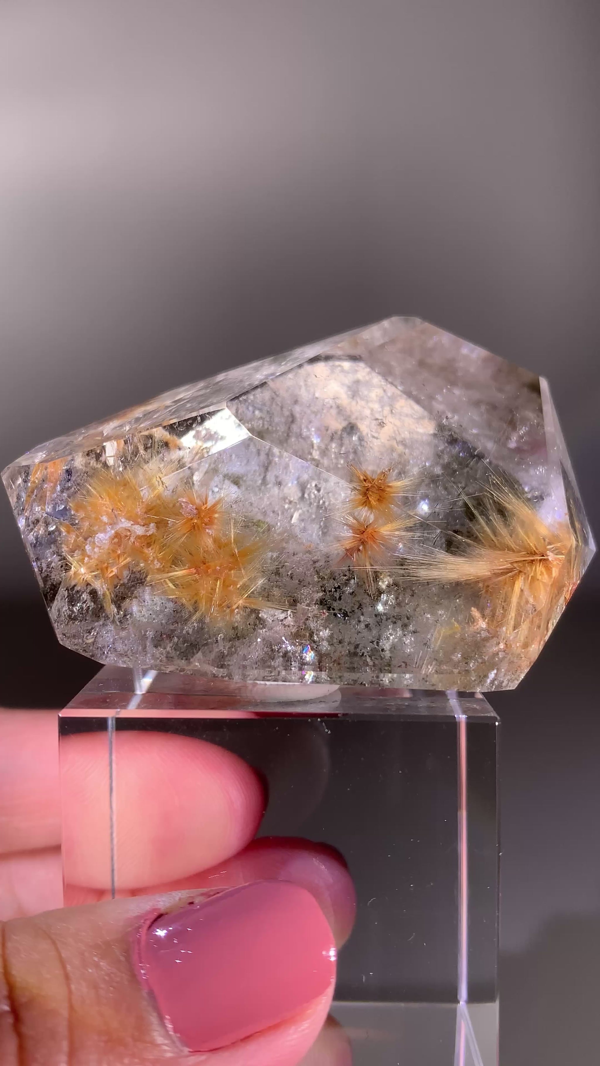 This collector’s piece Gold Starburst Rutile Quartz polished freeform from Brazil showcases bright golden rutile blooms paired with natural garden inclusions that create beautiful internal scenery. The freeform polish highlights its depth, clarity, and intricate details, making it a striking piece to enjoy from every angle. A rare and visually captivating Brazilian specimen with strong character and collector appeal.