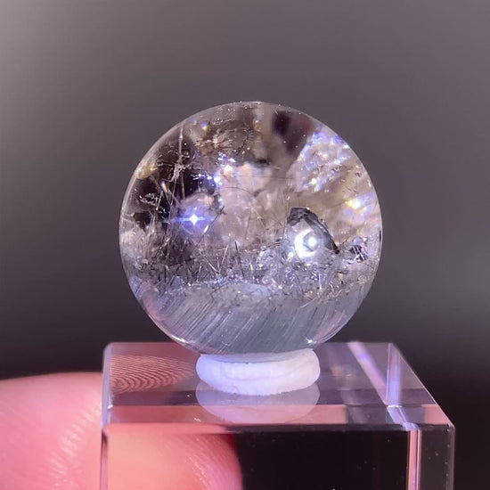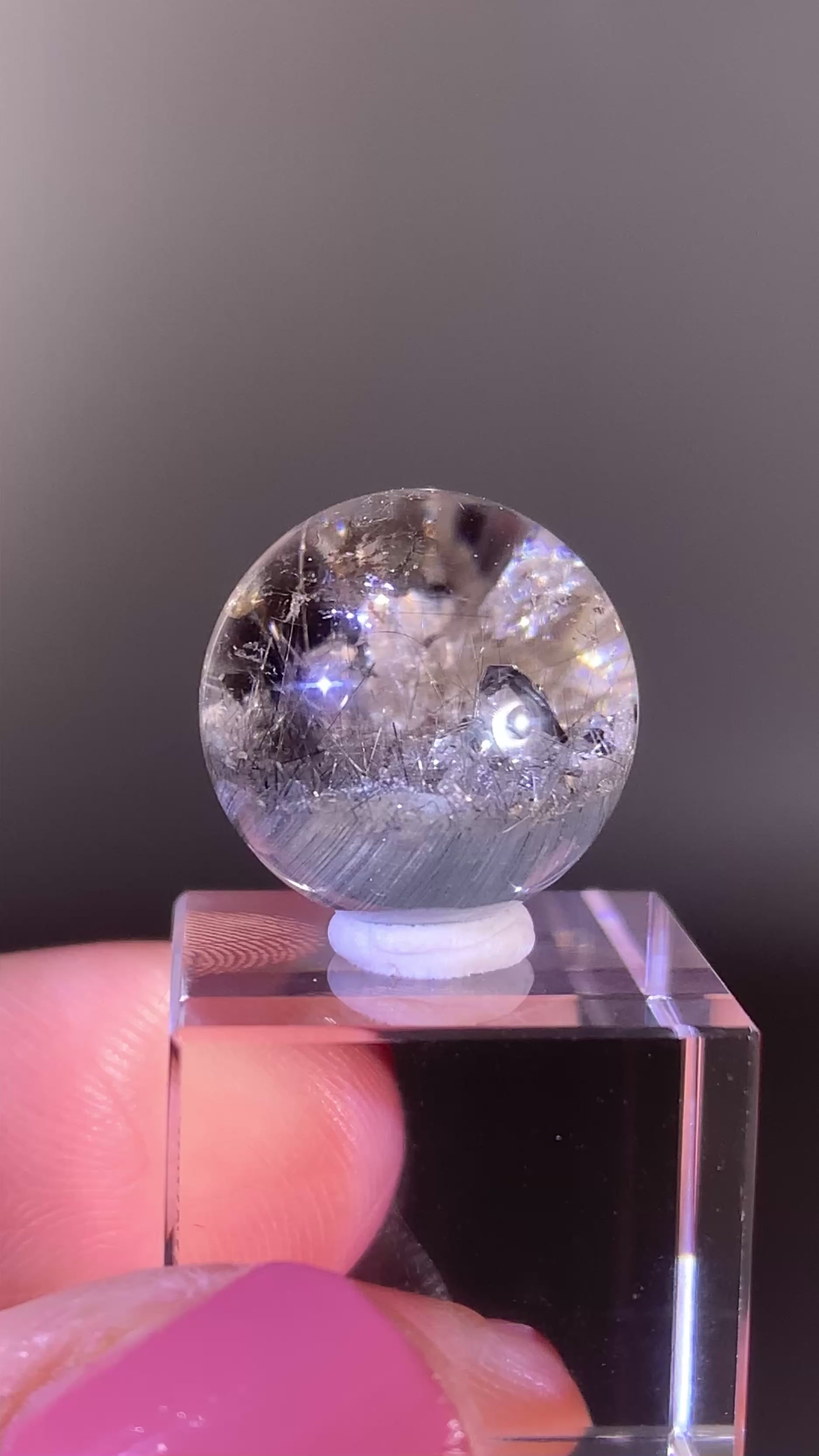 Collector’s piece grey amphibole sphere with silver rutile and quartz-in-quartz manifestation from Brazil. This rare polished sphere features intricate internal formations, metallic silver rutile needles, layered grey amphibole inclusions, and a natural manifestation crystal, making it highly sought after by serious crystal and mineral collectors.