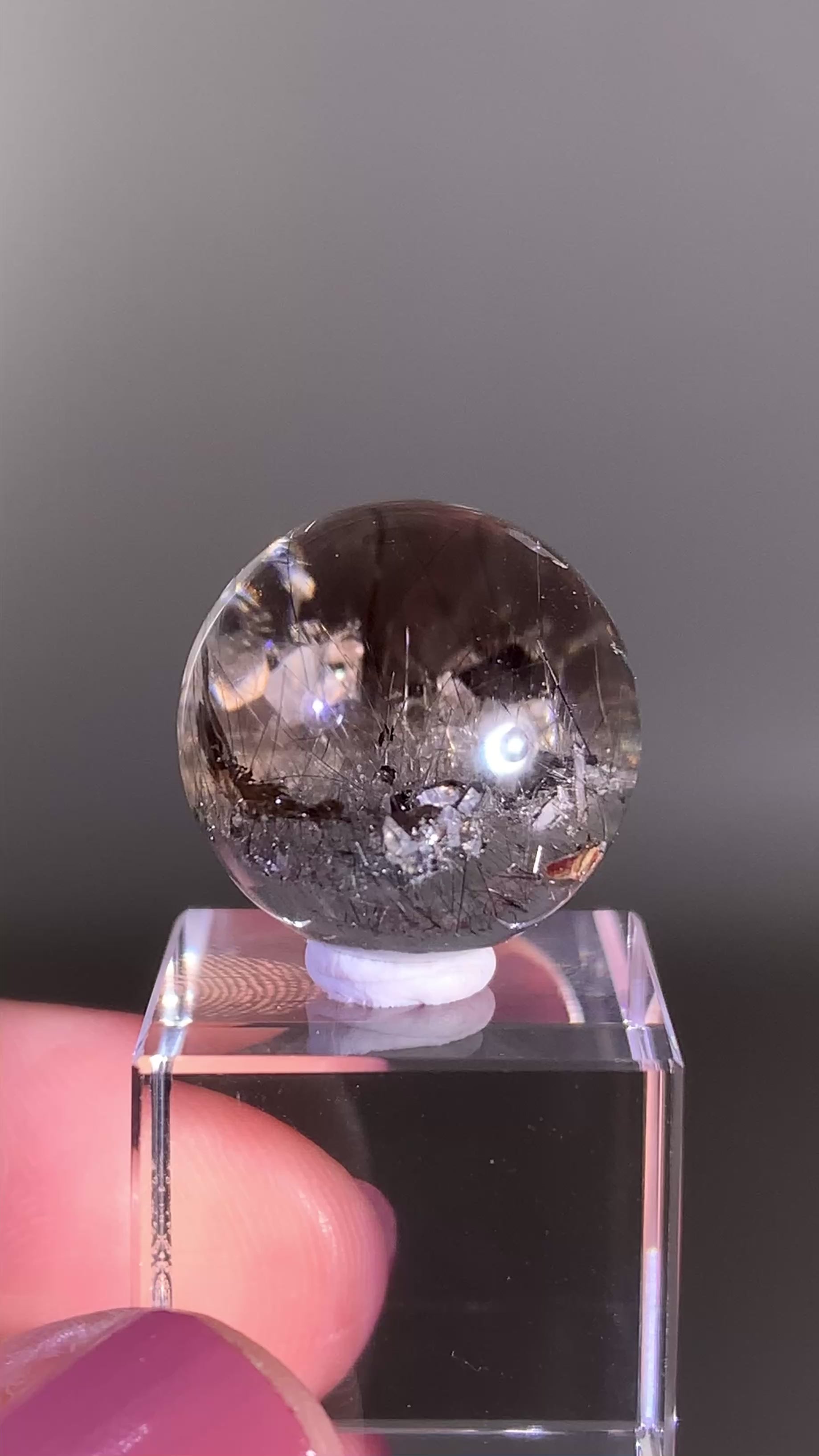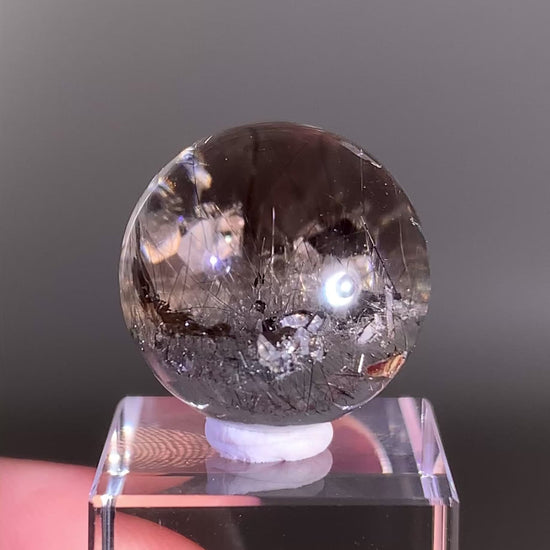 Collector’s piece grey amphibole sphere with silver rutile and quartz-in-quartz manifestation from Brazil. This rare polished sphere features intricate internal formations, metallic silver rutile needles, layered grey amphibole inclusions, and a natural manifestation crystal, making it highly sought after by serious crystal and mineral collectors.