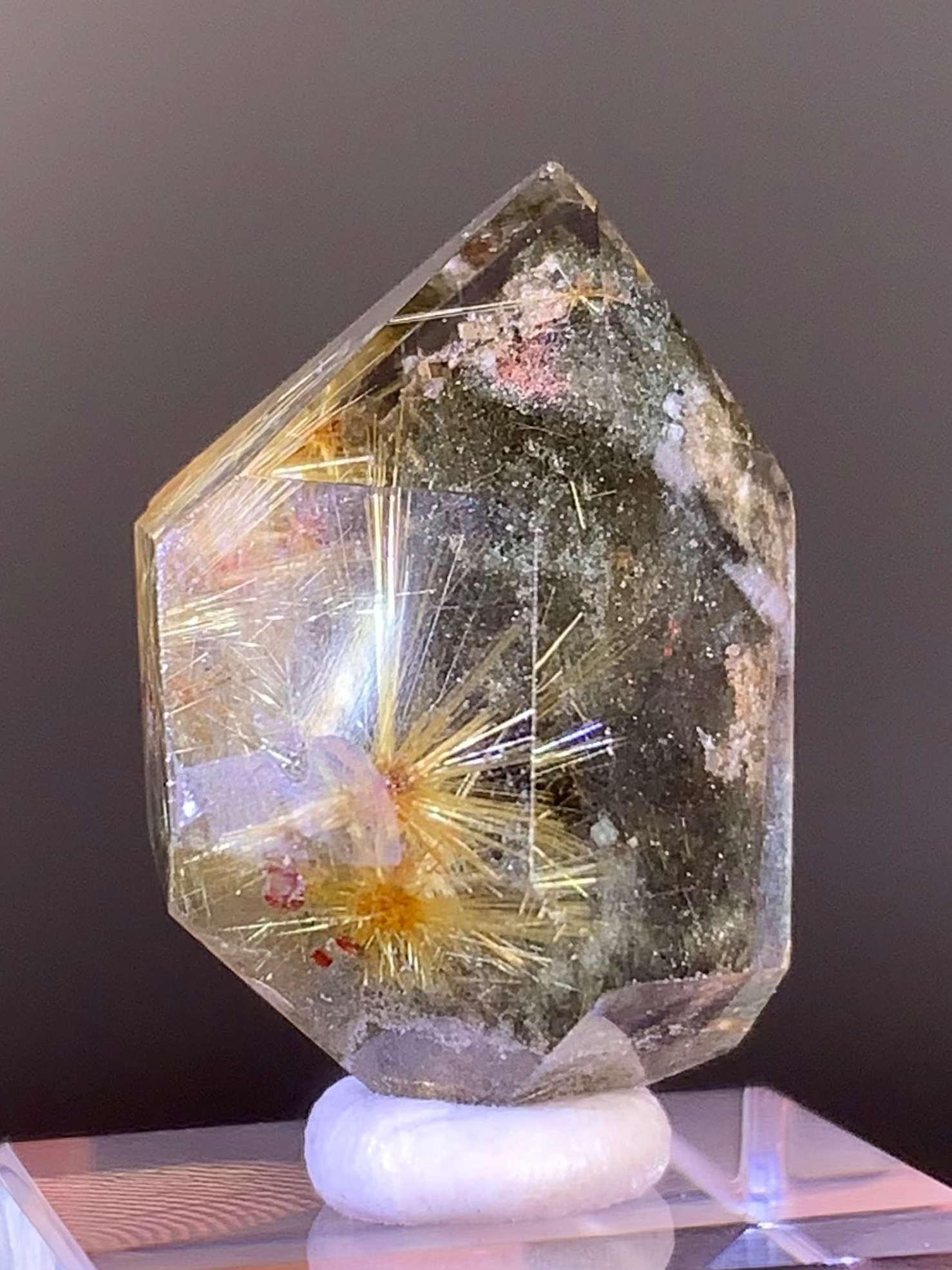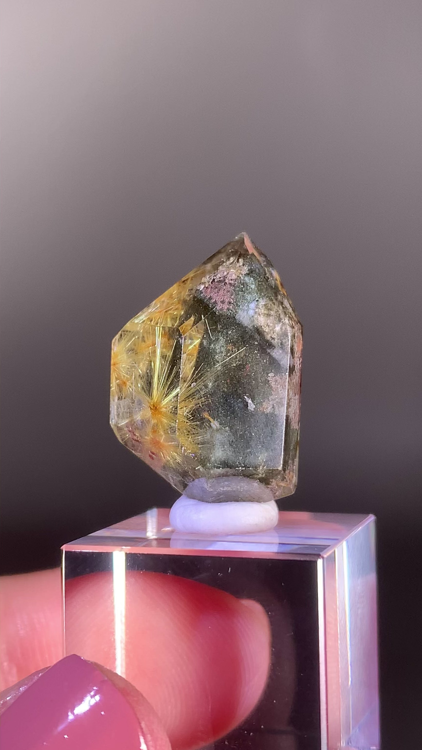 Collector’s piece scenic gold rutile with green and pink garden quartz from Brazil. This high-quality Brazilian rutile quartz features striking gold rutile formations and vibrant green and pink garden inclusions.
