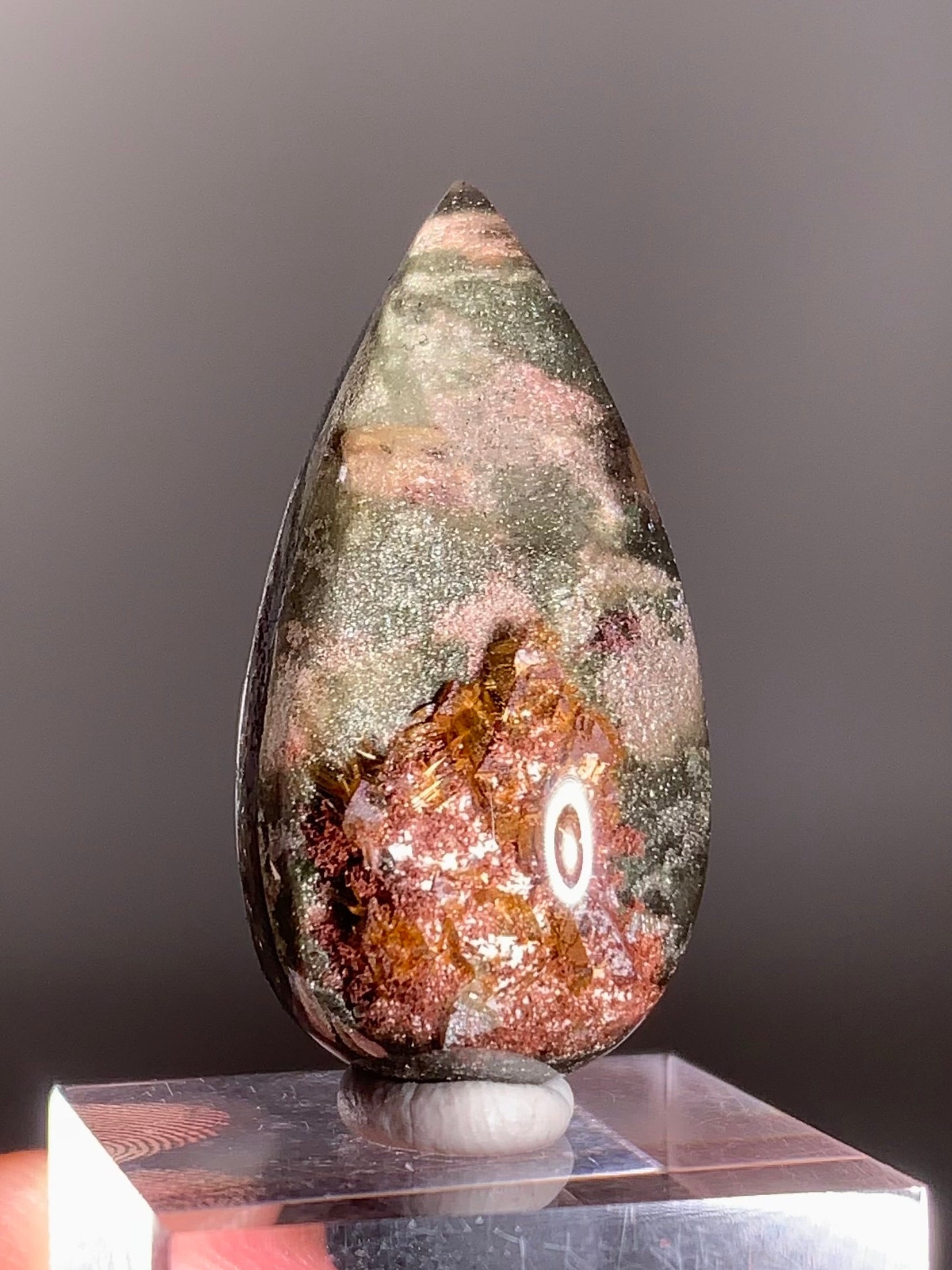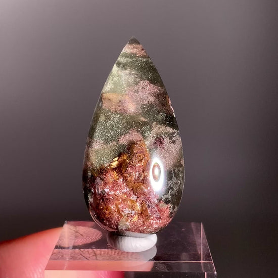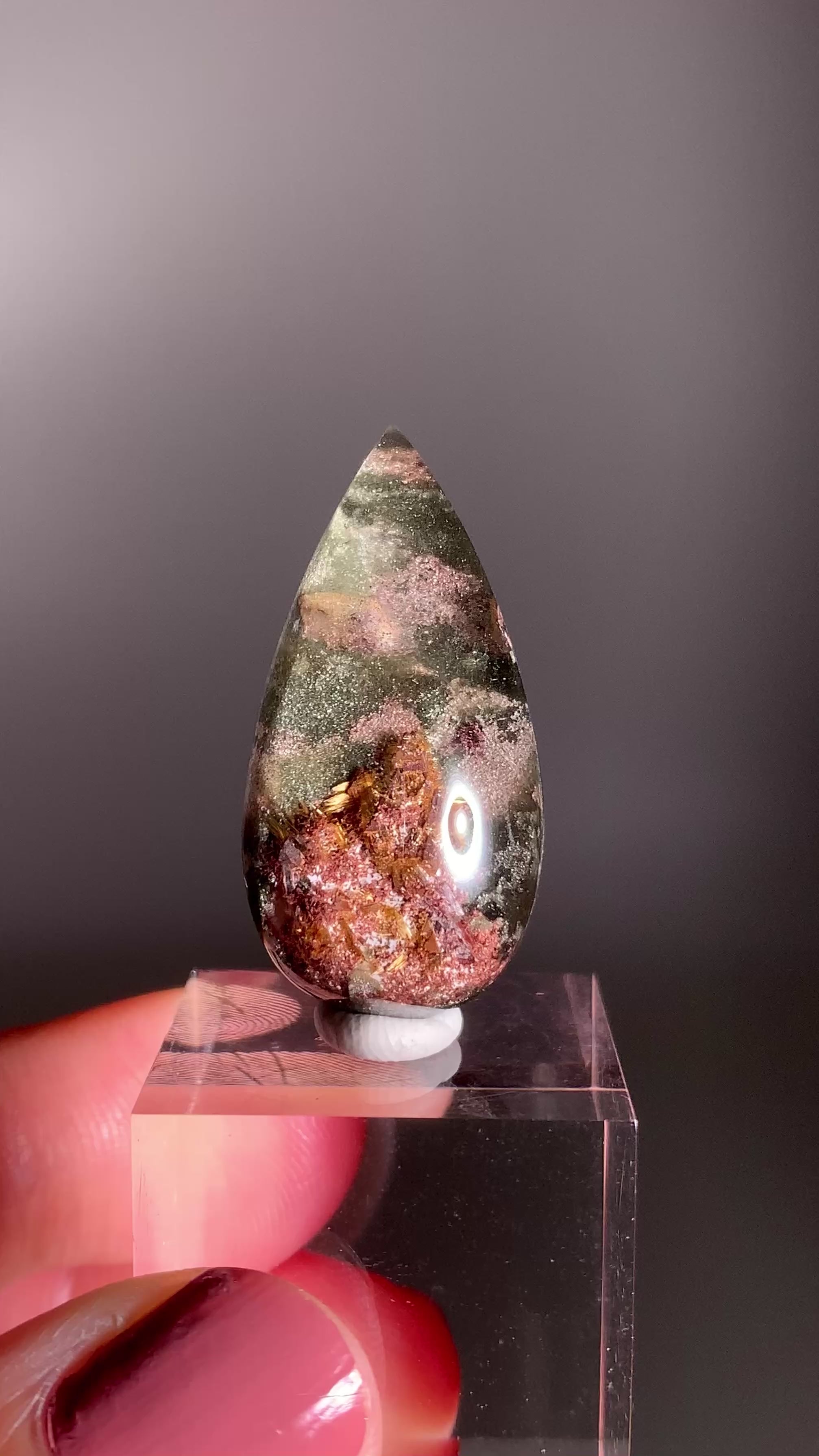 Collector’s Piece Shimmery Green & Pink Garden Quartz with Shiny Gold Mica & Rutile Polished Teardrop – Rare Crystal from Brazil