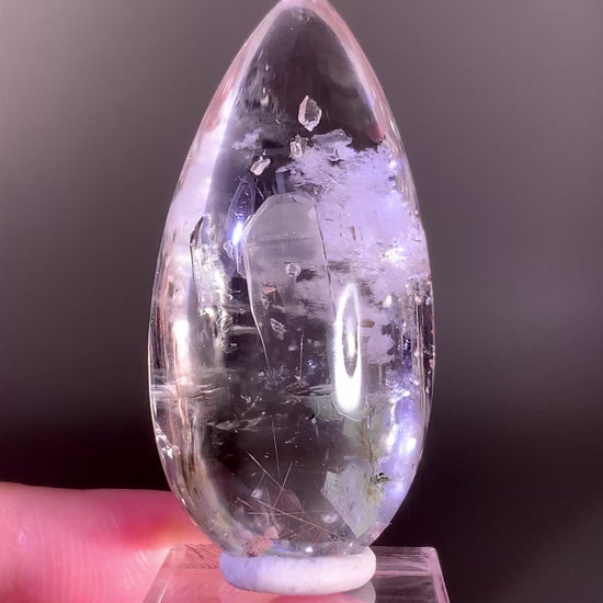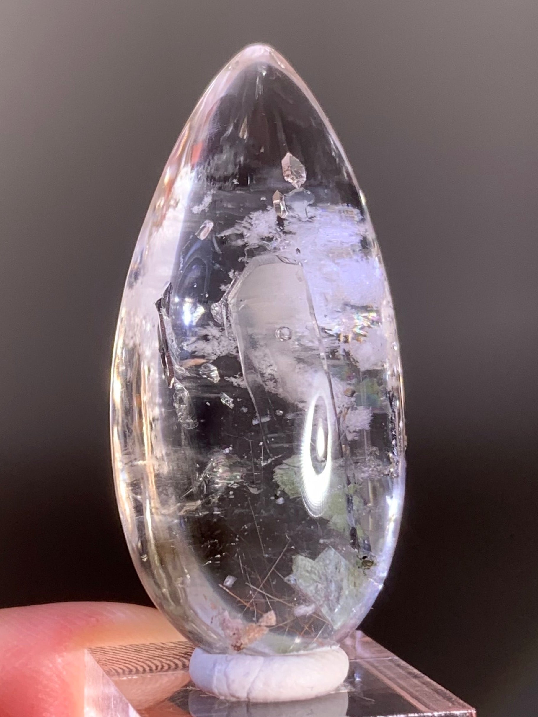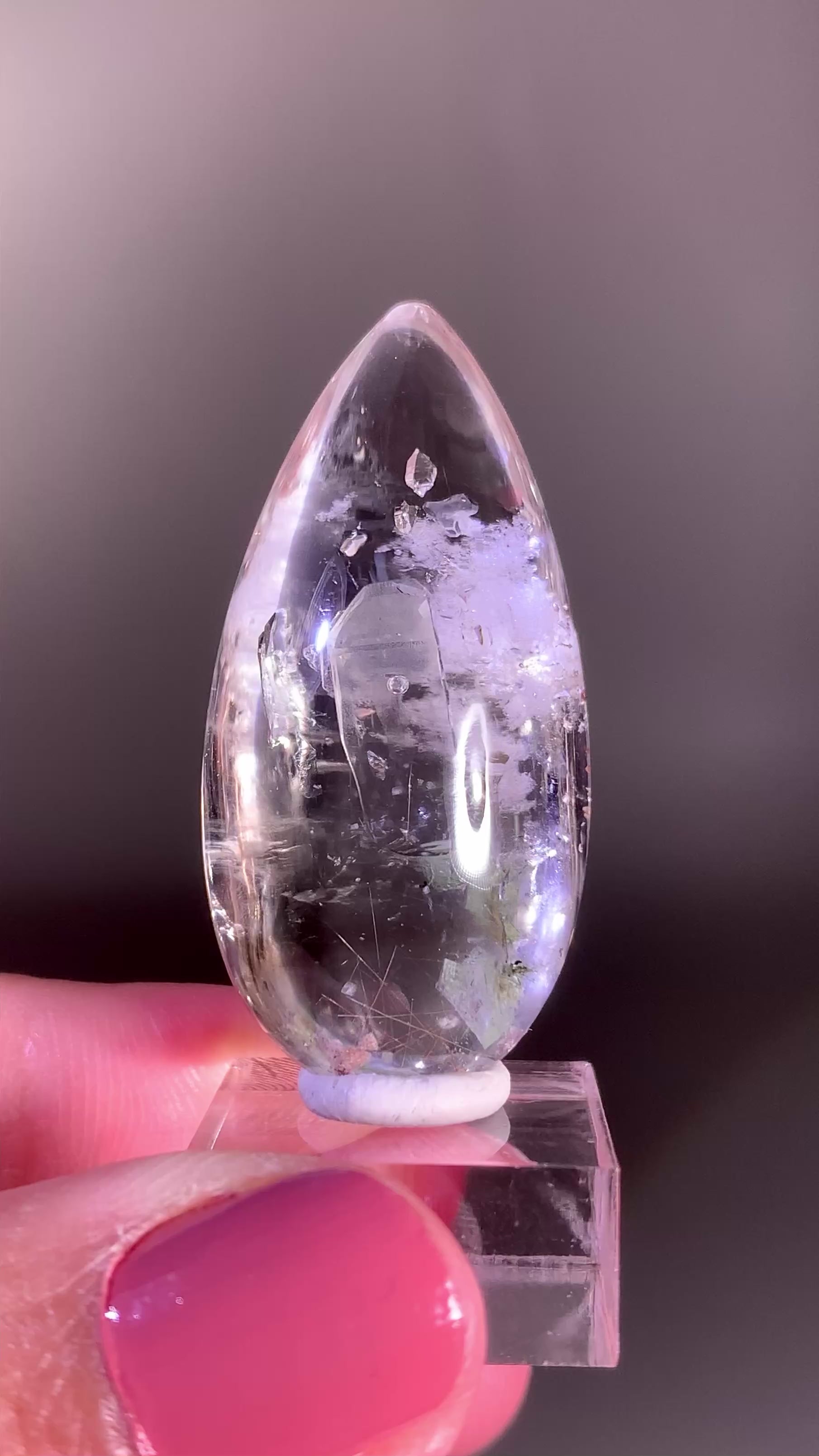 A top-grade collector’s teardrop packed with exceptional inclusions—enhydro bubble, calcite, manifestation crystal, negative quartz, epidote, rutile, and additional calcite formations all in one piece. Its diverse internal landscape, clarity, and natural complexity make it an extraordinarily rare and highly sought-after specimen for advanced collectors.
