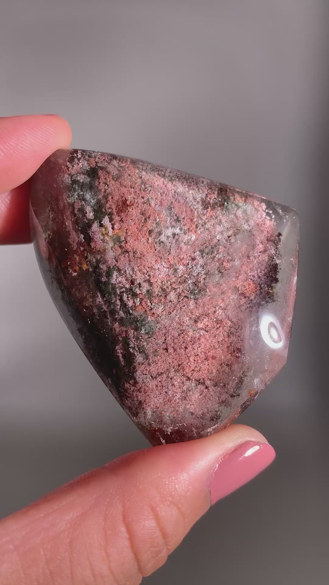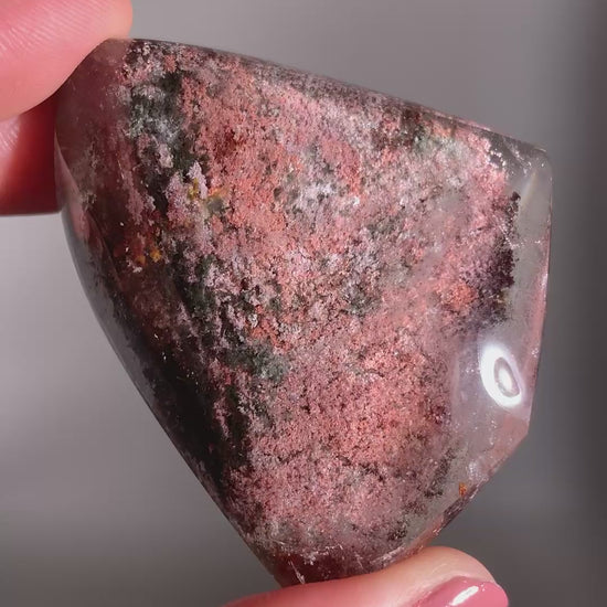 A beautifully polished Garden Quartz freeform from Brazil, featuring vibrant mineral inclusions in a range of colors such as pink, red, peach, purple and green, These natural patterns create a dreamy, landscape-like interior, resembling a miniature garden captured in clear quartz.