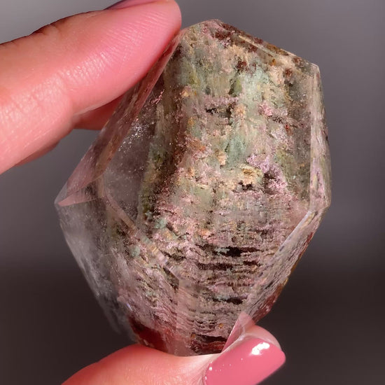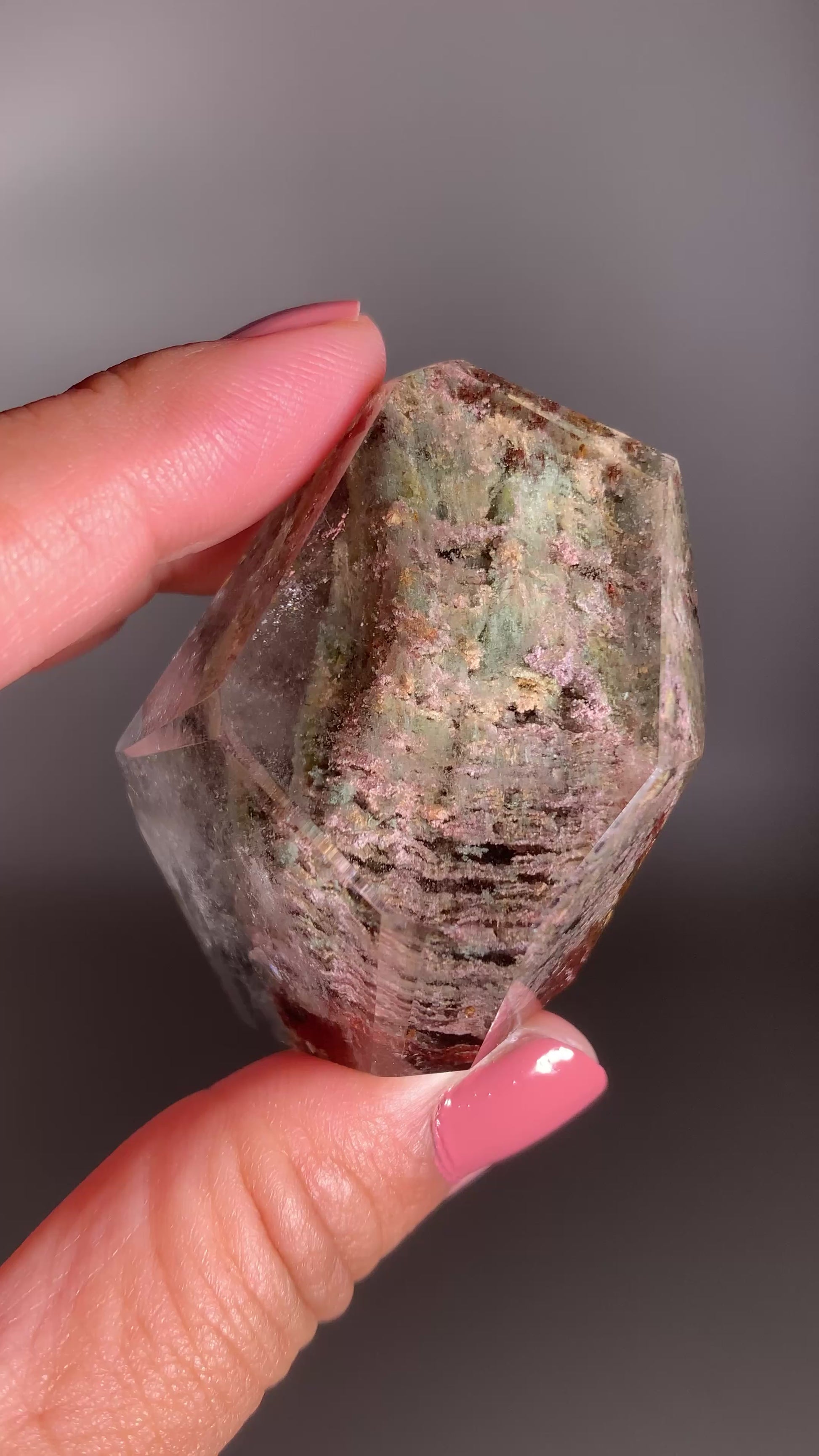 Colorful layered Garden Quartz polished freeform from Zambia, showcasing vibrant natural landscapes within clear quartz. A unique and collectible crystal piece.