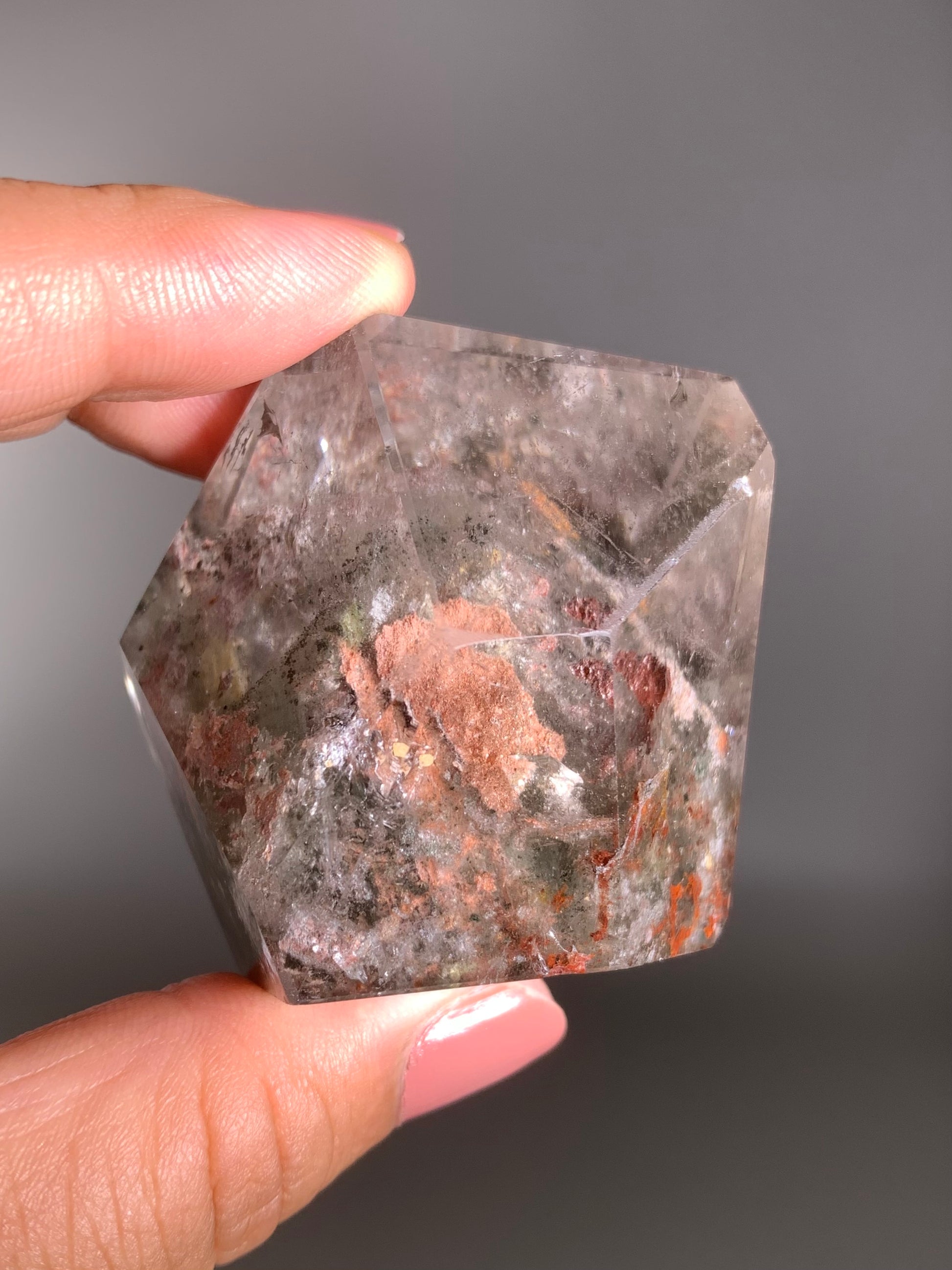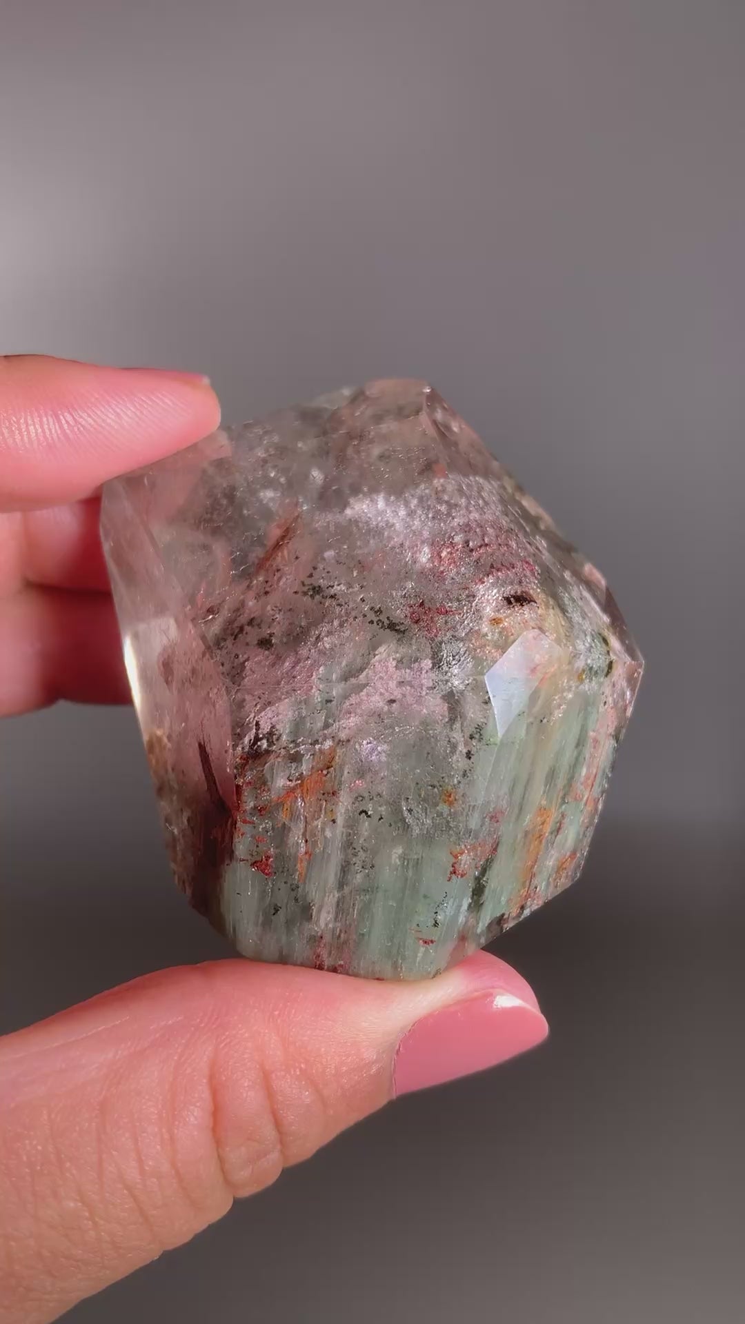 This polished Garden Quartz freeform from Zambia showcases vibrant pink, peach, red, and green inclusions with a touch of frosty texture, resembling a blooming spring landscape—full of color, warmth, and natural beauty. A bright, uplifting addition to any collection.
