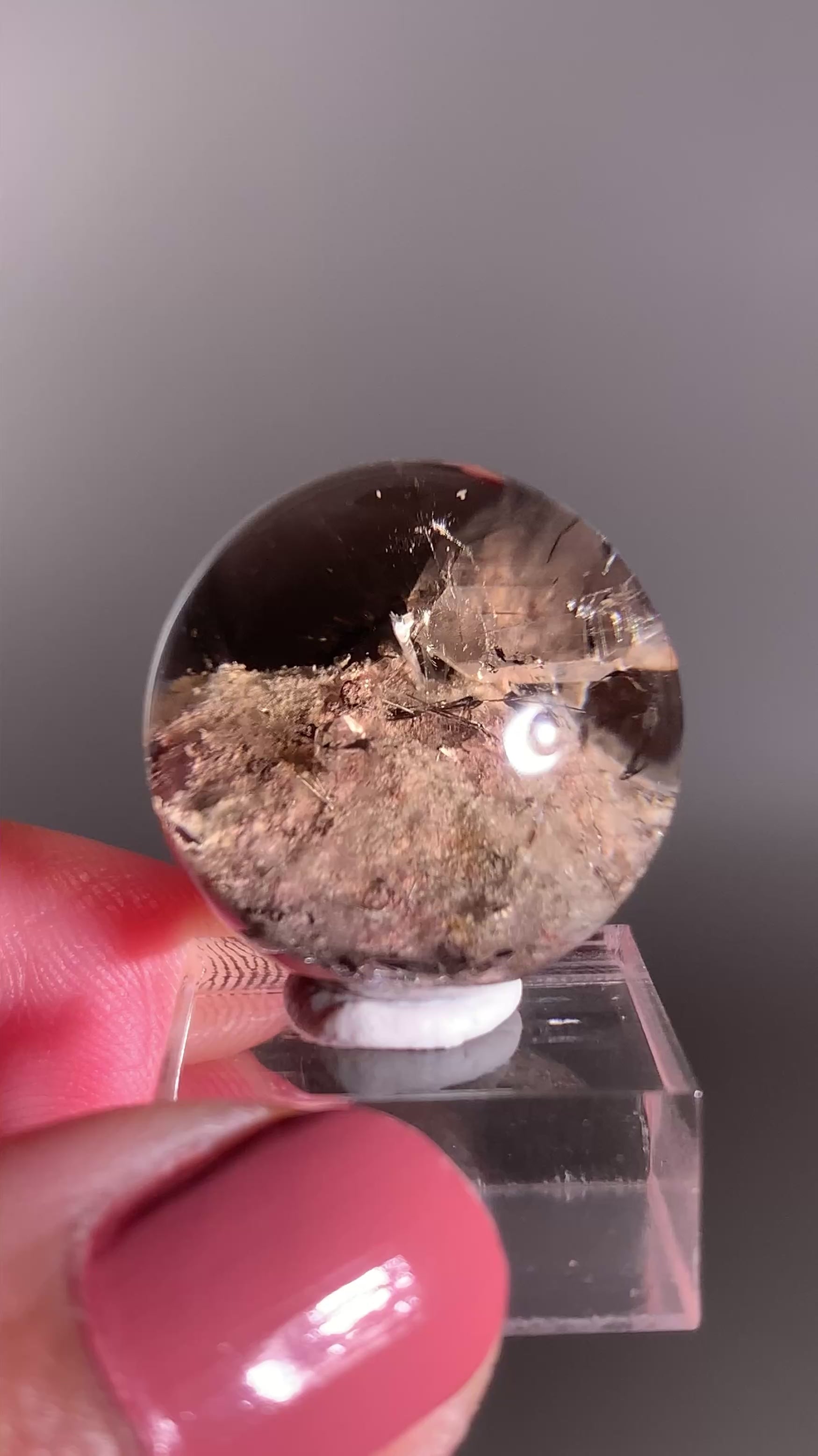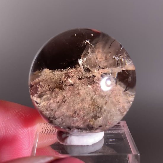 A stunning smoky quartz sphere featuring cream and pink garden inclusions, shimmering rutile needles, and rare manifestation (crystal within crystal). The intricate internal formations and vibrant colors create depth and uniqueness, making it a truly captivating collector’s piece.