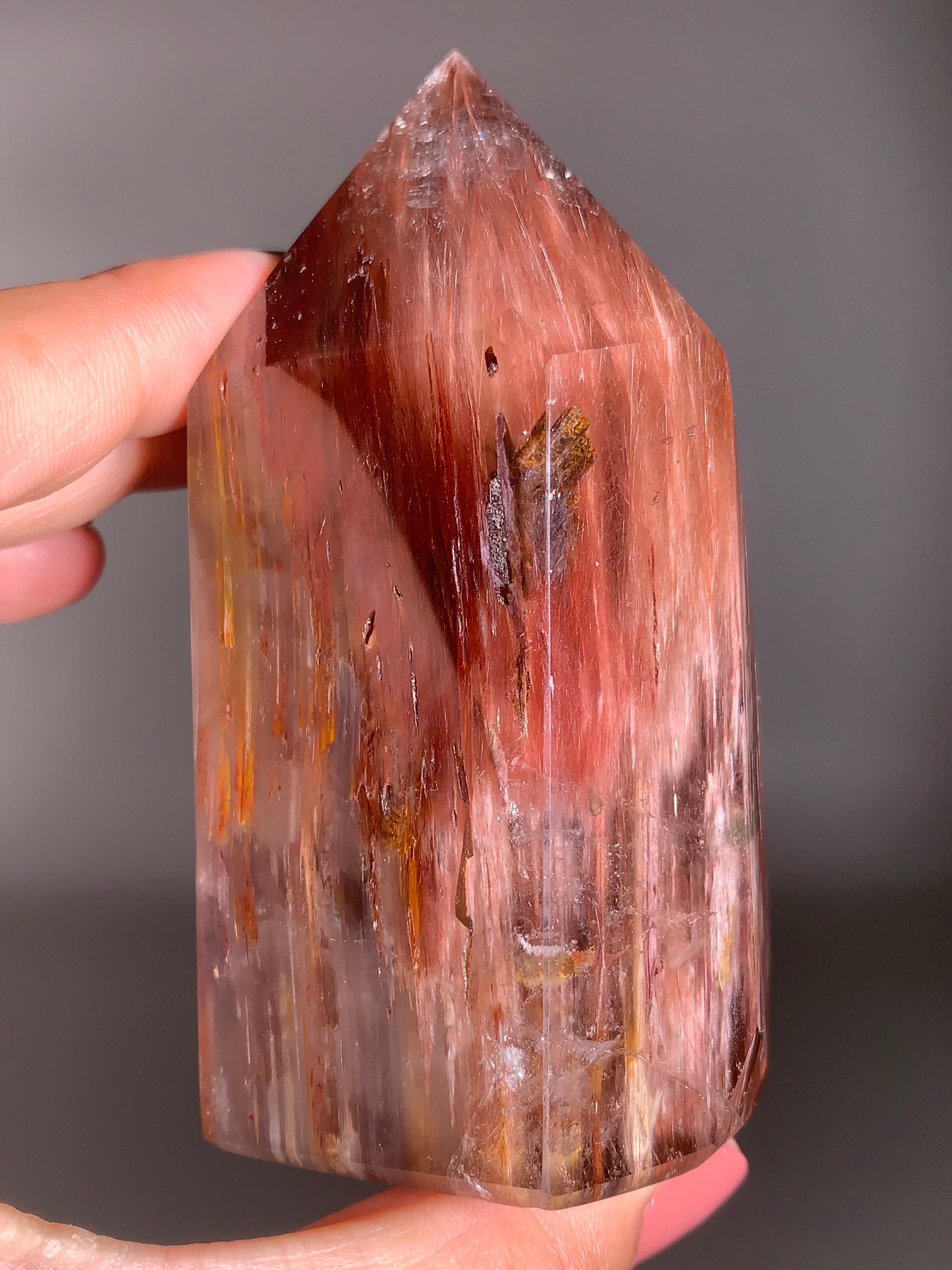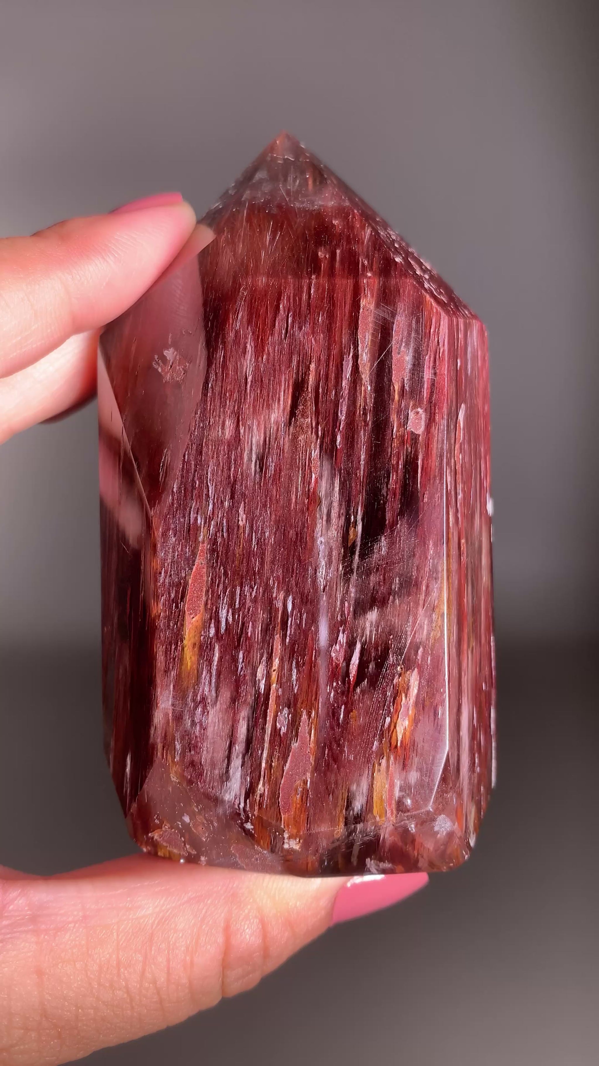 This large Dark Raspberry Pink Amphibole Tower displays deep, rich hues with soft white veils and intricate internal formations that glow beautifully under the light. Hand-polished and ethically sourced from Brazil, this crystal radiates both beauty and high vibrational energy.