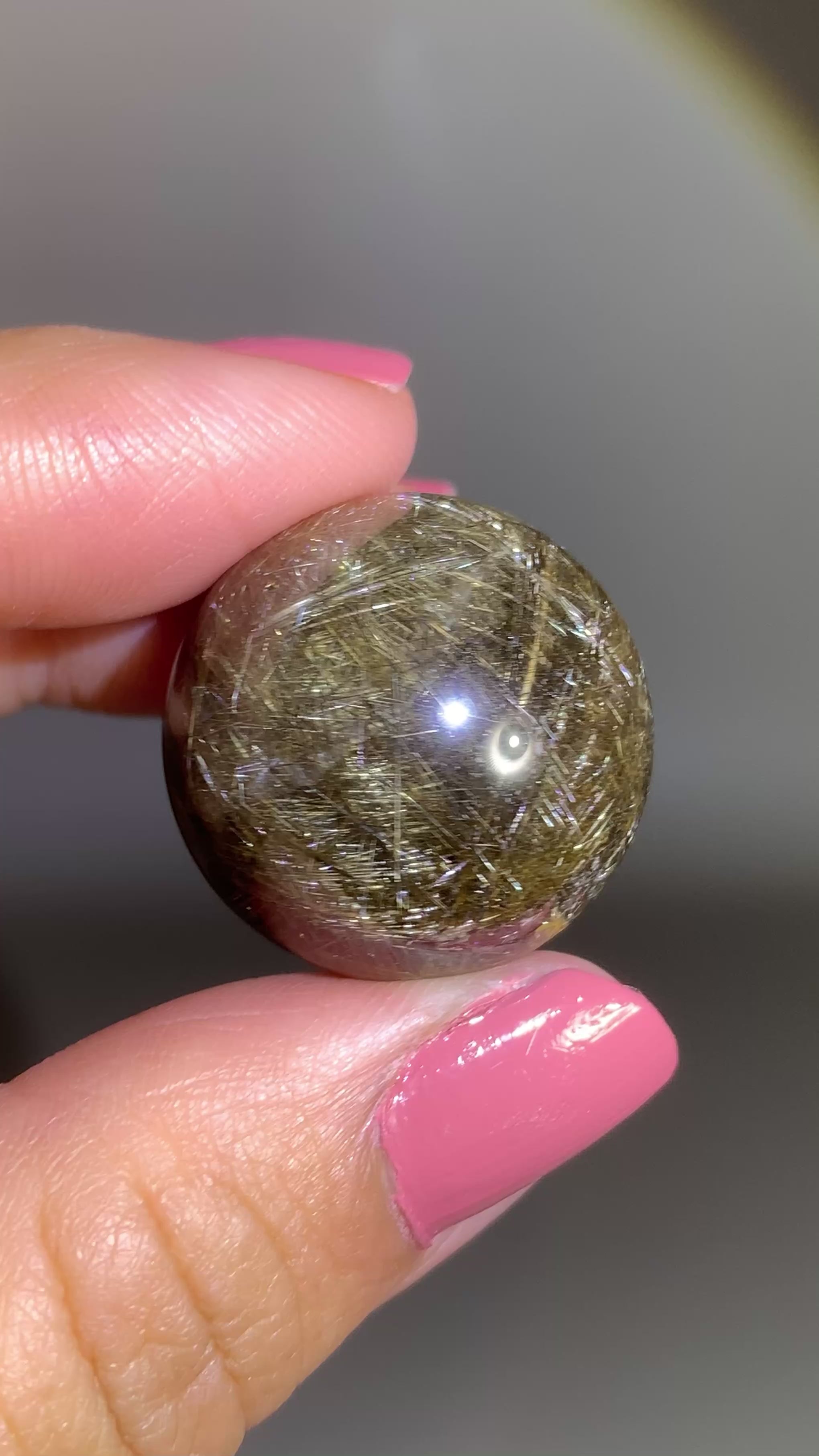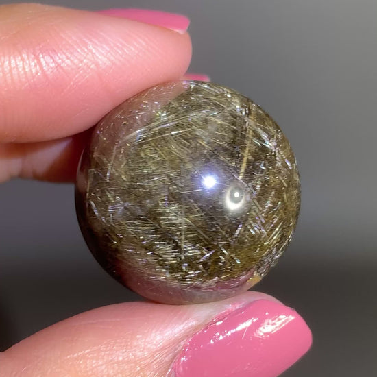 Densely packed gold and silver shooting star & lattice rutile quartz sphere from Brazil. Rare collector crystal with shimmering metallic rutile inclusions. One-of-a-kind natural piece.