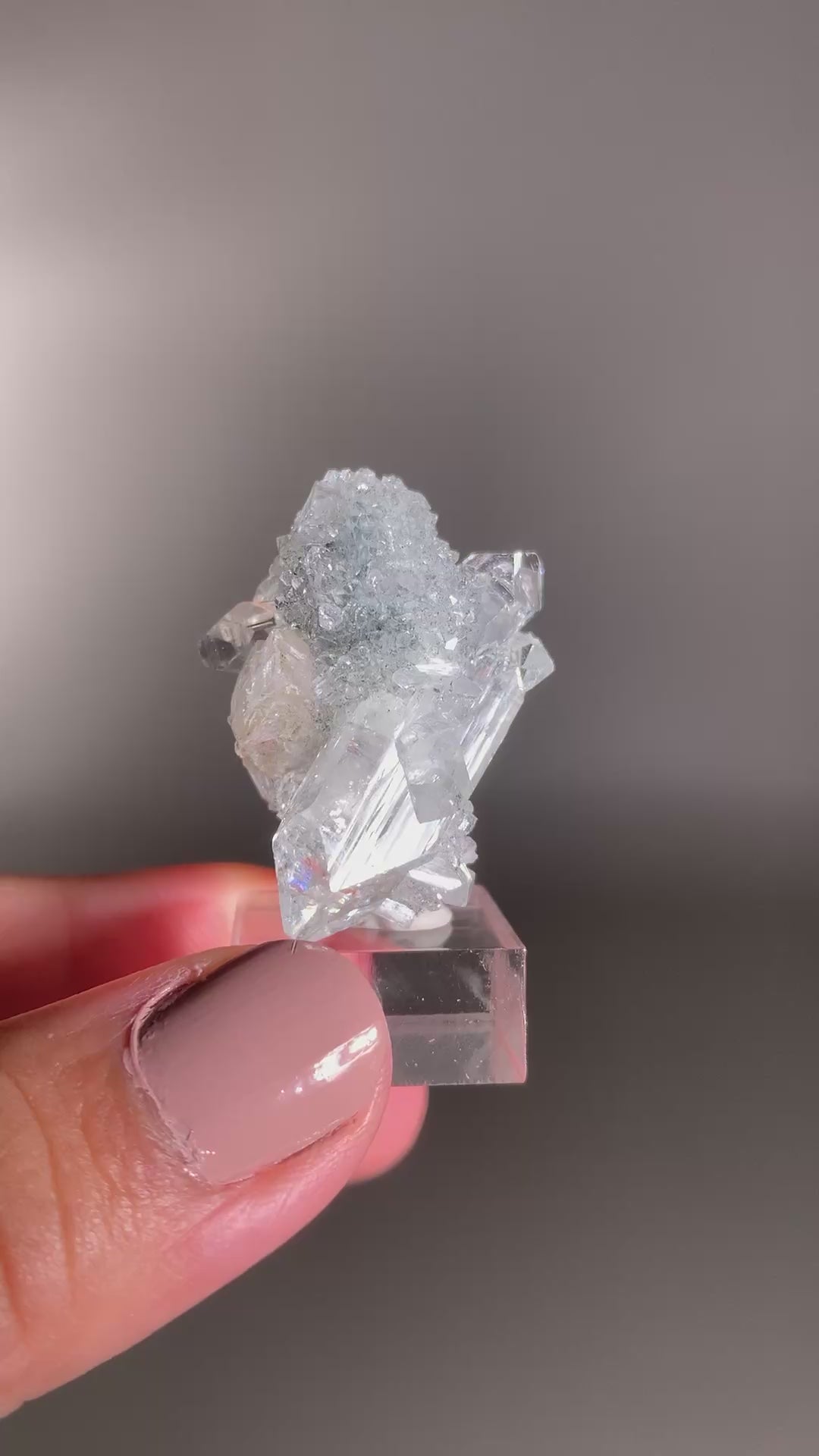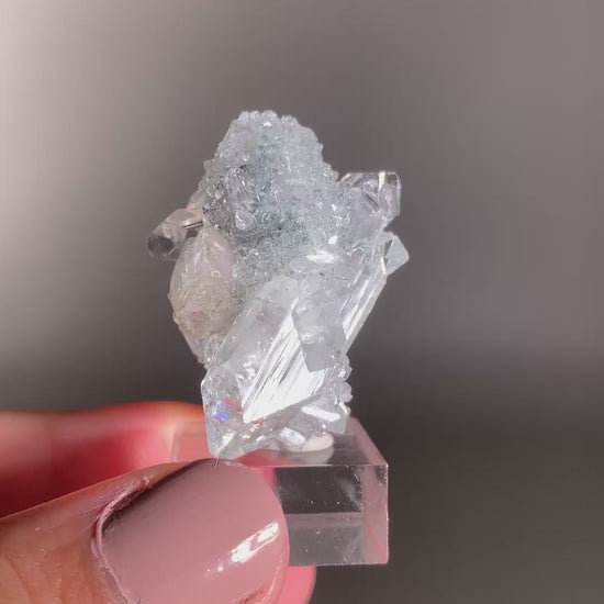 This specimen showcases brilliant Diamond Apophyllite crystals alongside sparkling Blue Chalcedony, forming a radiant and harmonious combination. The Apophyllite features sharp, glass-like points that reflect light with dazzling clarity, while the Blue Chalcedony shimmers with a subtle, glittering surface—adding an unexpected touch of magic to its usually soft and serene character. The interplay of crisp sparkle and soothing blue creates a piece that feels both vibrant and calming—a true standout for any crystal collection or sacred space.