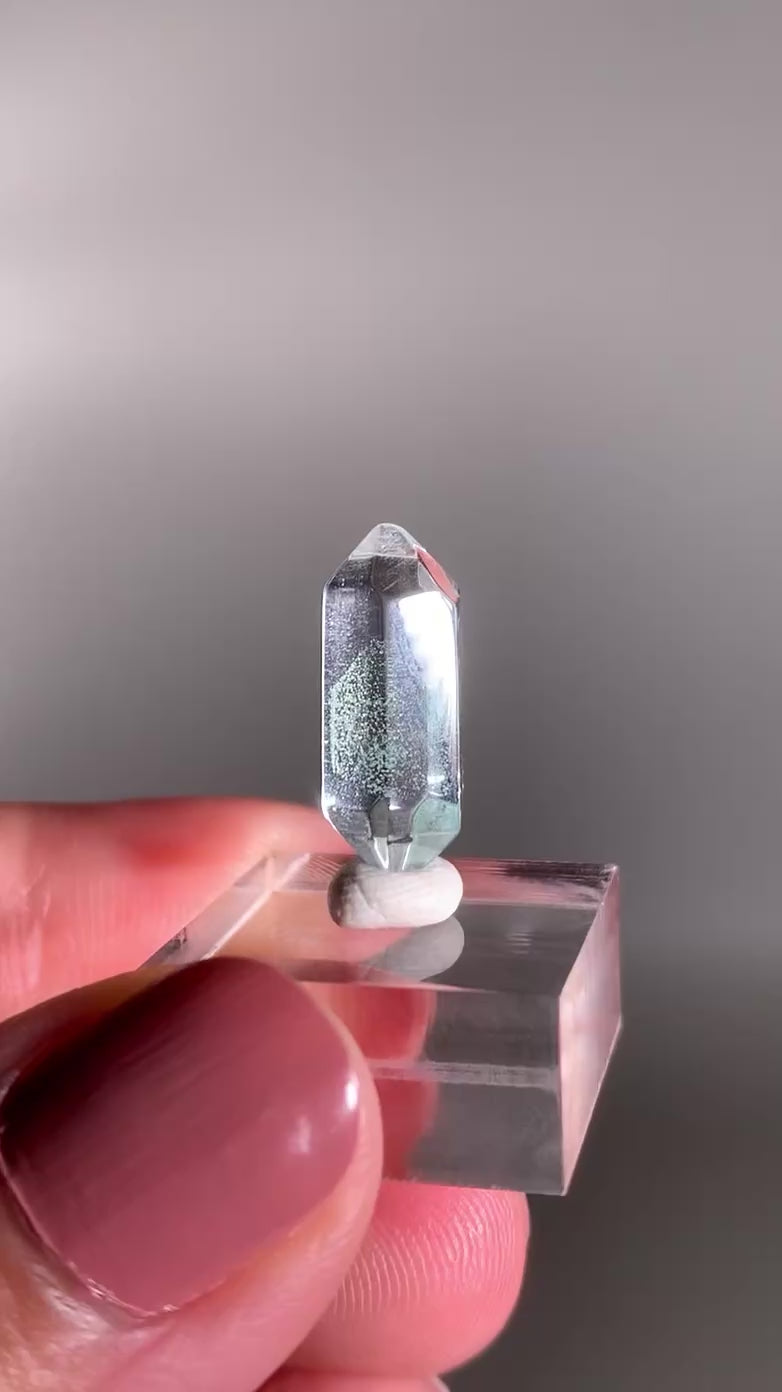 A rare and exquisite crystal, this double-terminated, polished phantom quartz from Madagascar features a unique Tiffany Blue hue—a soft, pastel aqua rarely seen in quartz. This exceptionally rare coloration is found only in select deposits from Madagascar. Natural phantom formations within the stone reveal ghost-like layers of earlier crystal growth, creating stunning visual depth. Highly sought after for both its beauty and rarity, this piece is ideal for collectors and crystal enthusiasts alike.