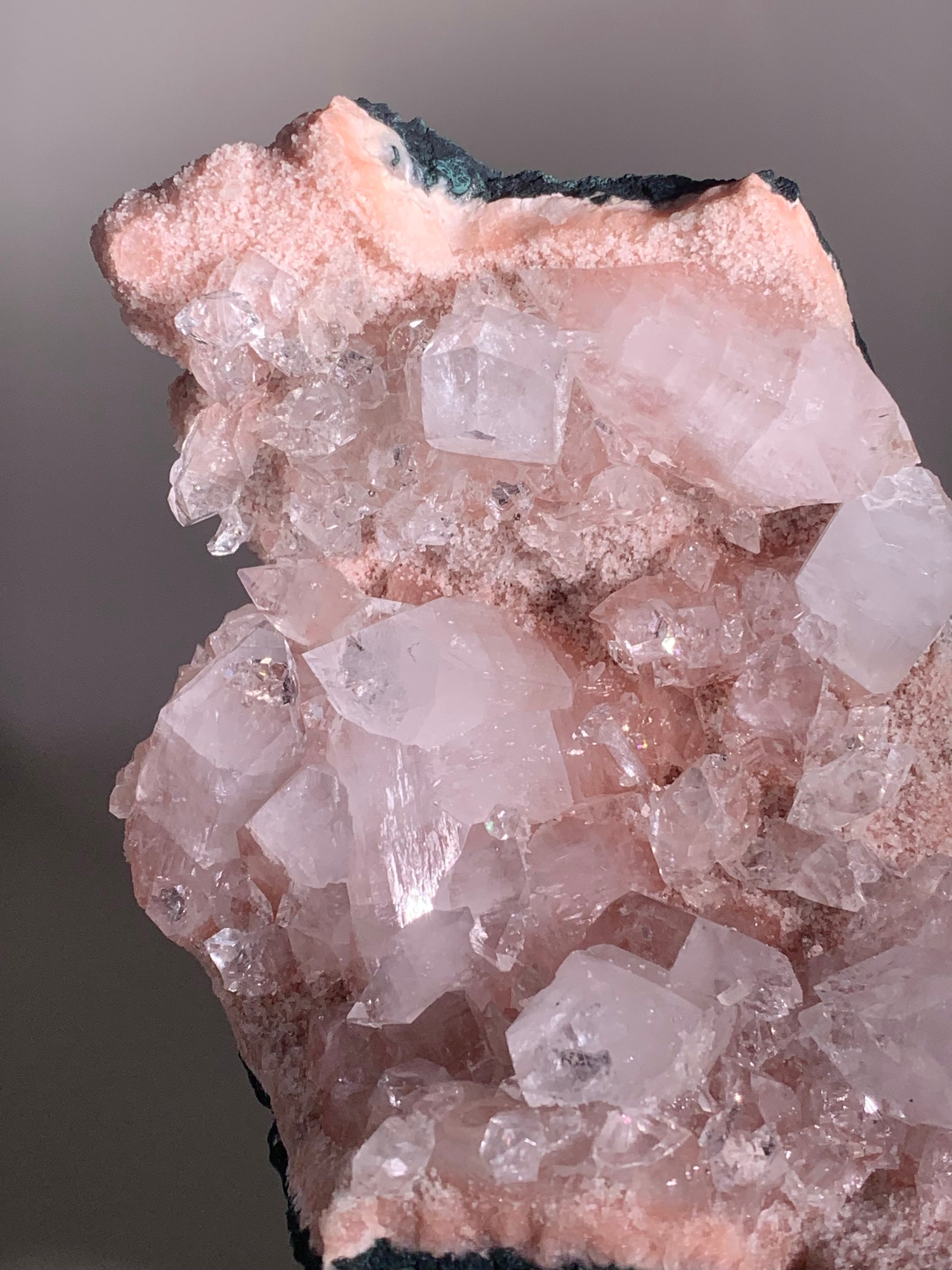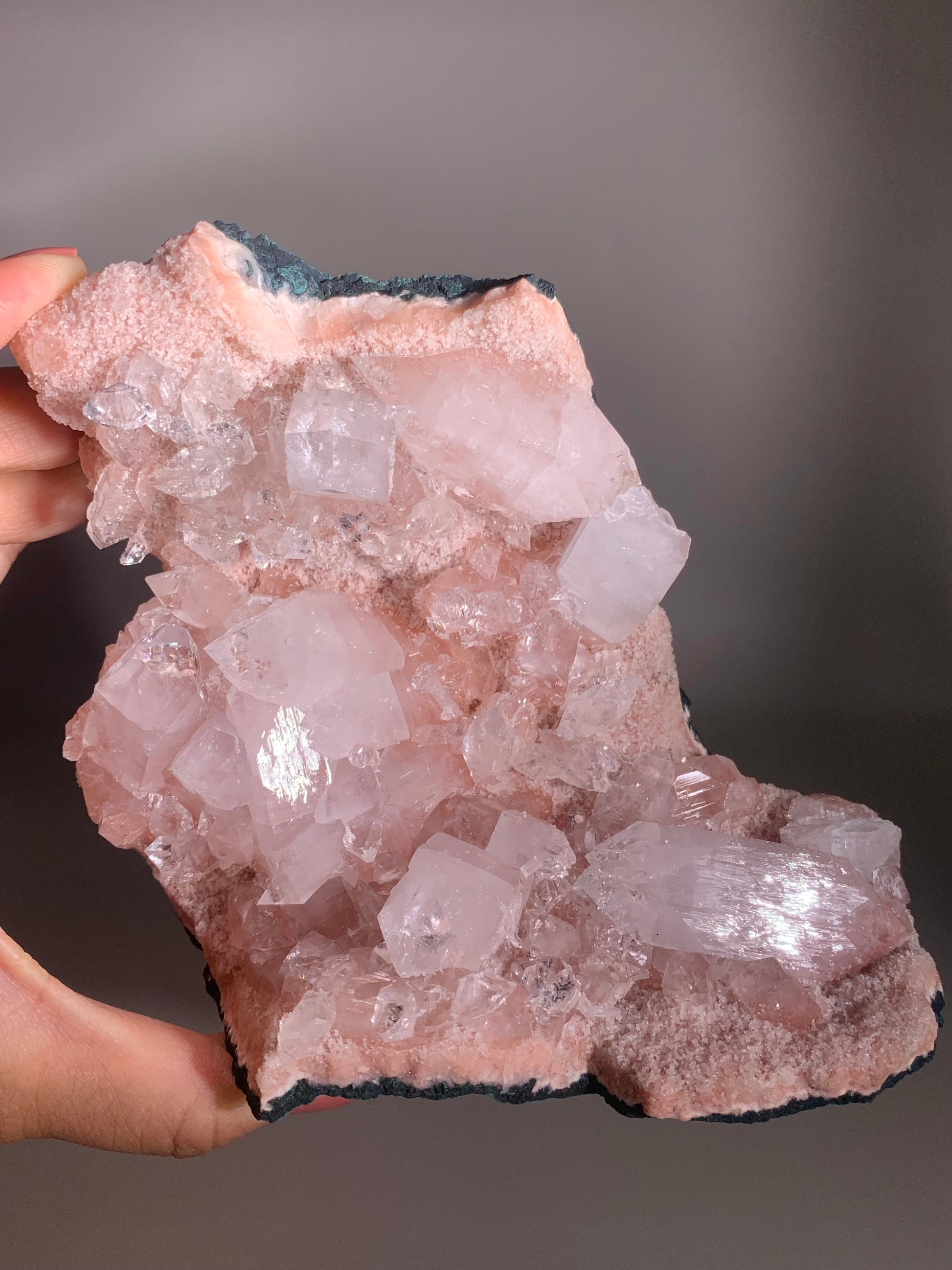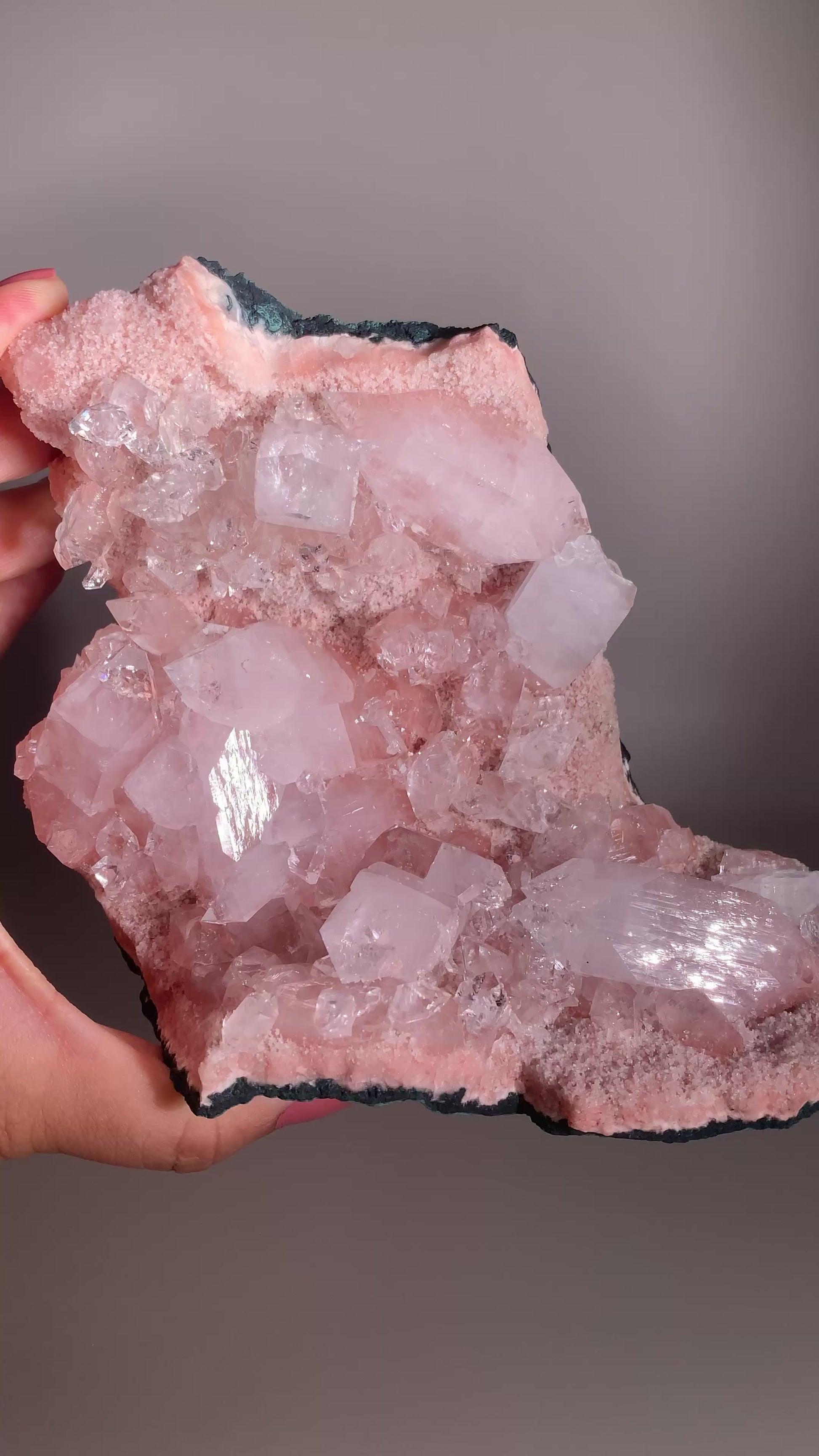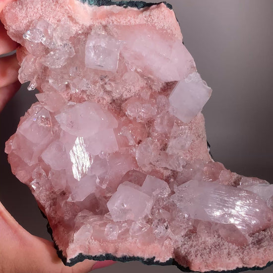 An exceptionally rare Pink Apophyllite statement piece from the Himalayas. Pink is the rarest color variety of Apophyllite, found only in limited pockets high in the mountains. This piece glows with delicate blush tones and sparkling clarity, embodying both rarity and natural beauty—a true collector’s treasure from one of the world’s most exclusive crystal sources.