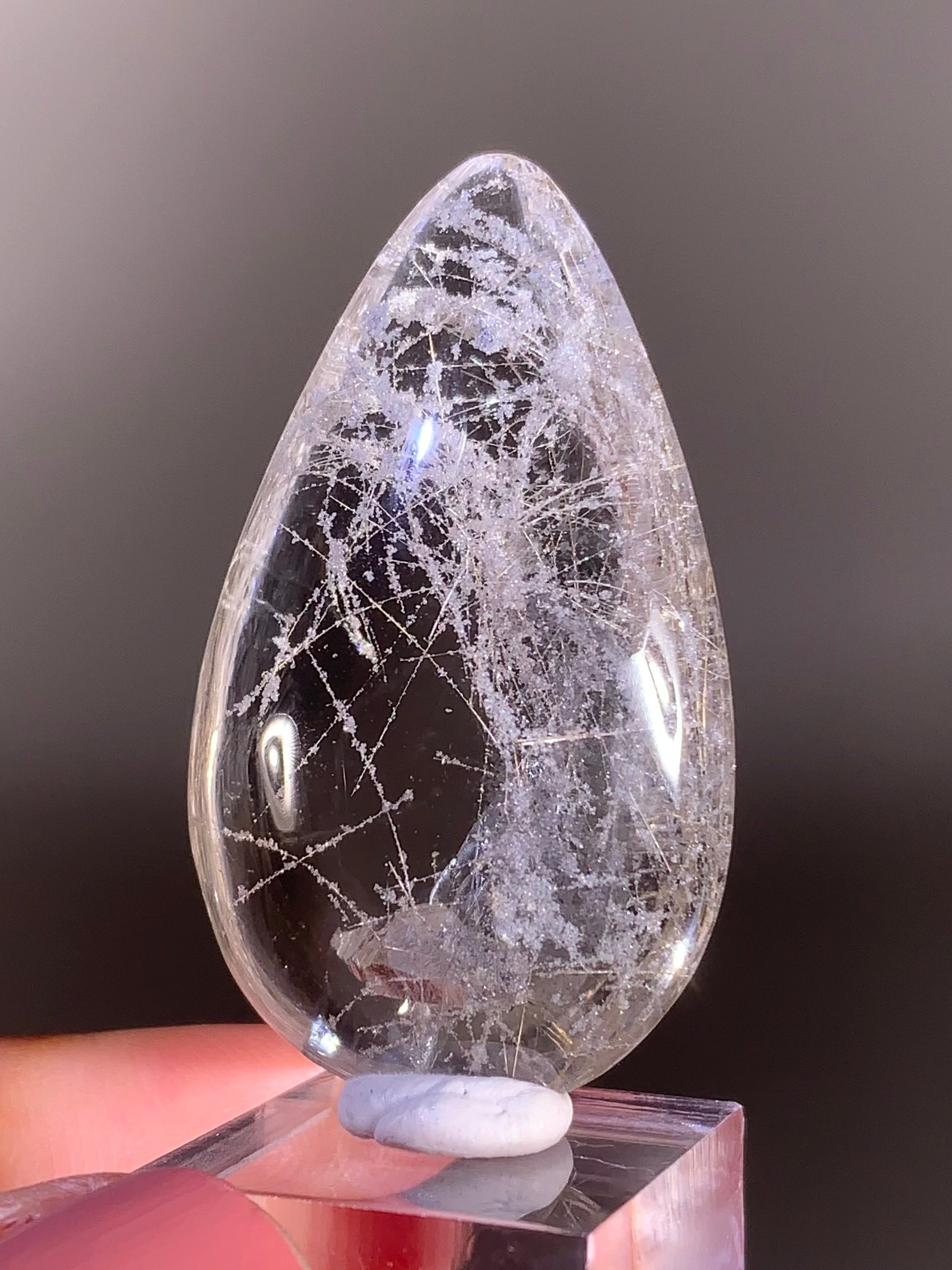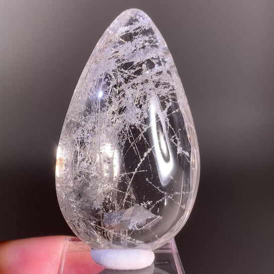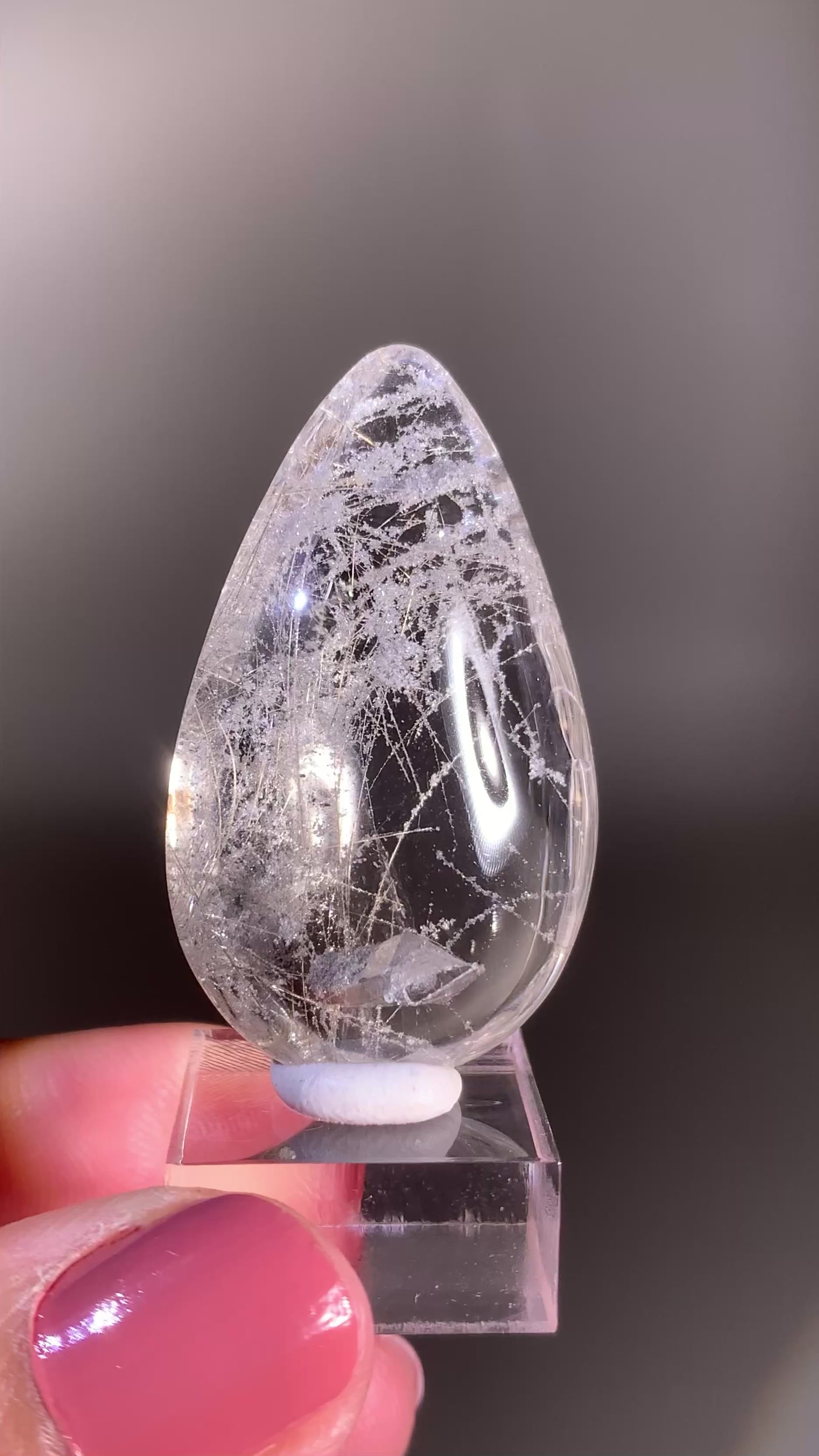 A stunning collector’s teardrop featuring shimmering silver rutile accented by a shiny white garden that appears sprinkled and delicately coated over the rutile. Inside, a rare manifestation (crystal within a crystal) adds even more depth and wonder. This extraordinary combination creates a refined, ethereal look—an extremely rare and delicate piece perfect for any high-end collection.