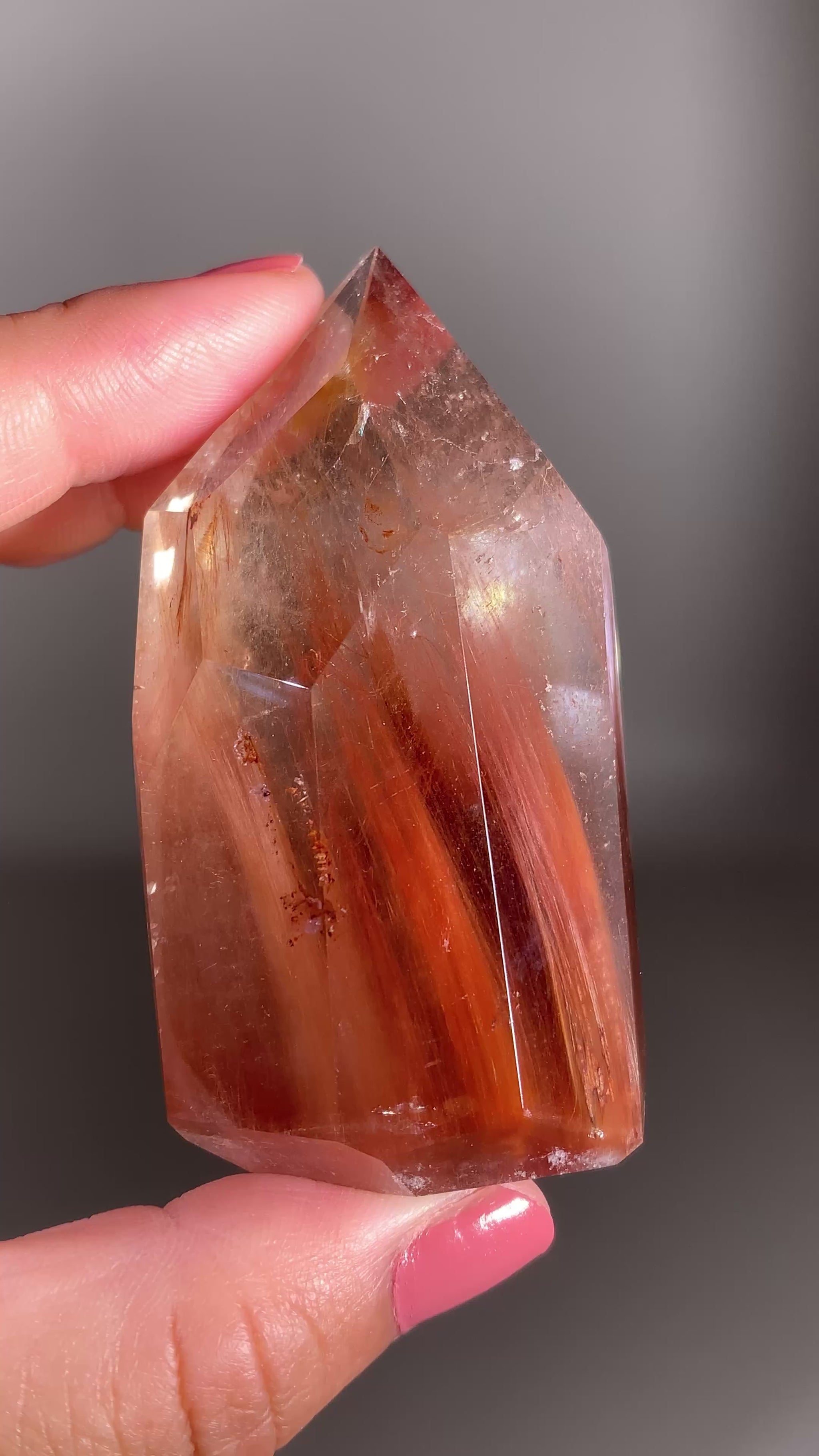 Fiery Amphibole Quartz polished tower featuring striking fiery red mineral inclusions and natural crystal depth. A unique collector specimen with bold color, elegant structure, and natural beauty.