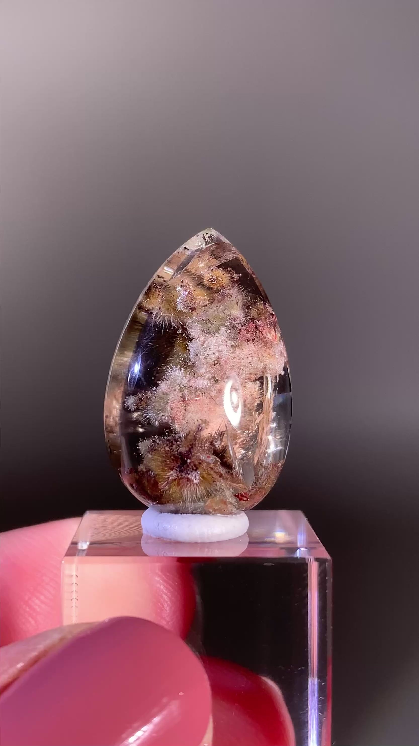A polished cabochon from Brazil featuring furry gold flower rutile set within colorful garden quartz. The delicate, hair-like rutile formations contrast beautifully with the vibrant garden inclusions, creating a dynamic and eye-catching piece perfect for collectors, jewelry, or display.