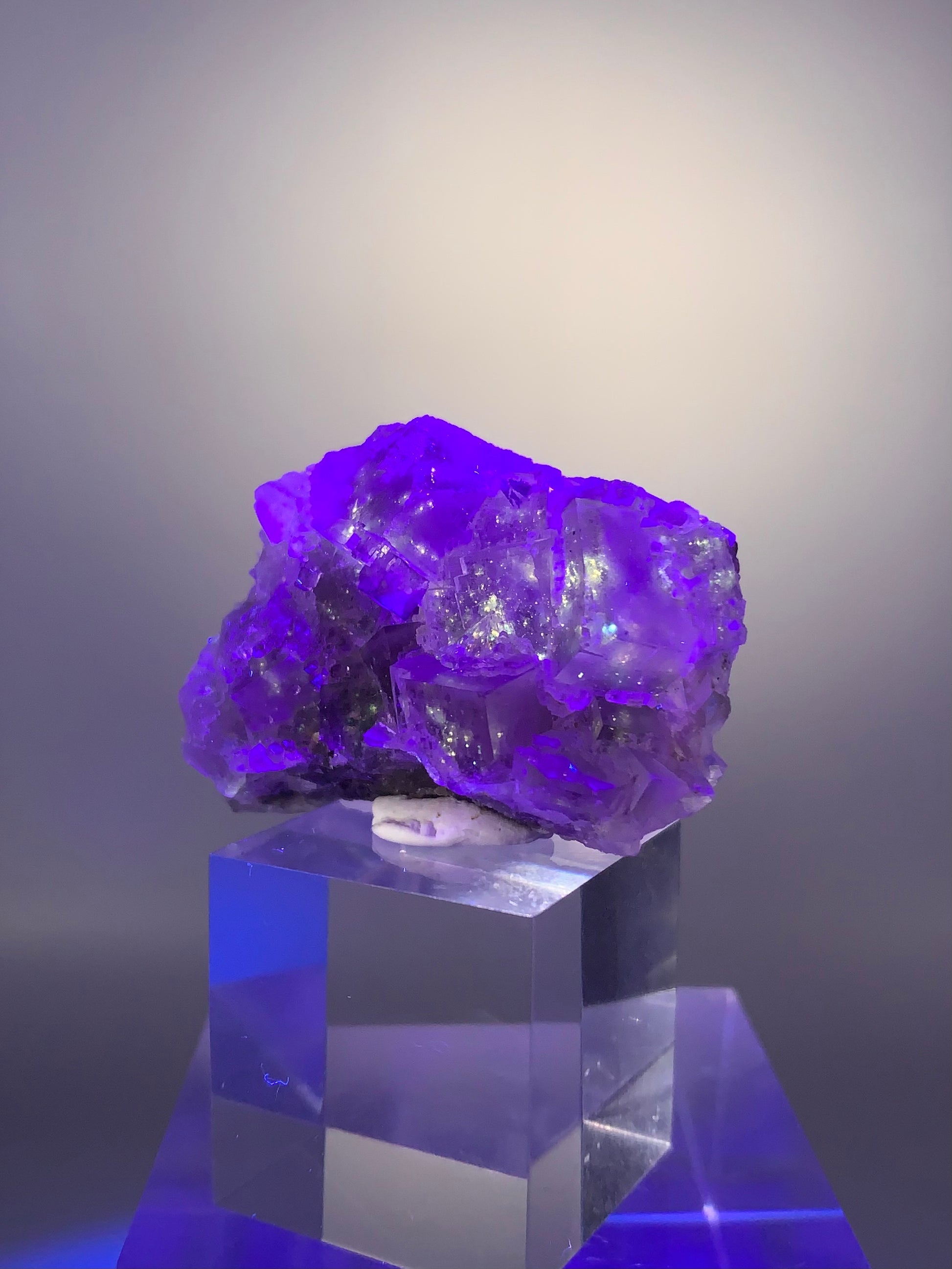 A rare and mesmerizing Galaxy Fluorite featuring vibrant color banding and natural petroleum inclusions that fluoresce under UV light — a true collector’s gem.