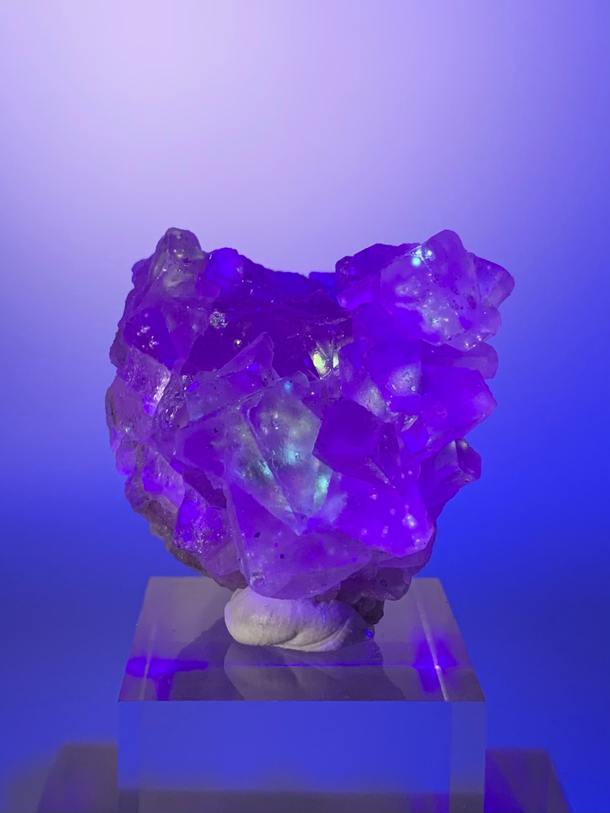 A rare and mesmerizing Galaxy Fluorite featuring vibrant color banding and natural petroleum inclusions that fluoresce under UV light — this piece also holds a rare blue light inside, adding an extra layer of mystery and beauty. A true collector’s gem.