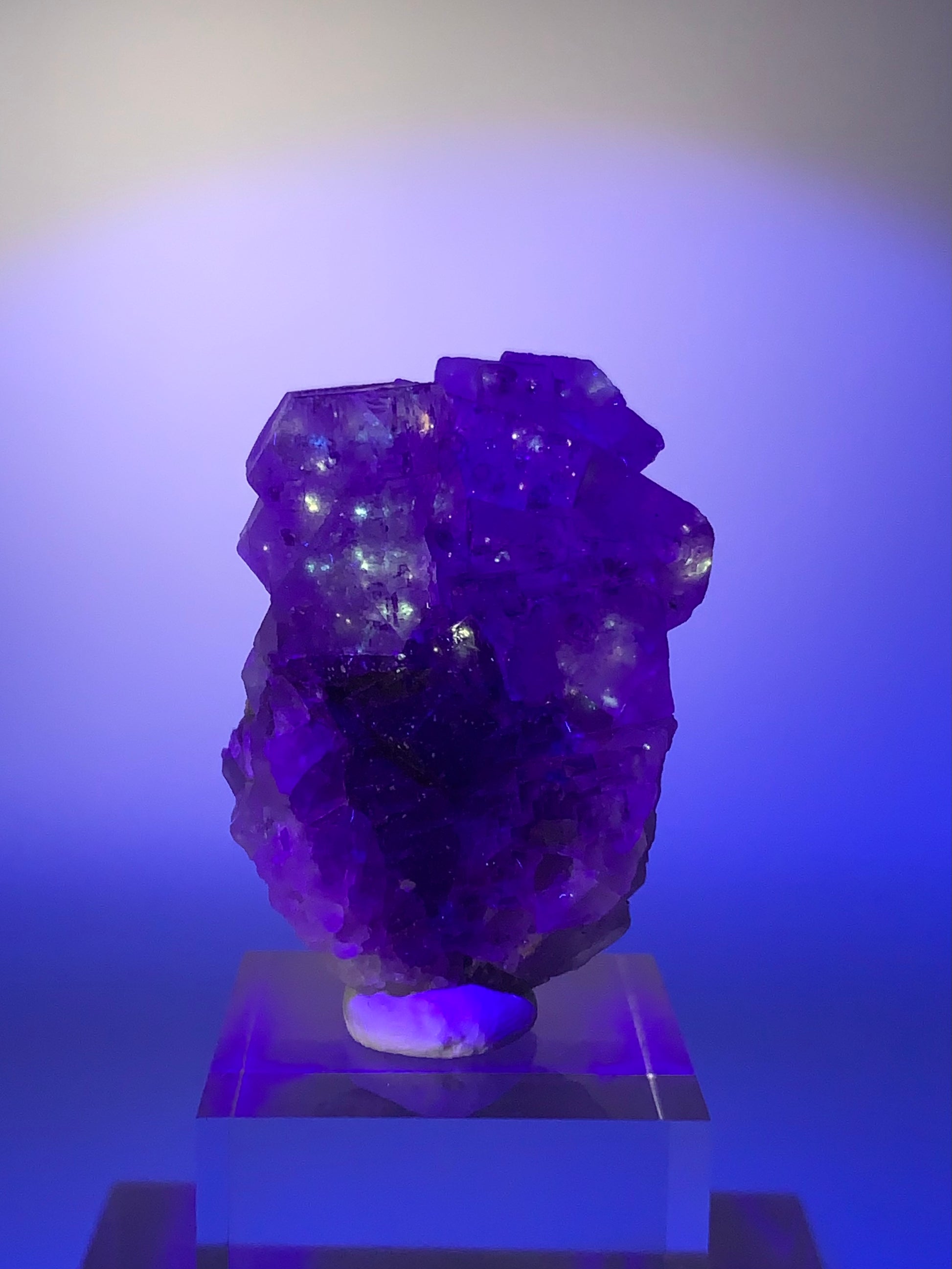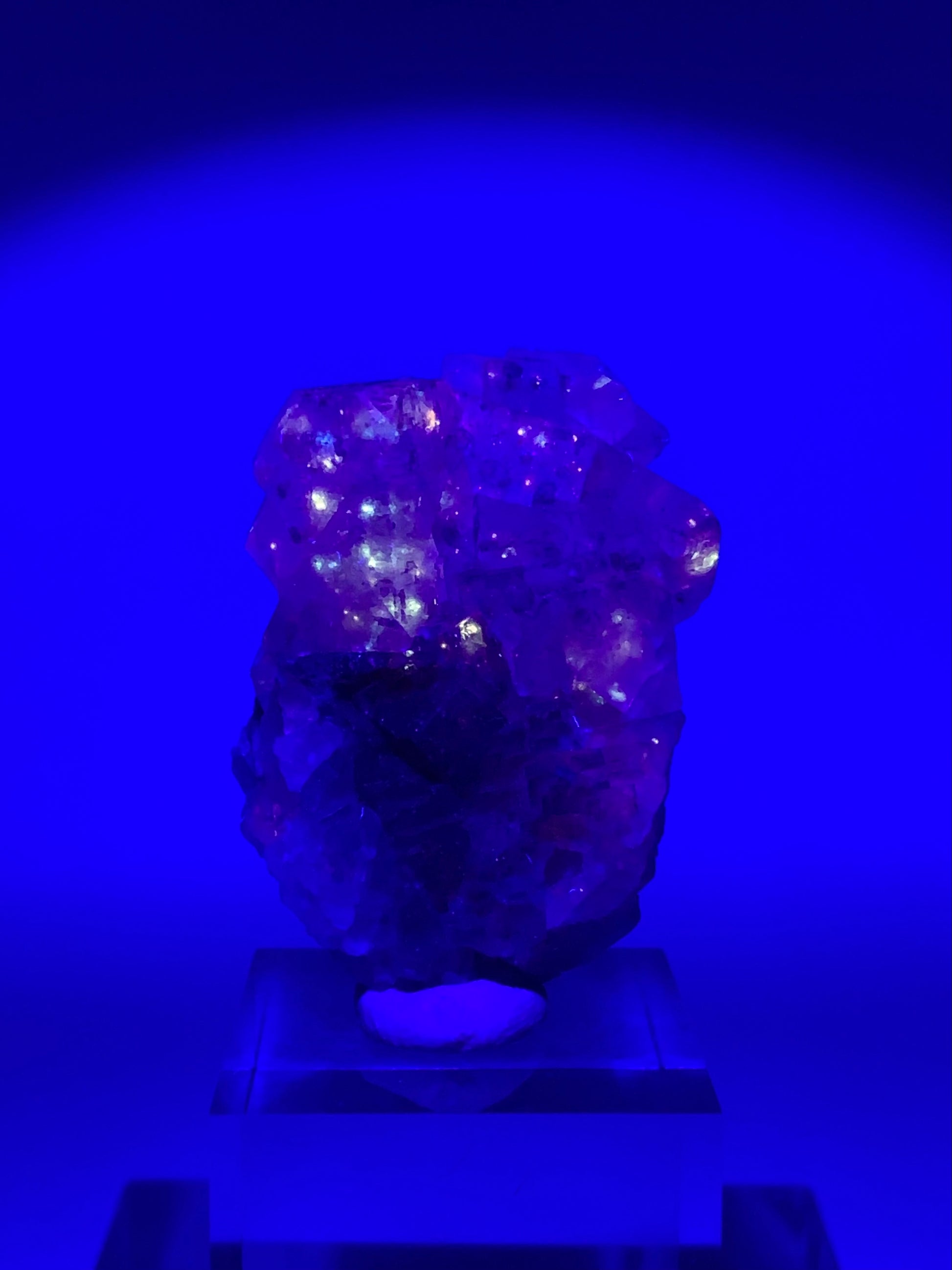 A rare and mesmerizing Galaxy Fluorite featuring vibrant color banding and natural petroleum inclusions that fluoresce under UV light — a true collector’s gem.