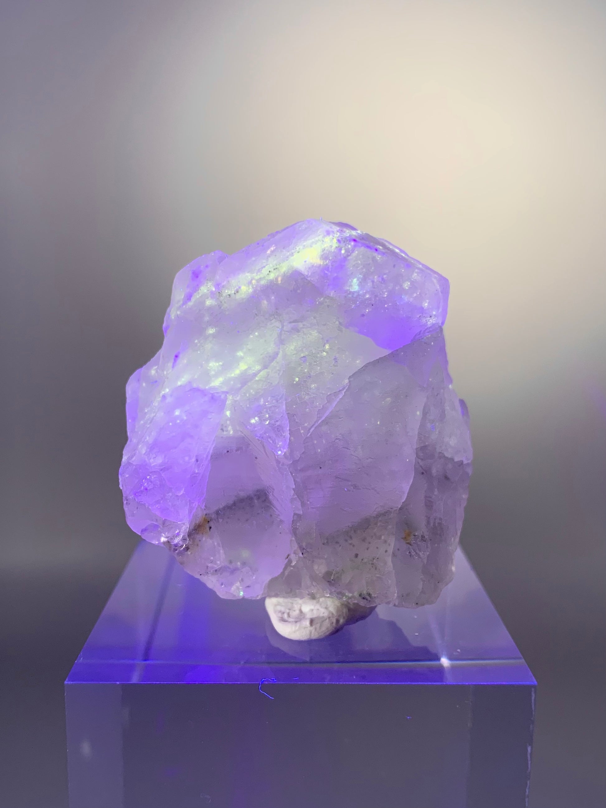 A rare and mesmerizing Galaxy Fluorite featuring vibrant color banding and natural petroleum inclusions that fluoresce under UV light — a true collector’s gem.