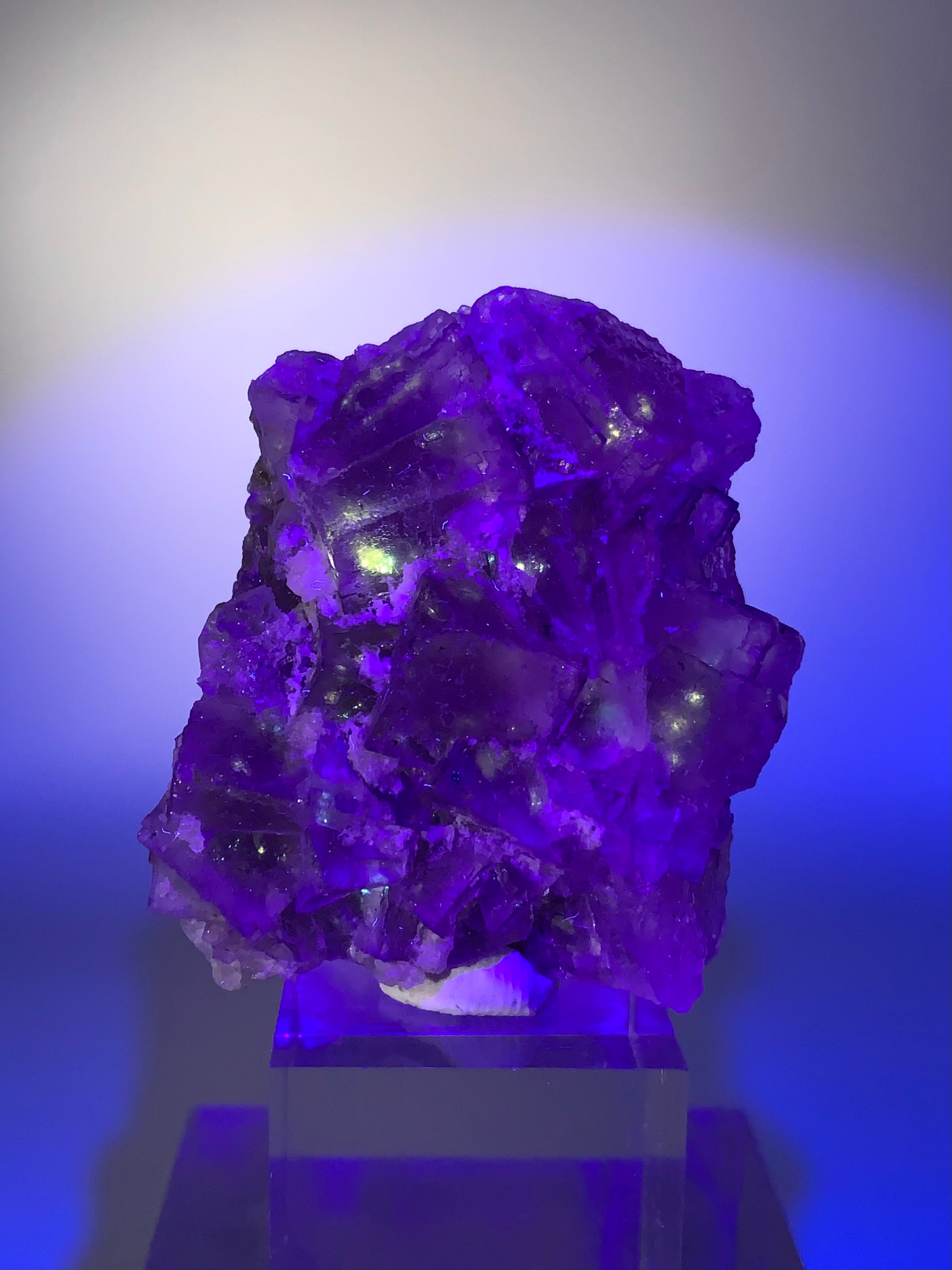 A rare and mesmerizing Galaxy Fluorite featuring vibrant color banding and natural petroleum inclusions that fluoresce under UV light — a true collector’s gem.