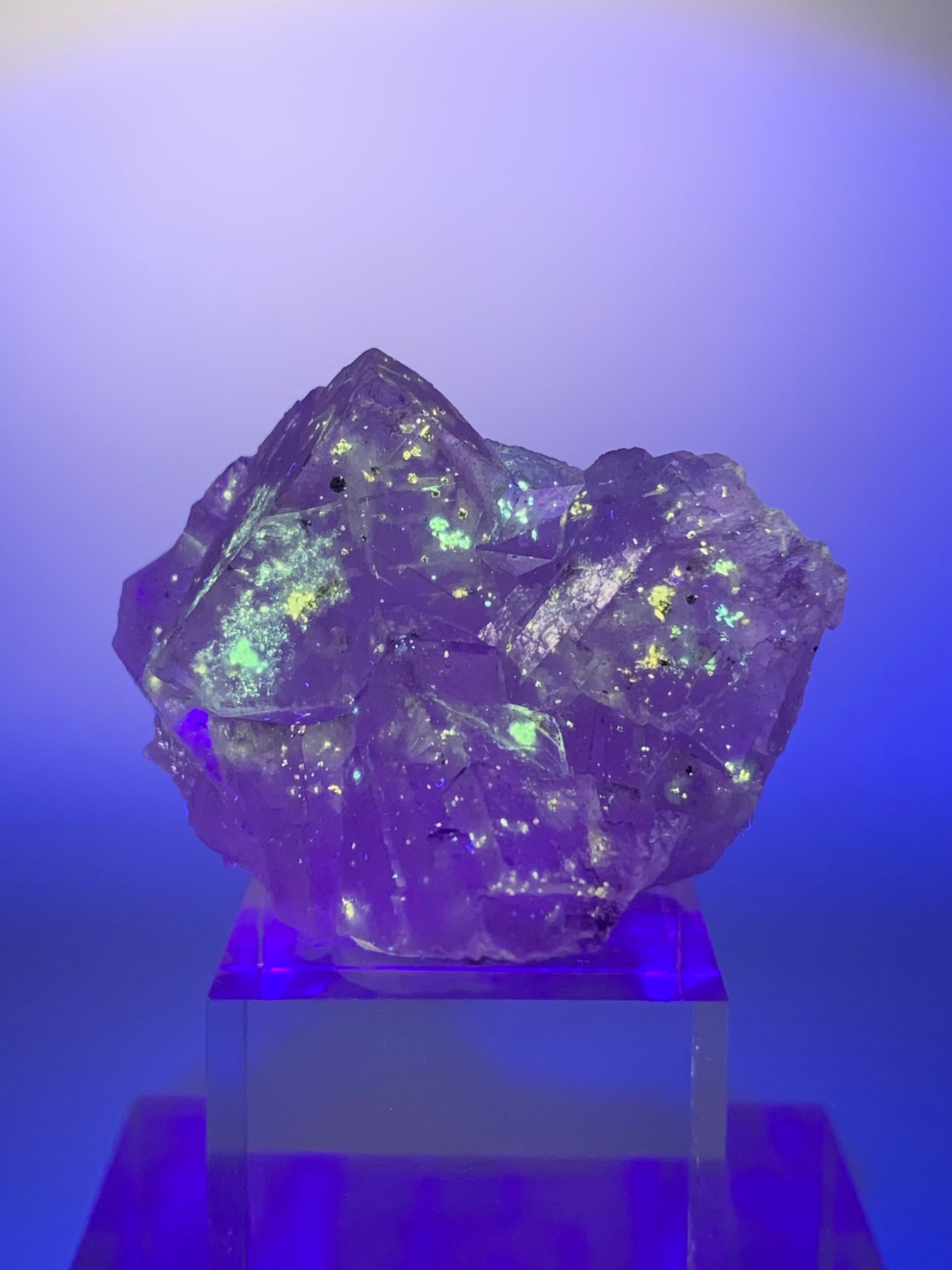 A rare and mesmerizing Galaxy Fluorite featuring vibrant color banding and natural petroleum inclusions that fluoresce under UV light — a true collector’s gem.