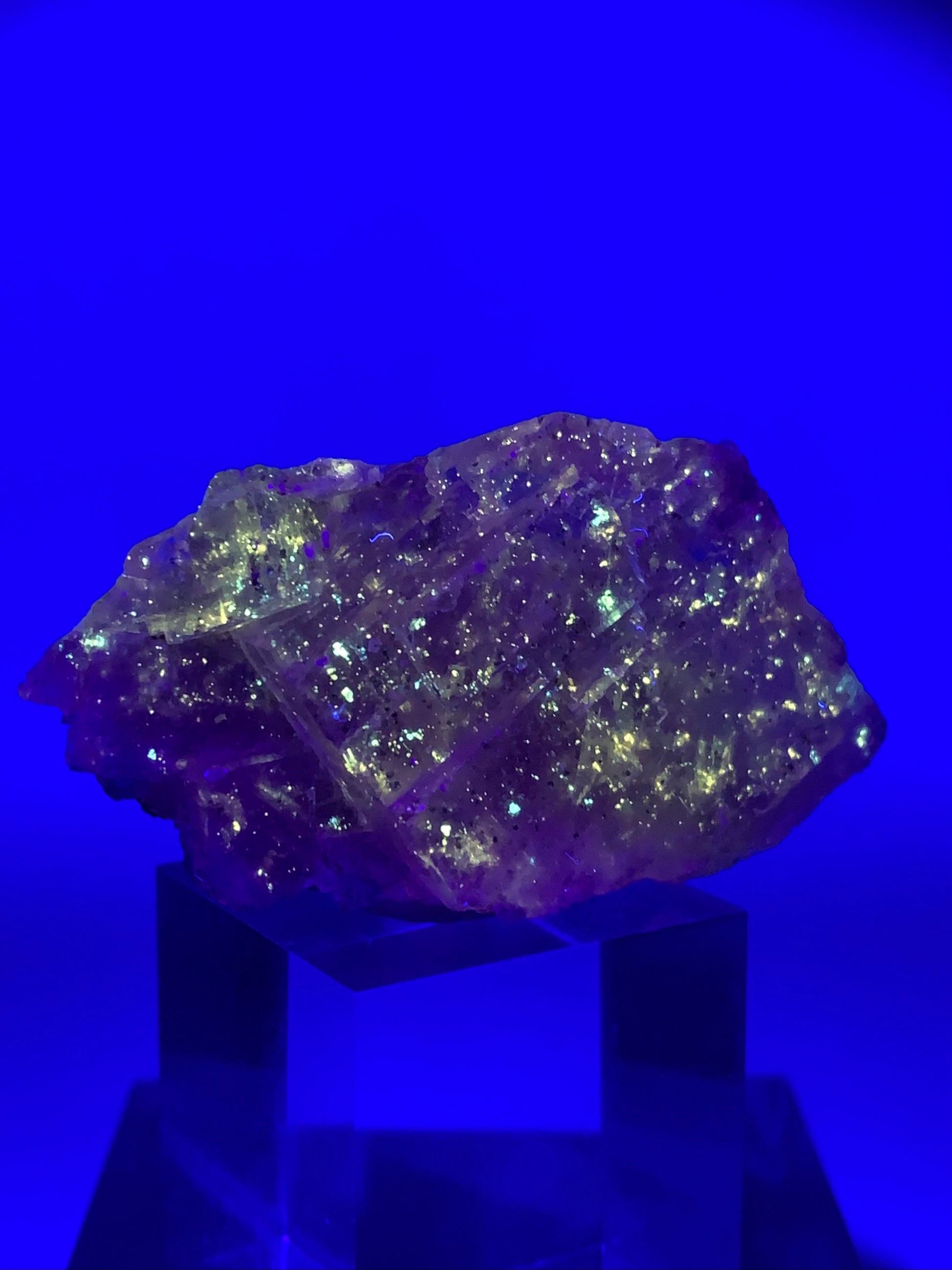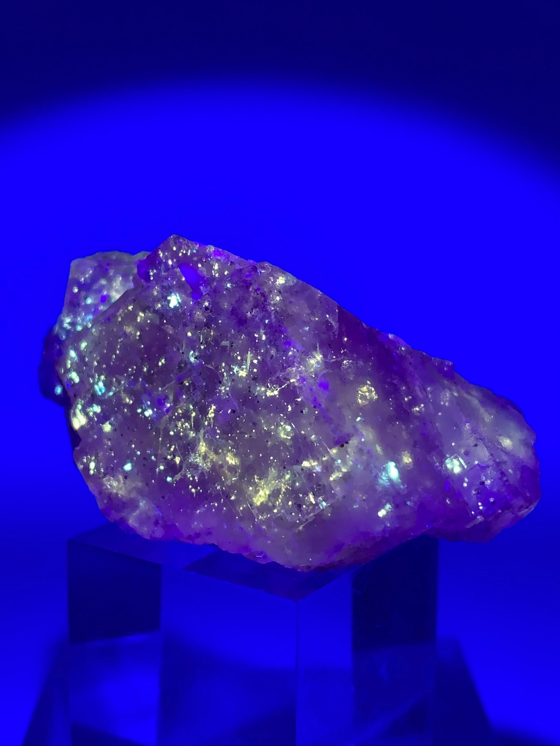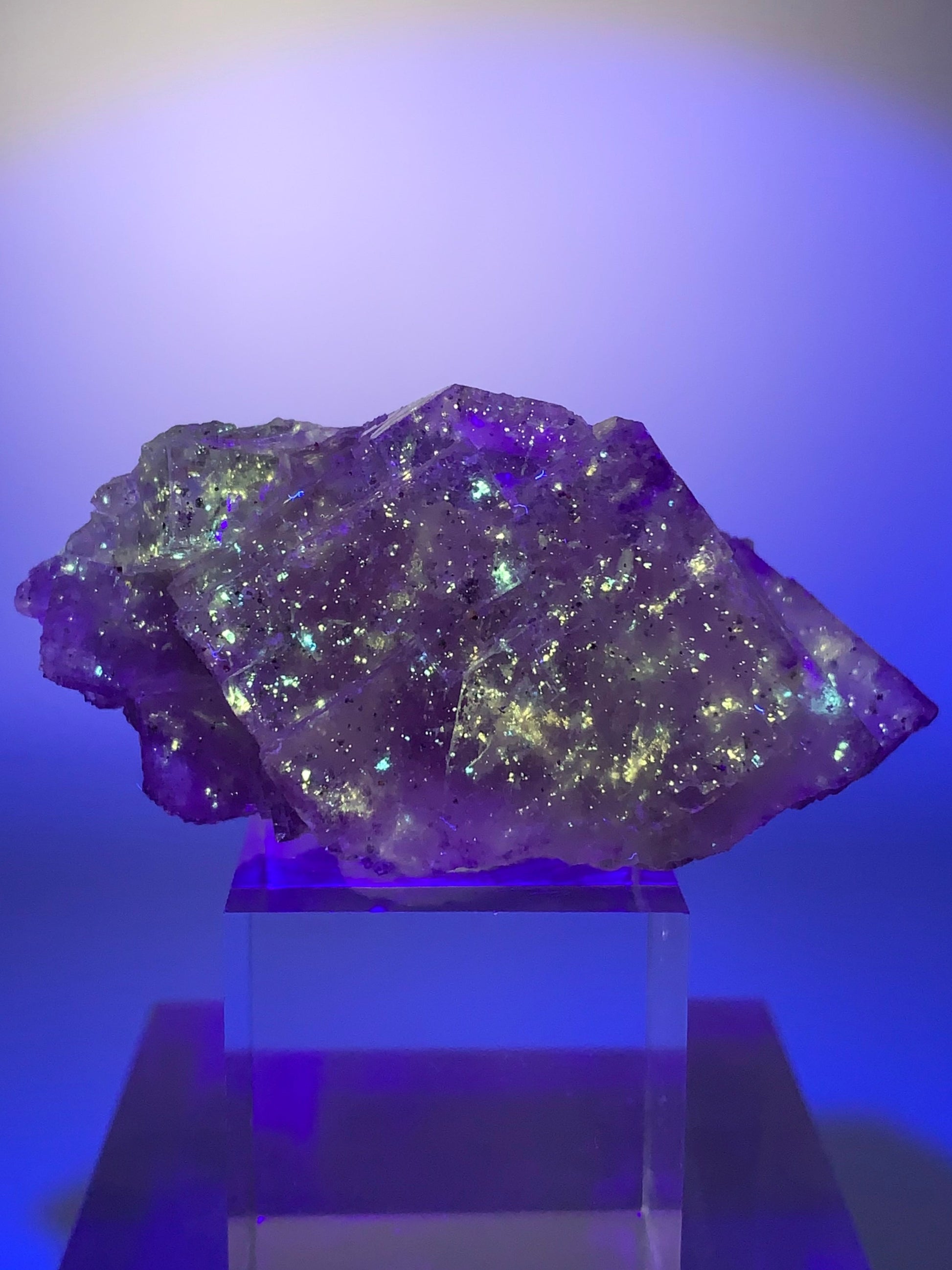 A rare and mesmerizing Galaxy Fluorite featuring vibrant color banding and natural petroleum inclusions that fluoresce under UV light — a true collector’s gem.