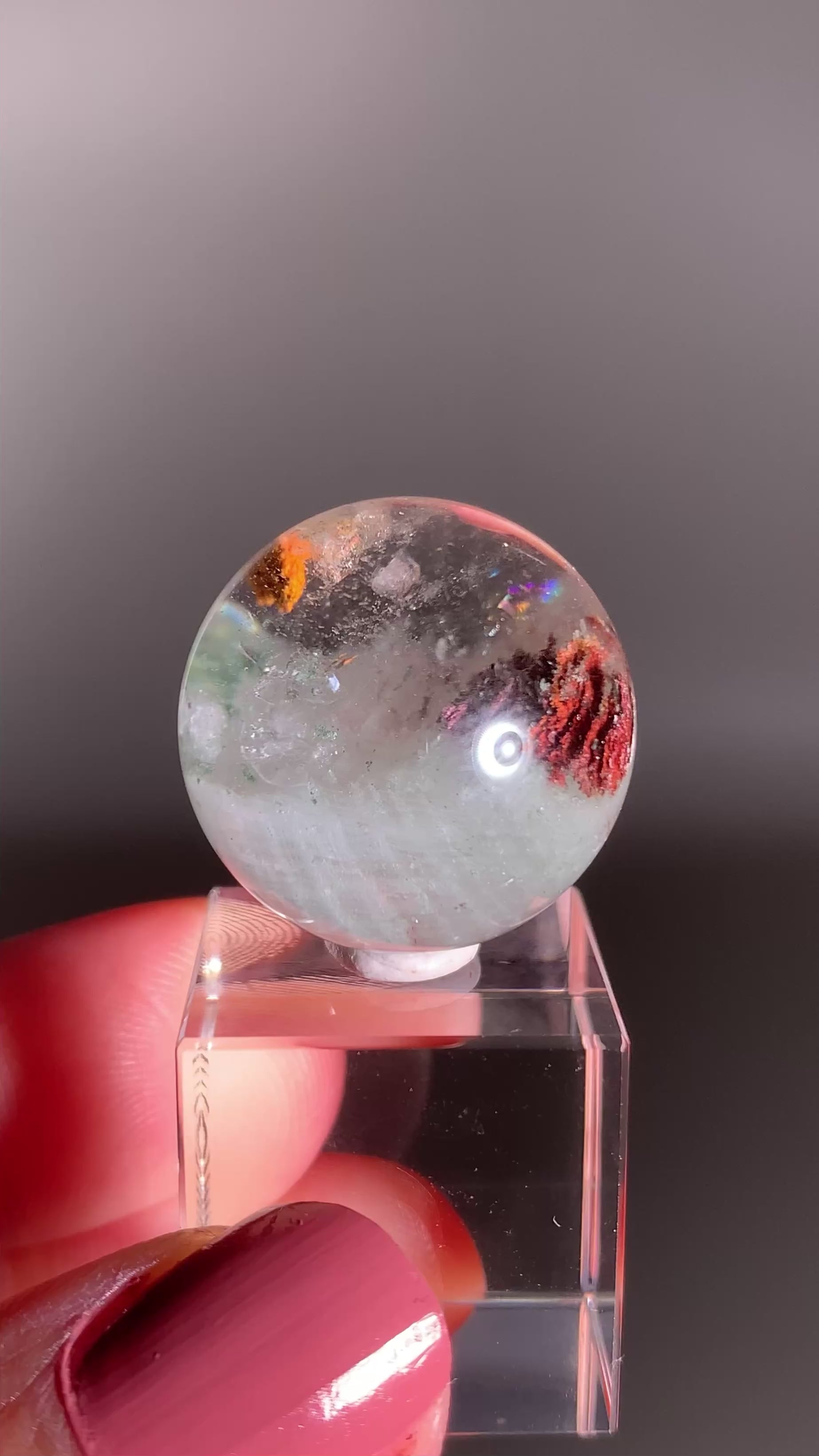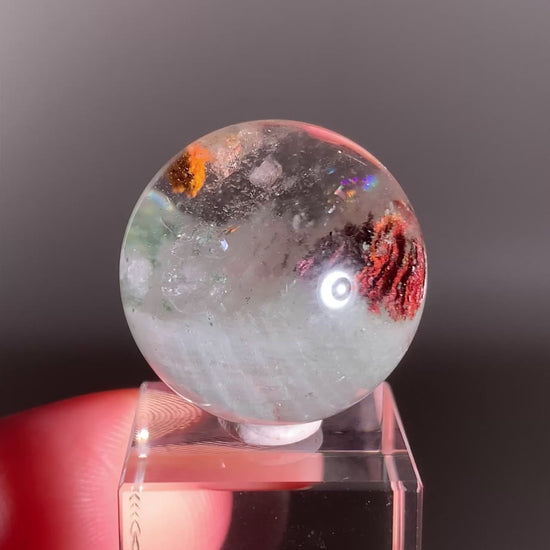 This Garden Quartz Sphere from Zambia showcases a Manifestation Cluster (crystal within crystal) and stunning internal landscapes with lush inclusions that create a miniature world inside the quartz. Its clarity and natural patterns make it a captivating display piece and a must-have for collectors who appreciate the beauty and complexity of natural quartz.