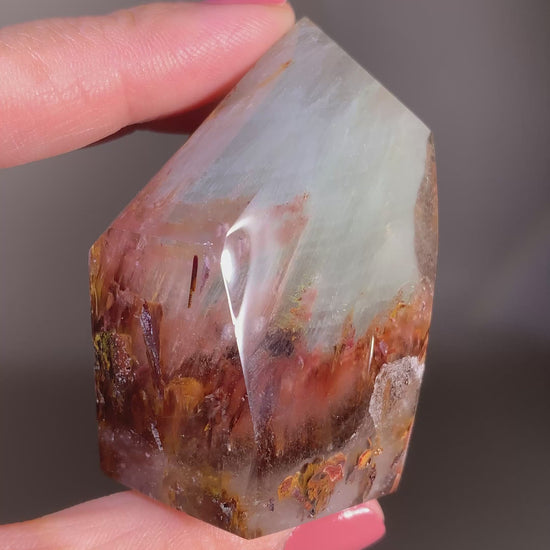 Garden Quartz with Pink Amphibole – A polished tower featuring vibrant layered inclusions and soft pink tones
