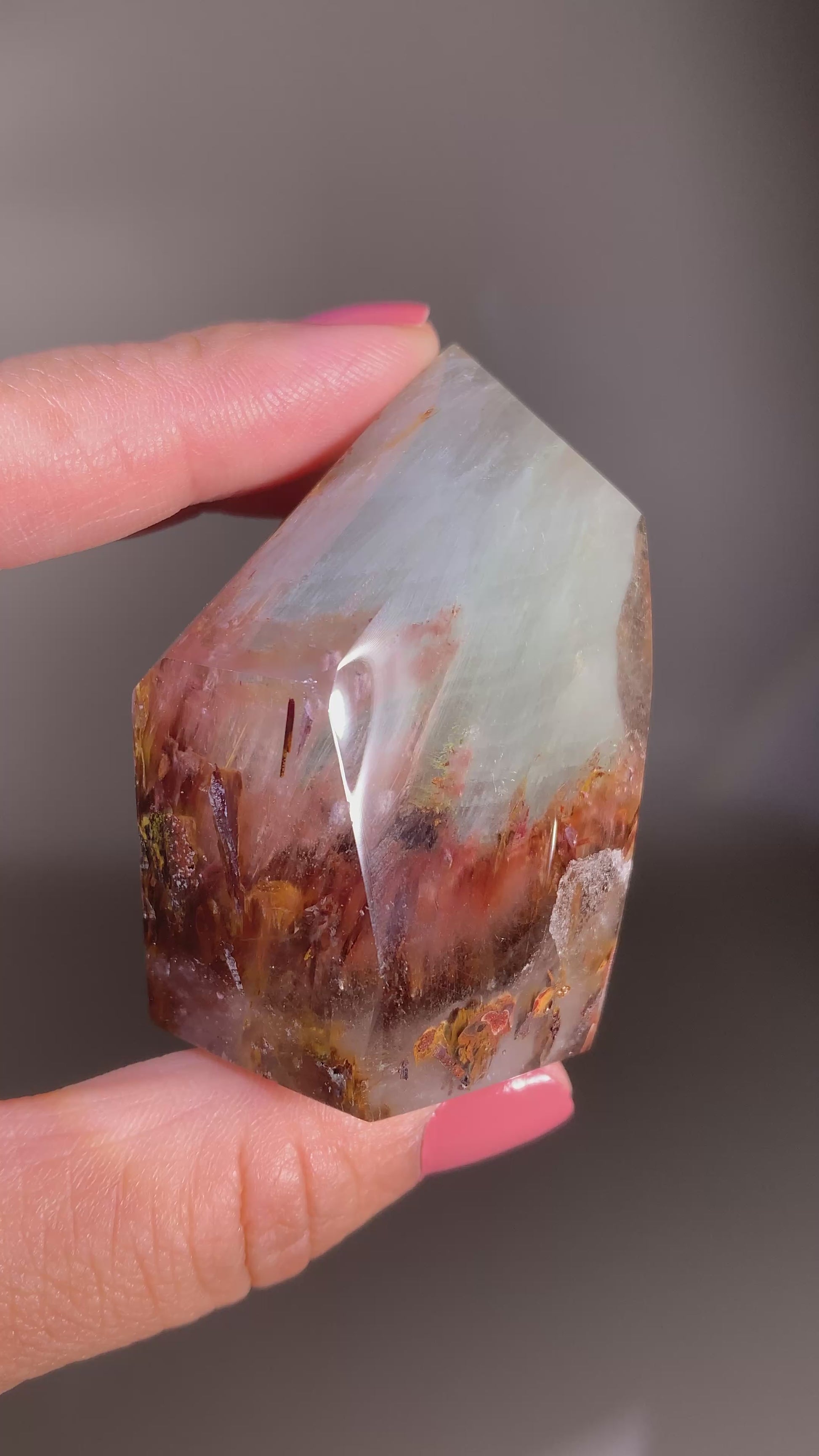 This rare polished tower combines the vibrant, layered inclusions of Garden Quartz with the soft, ethereal beauty of Pink Amphibole. The result is a breathtaking crystal full of depth, color, and unique character—highly prized by collectors for both its rarity and natural artistry.