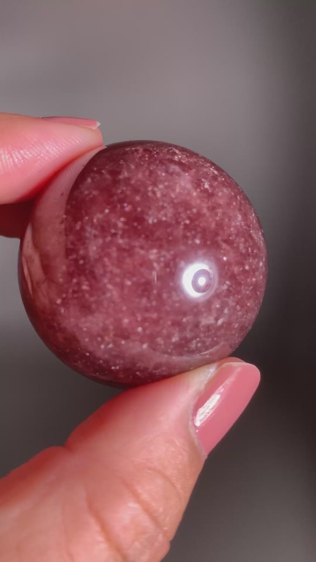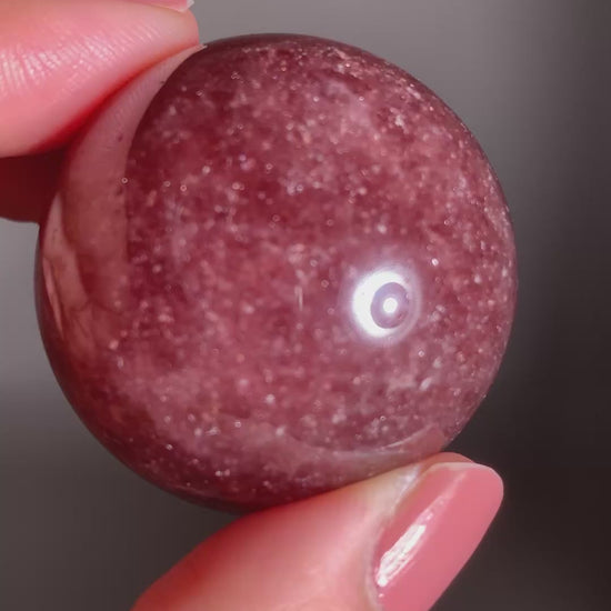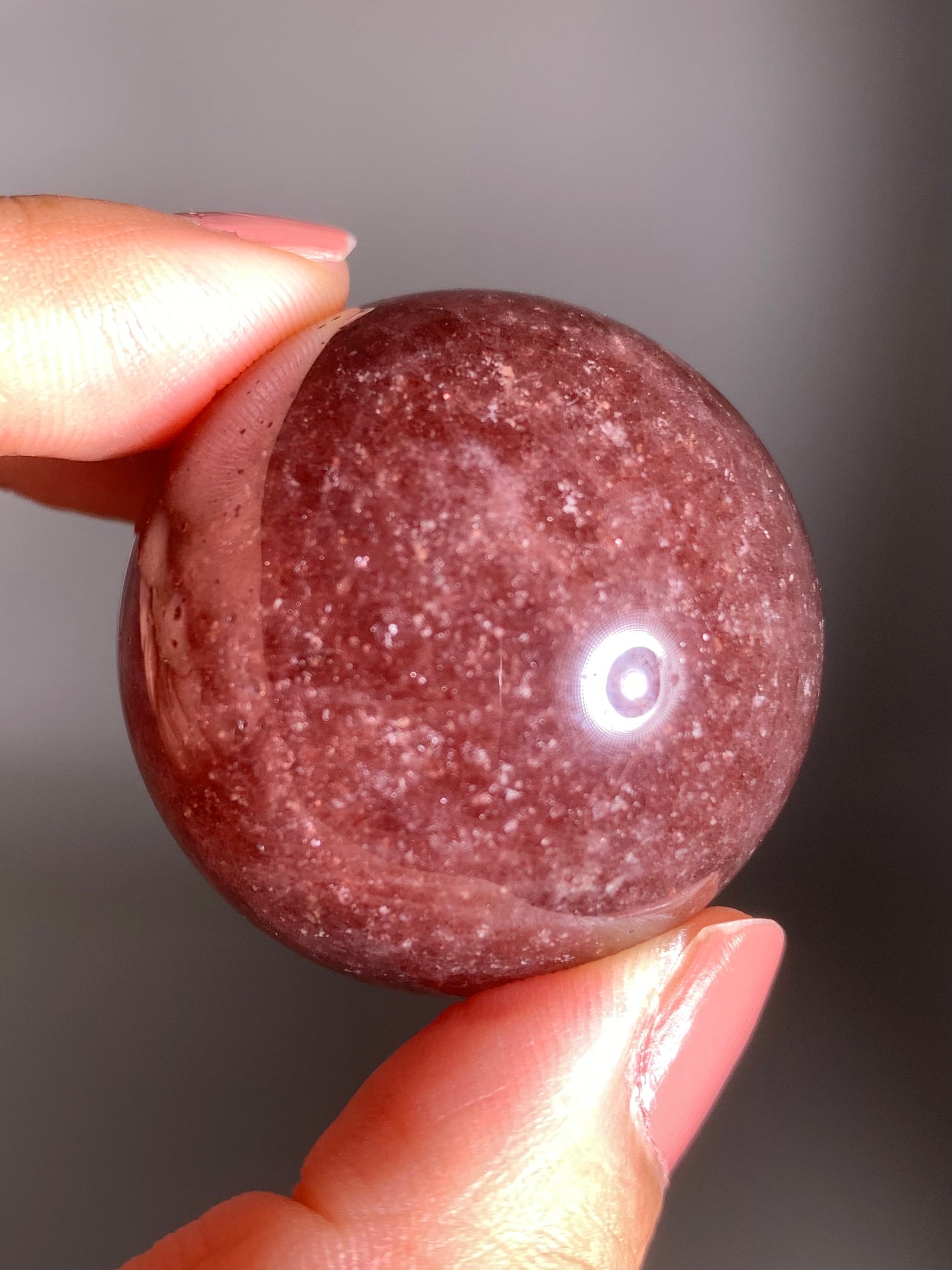 This glittery Strawberry Quartz sphere from Madagascar features a rich, reddish-pink hue with delicate sparkles, resembling the color of ripe strawberries. A warm, charming piece that radiates gentle, uplifting energy.