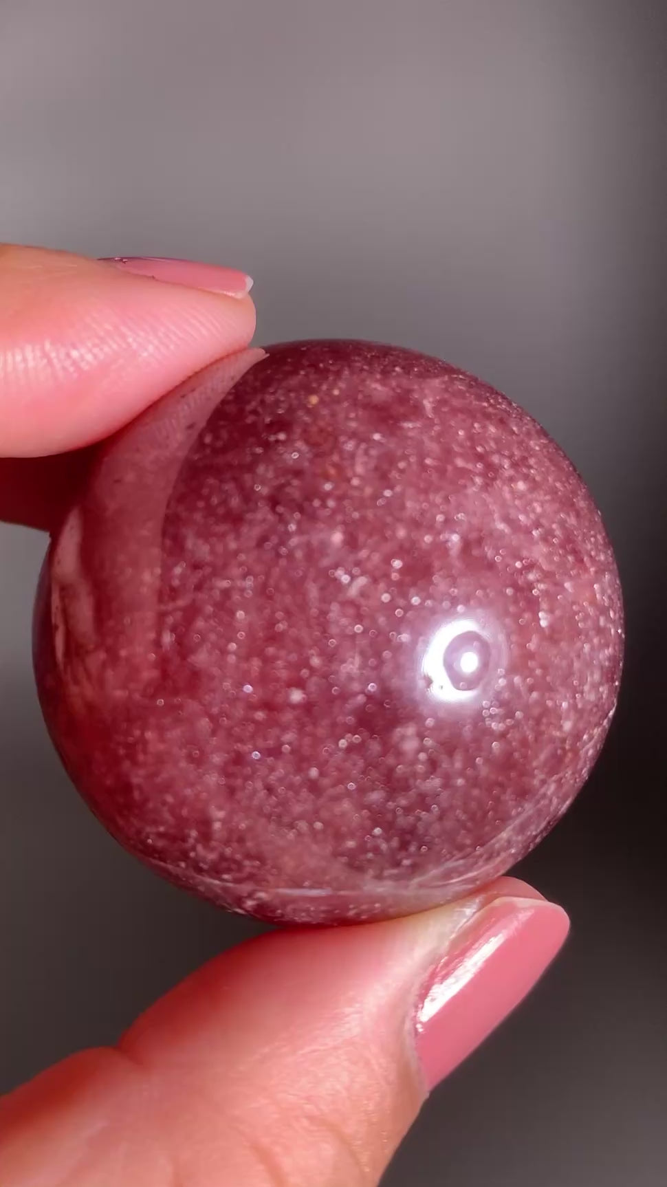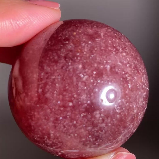 This glittery Strawberry Quartz sphere from Madagascar features a rich, reddish-pink hue with delicate sparkles, resembling the color of ripe strawberries. A warm, charming piece that radiates gentle, uplifting energy.
