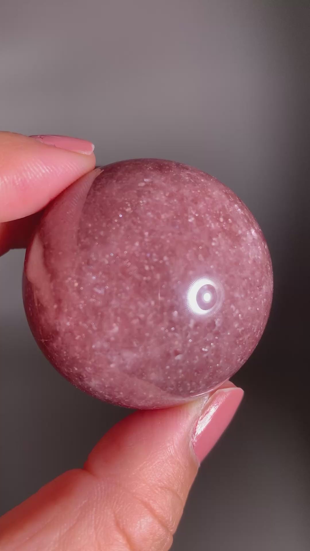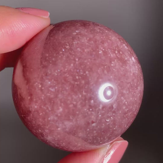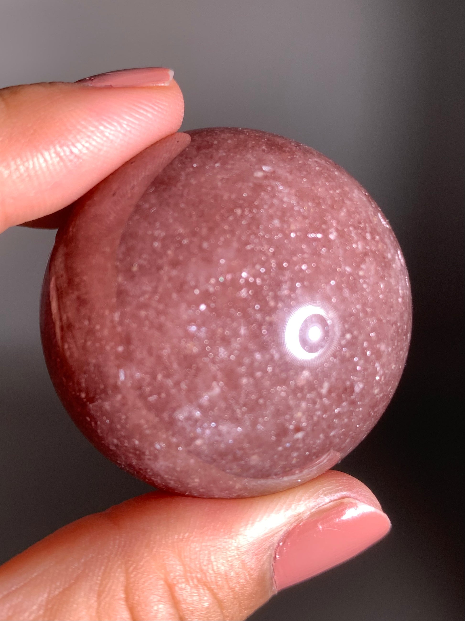 This glittery Strawberry Quartz sphere from Madagascar features a rich, reddish-pink hue with delicate sparkles, resembling the color of ripe strawberries. A warm, charming piece that radiates gentle, uplifting energy.