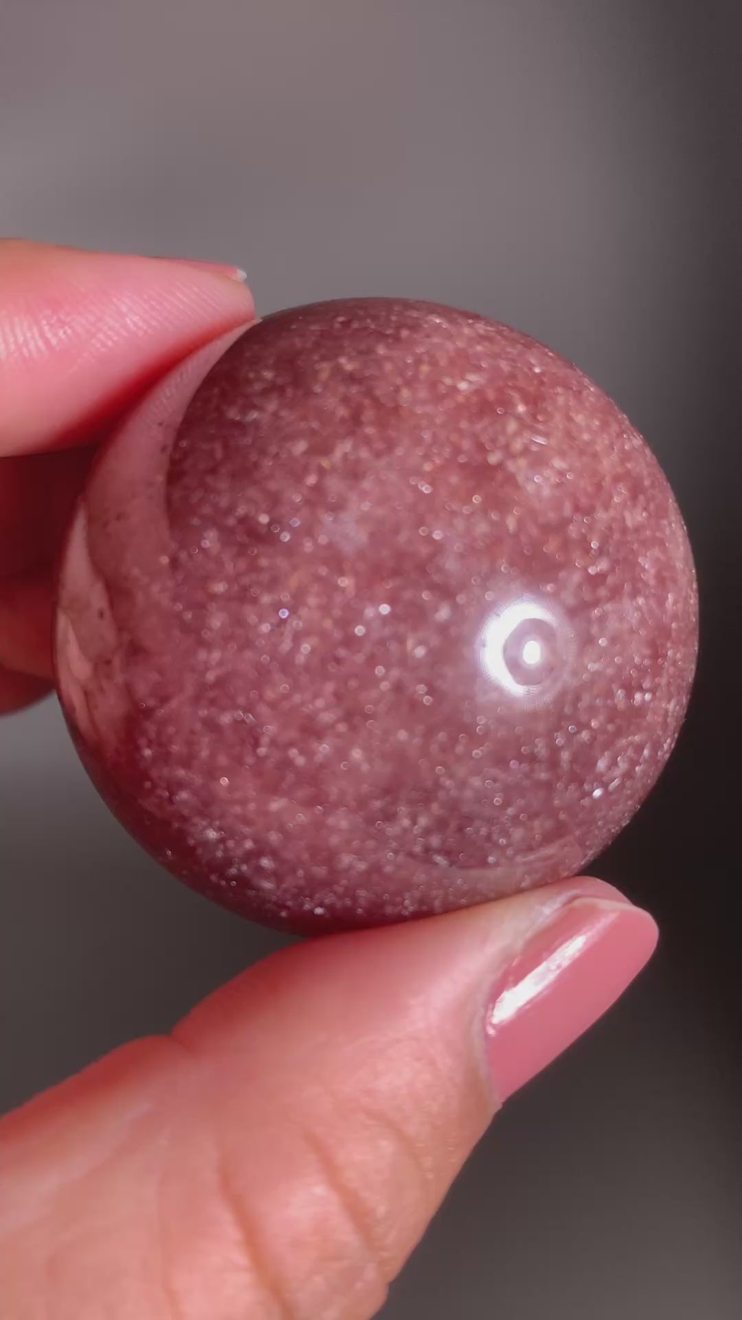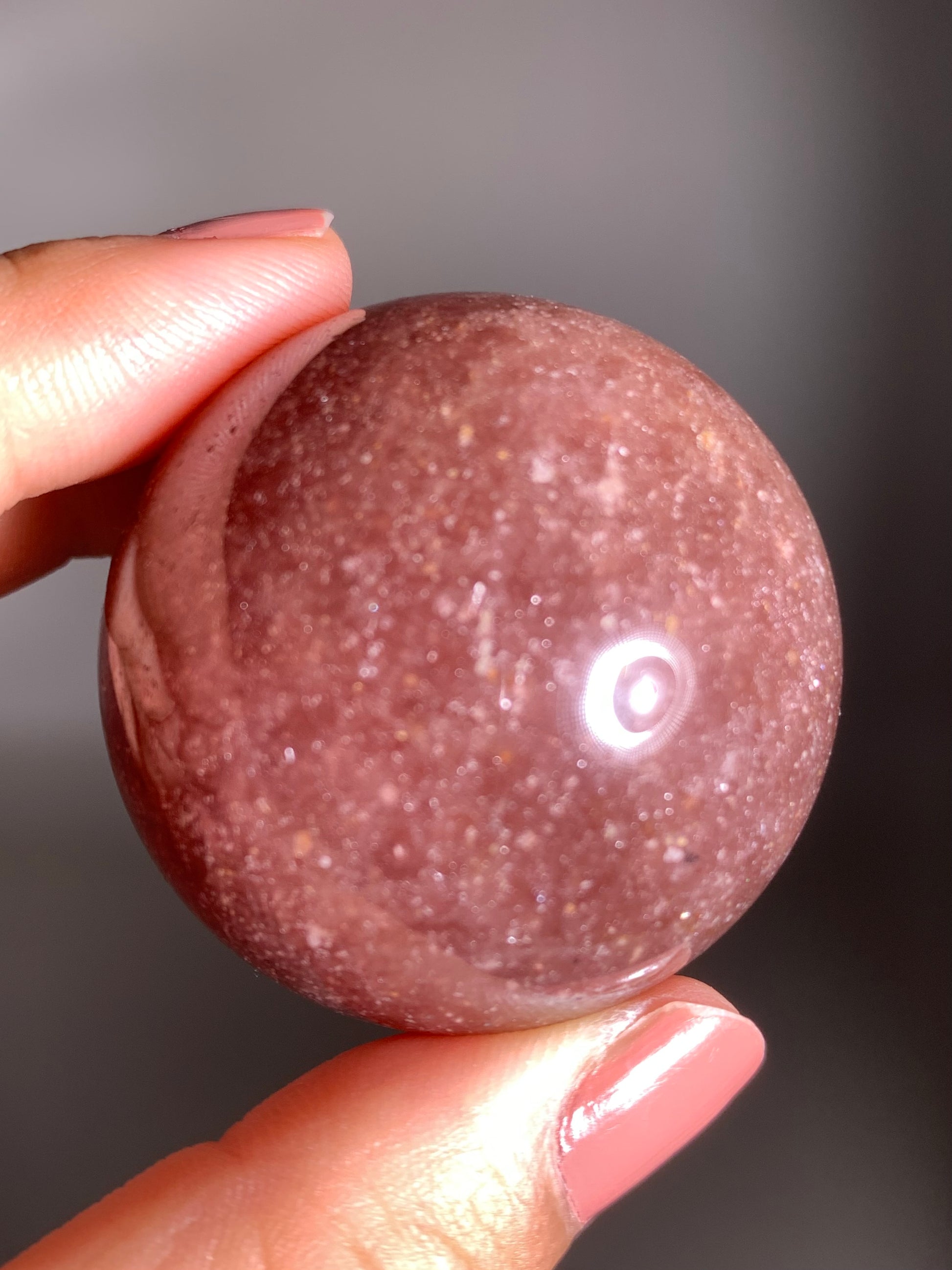 This glittery Strawberry Quartz sphere from Madagascar features a rich, reddish-pink hue with delicate sparkles, resembling the color of ripe strawberries. A warm, charming piece that radiates gentle, uplifting energy.