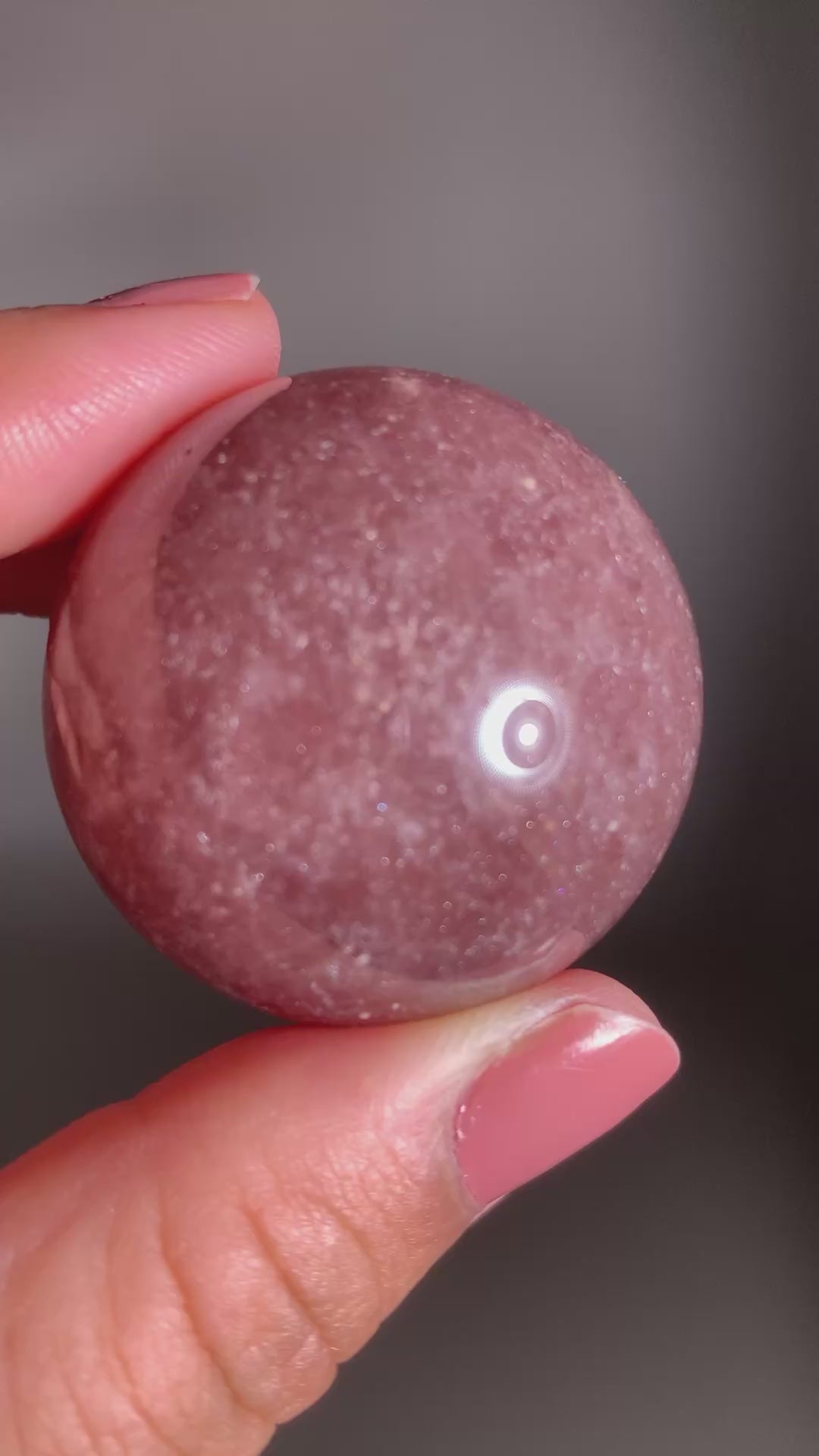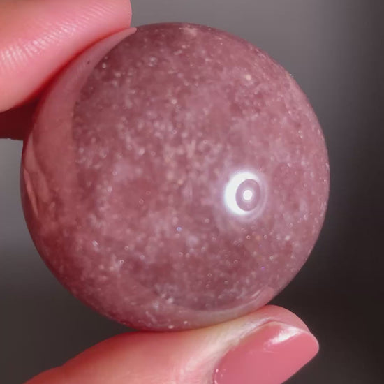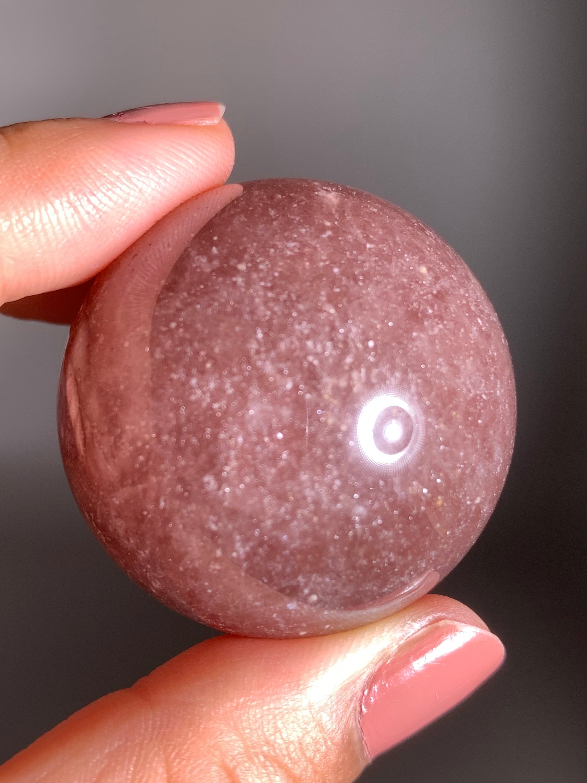 This glittery Strawberry Quartz sphere from Madagascar features a rich, reddish-pink hue with delicate sparkles, resembling the color of ripe strawberries. A warm, charming piece that radiates gentle, uplifting energy.