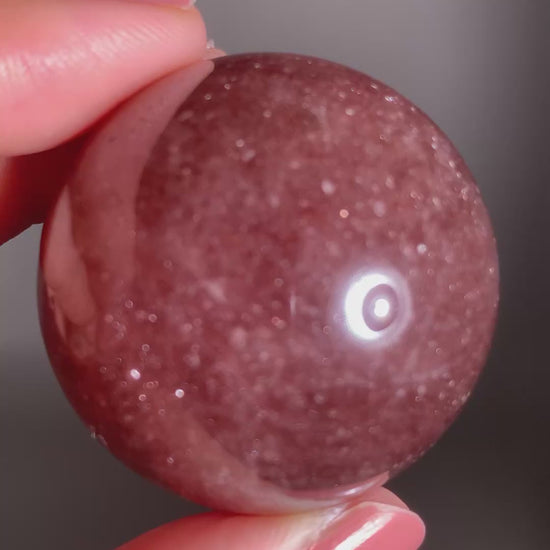 This glittery Strawberry Quartz sphere from Madagascar features a rich, reddish-pink hue with delicate sparkles, resembling the color of ripe strawberries. A warm, charming piece that radiates gentle, uplifting energy.