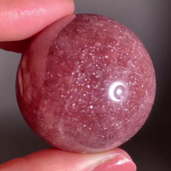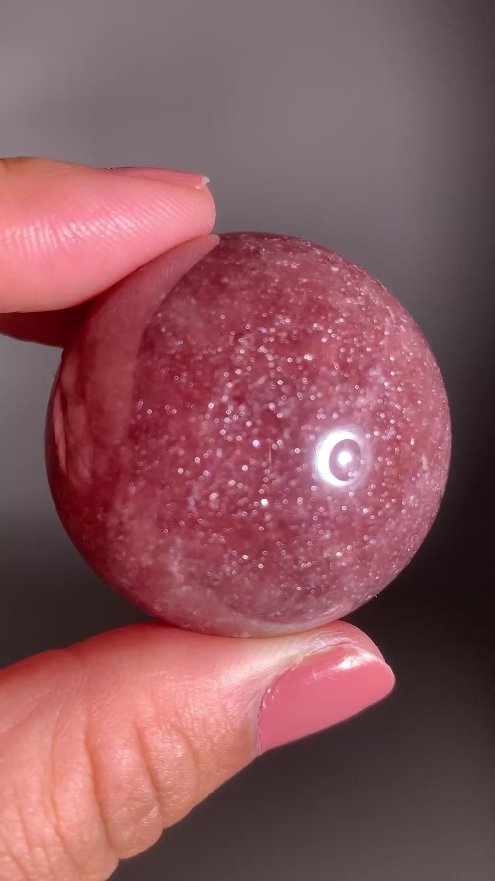 This glittery Strawberry Quartz sphere from Madagascar features a rich, reddish-pink hue with delicate sparkles, resembling the color of ripe strawberries. A warm, charming piece that radiates gentle, uplifting energy.