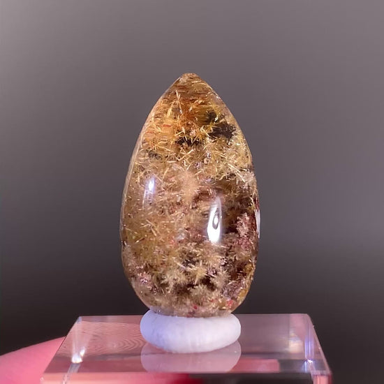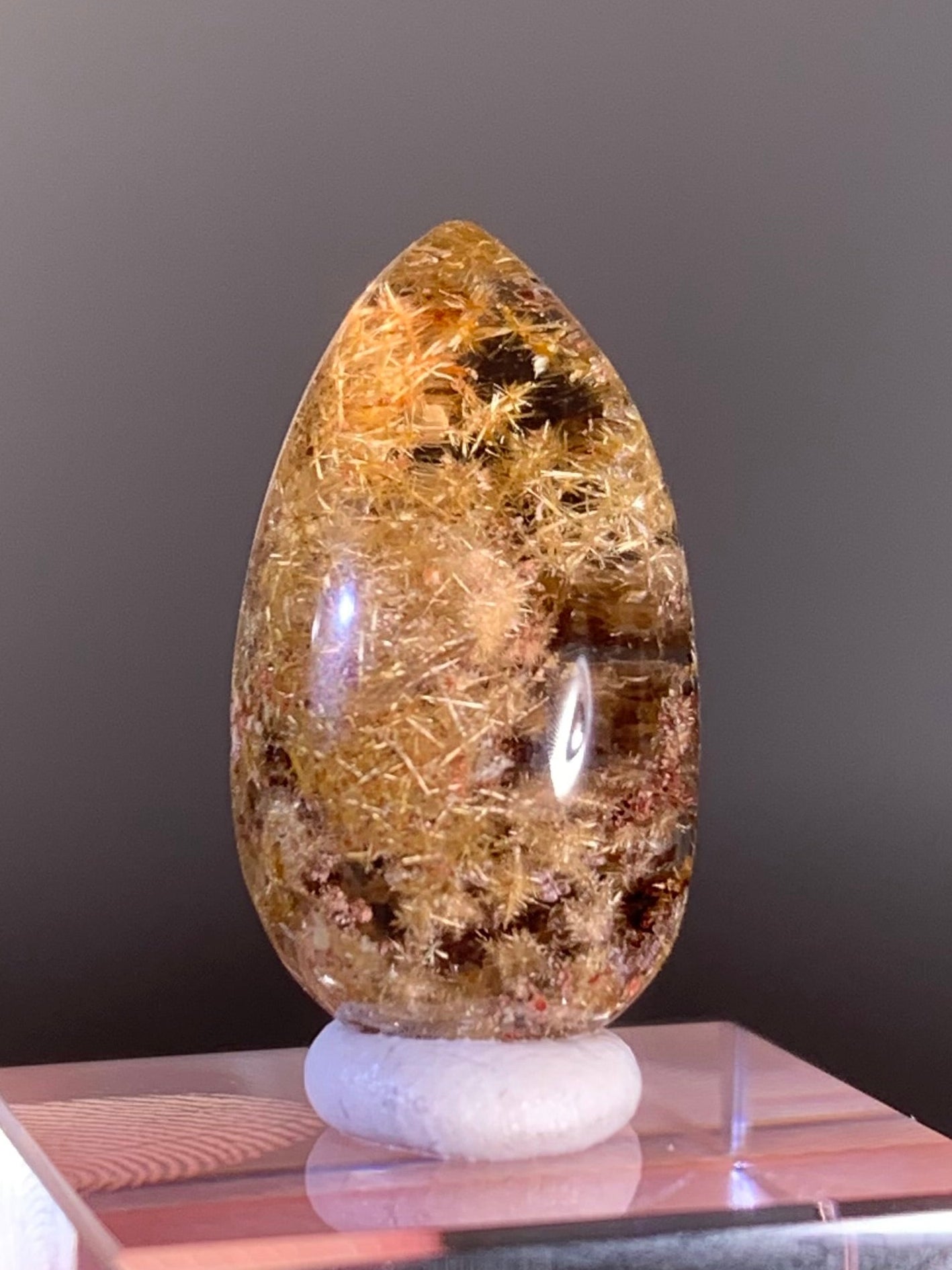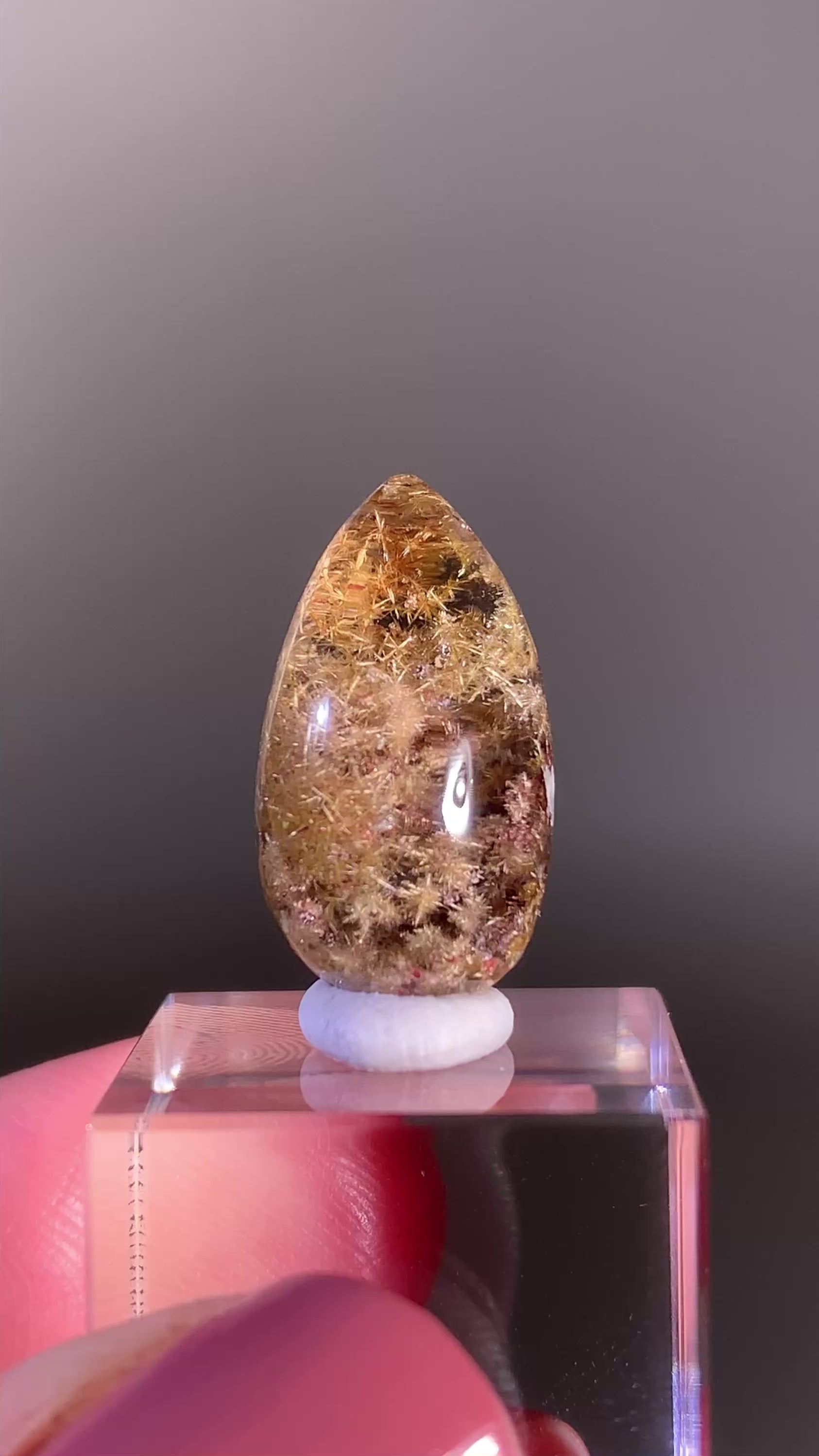A high-quality polished cabochon from Brazil featuring gold flower rutile within pink and red garden quartz. The vibrant golden rutile blooms contrast beautifully with the layered pink and red inclusions, creating a stunning, eye-catching piece perfect for collectors, jewelry, or display.