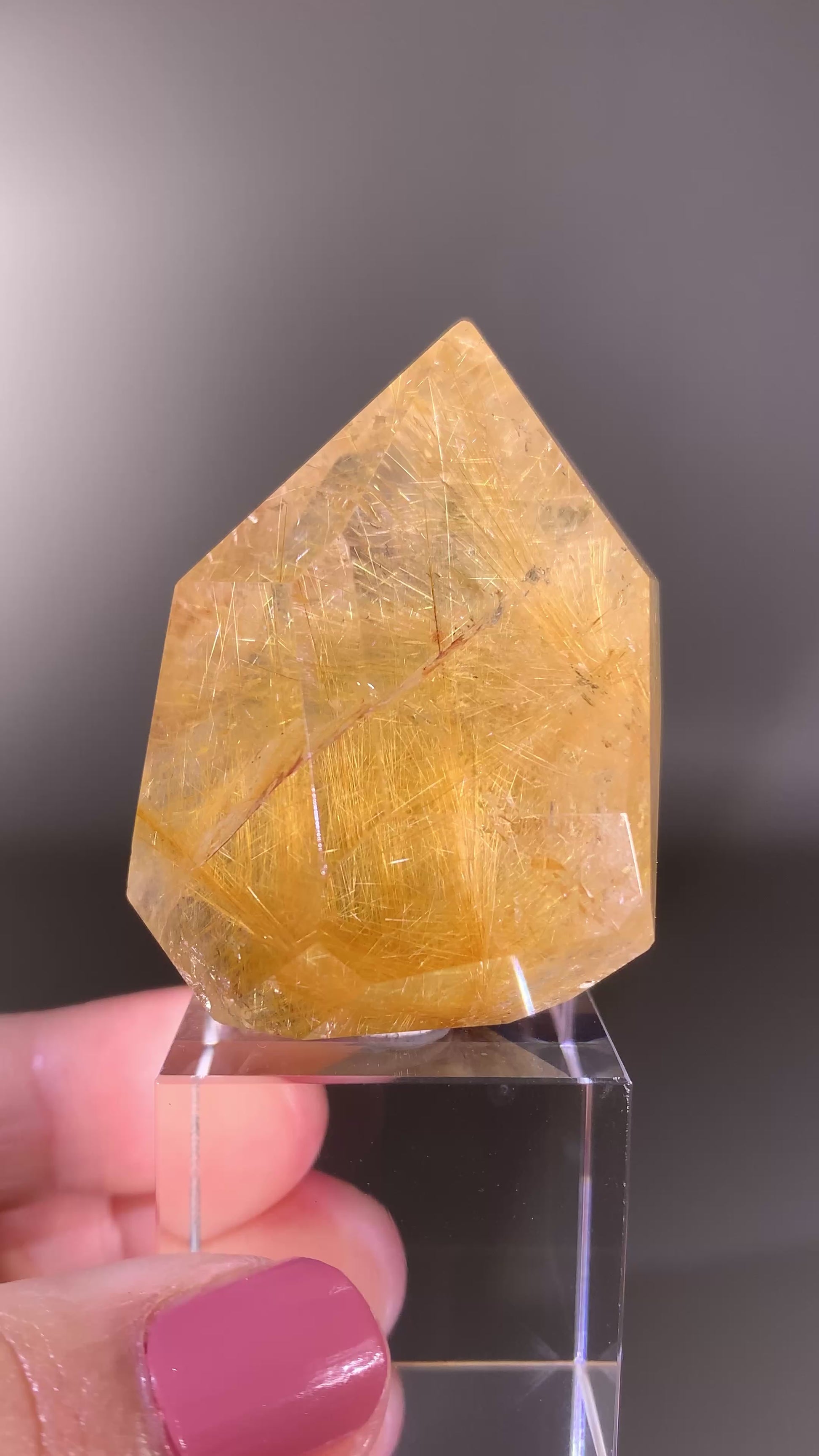 Natural gold rutilated quartz polished tower from Brazil, featuring vibrant golden rutile inclusions and high clarity. A high-grade crystal ideal for collectors, display, or crystal enthusiasts.