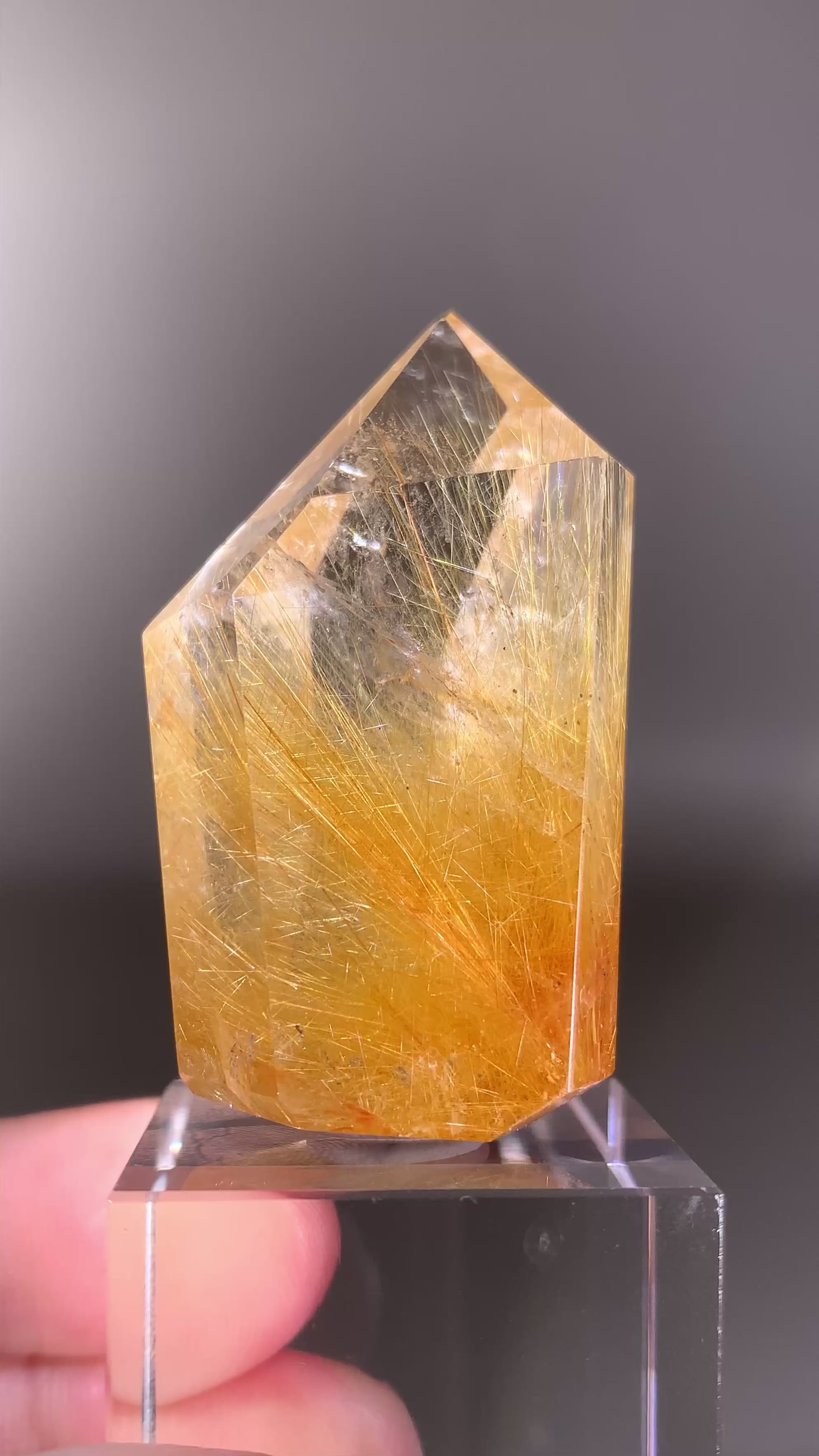 Natural gold rutilated quartz polished tower from Brazil, featuring vibrant golden rutile inclusions and high clarity. A high-grade crystal ideal for collectors, display, or crystal enthusiasts.