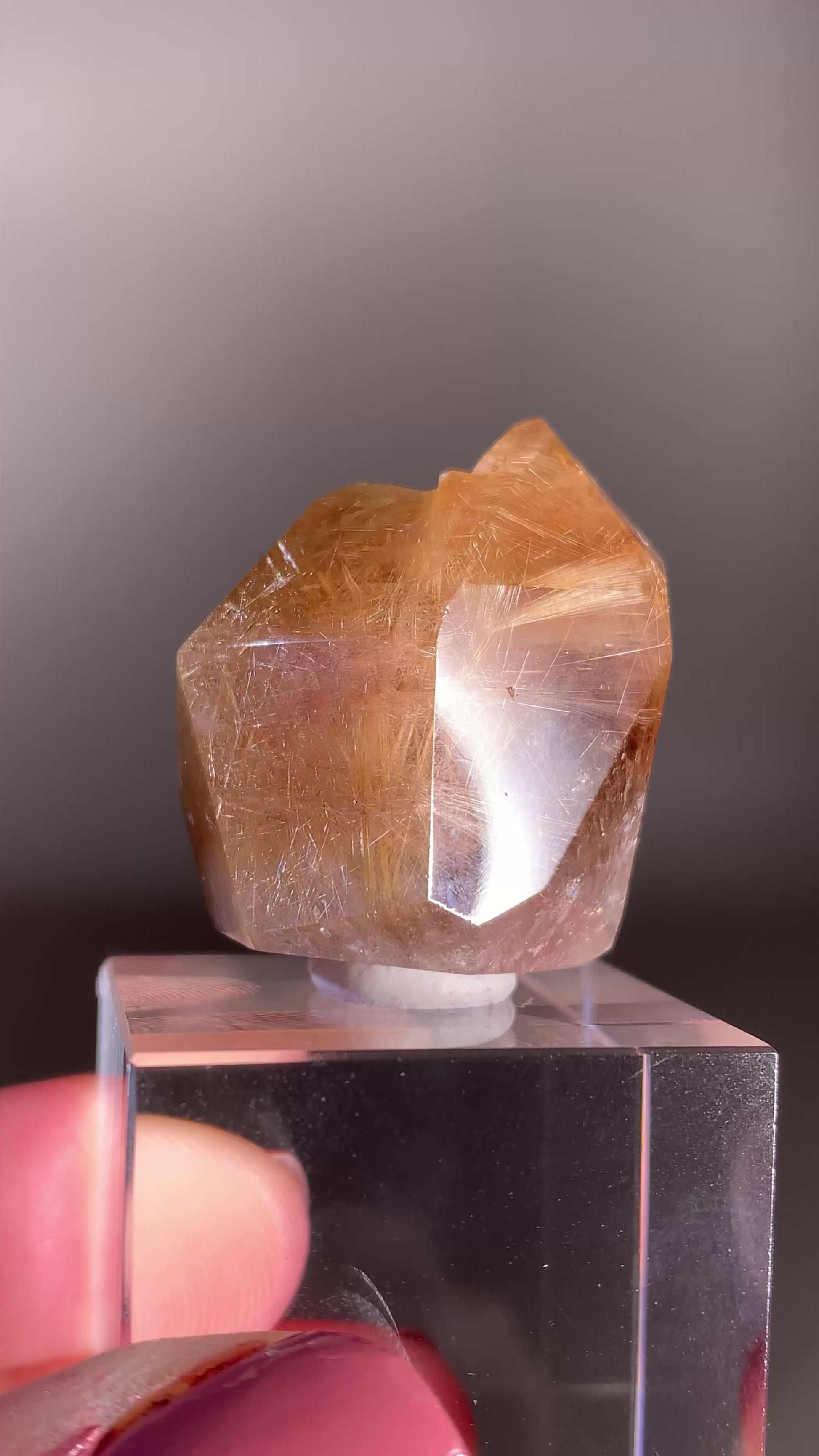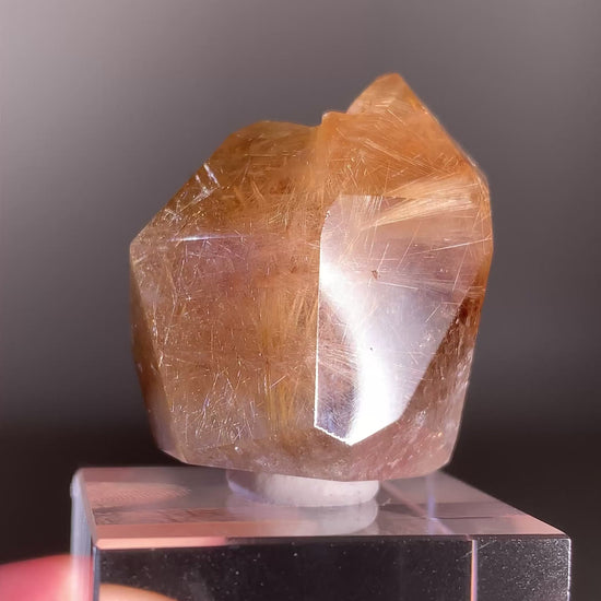 This Gold Rutile Polished Quartz Cluster from Brazil features shimmering golden rutile needles suspended within clear quartz, beautifully enhanced by a smooth polished finish. The combination of natural crystal points and reflective rutile creates exceptional depth and sparkle from every angle.