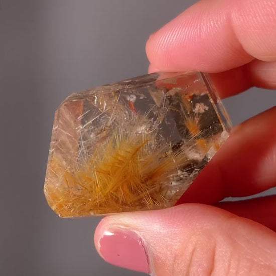 This striking polished freeform features golden rutile needles suspended in clear quartz, creating a radiant, energetic display of natural beauty and light.