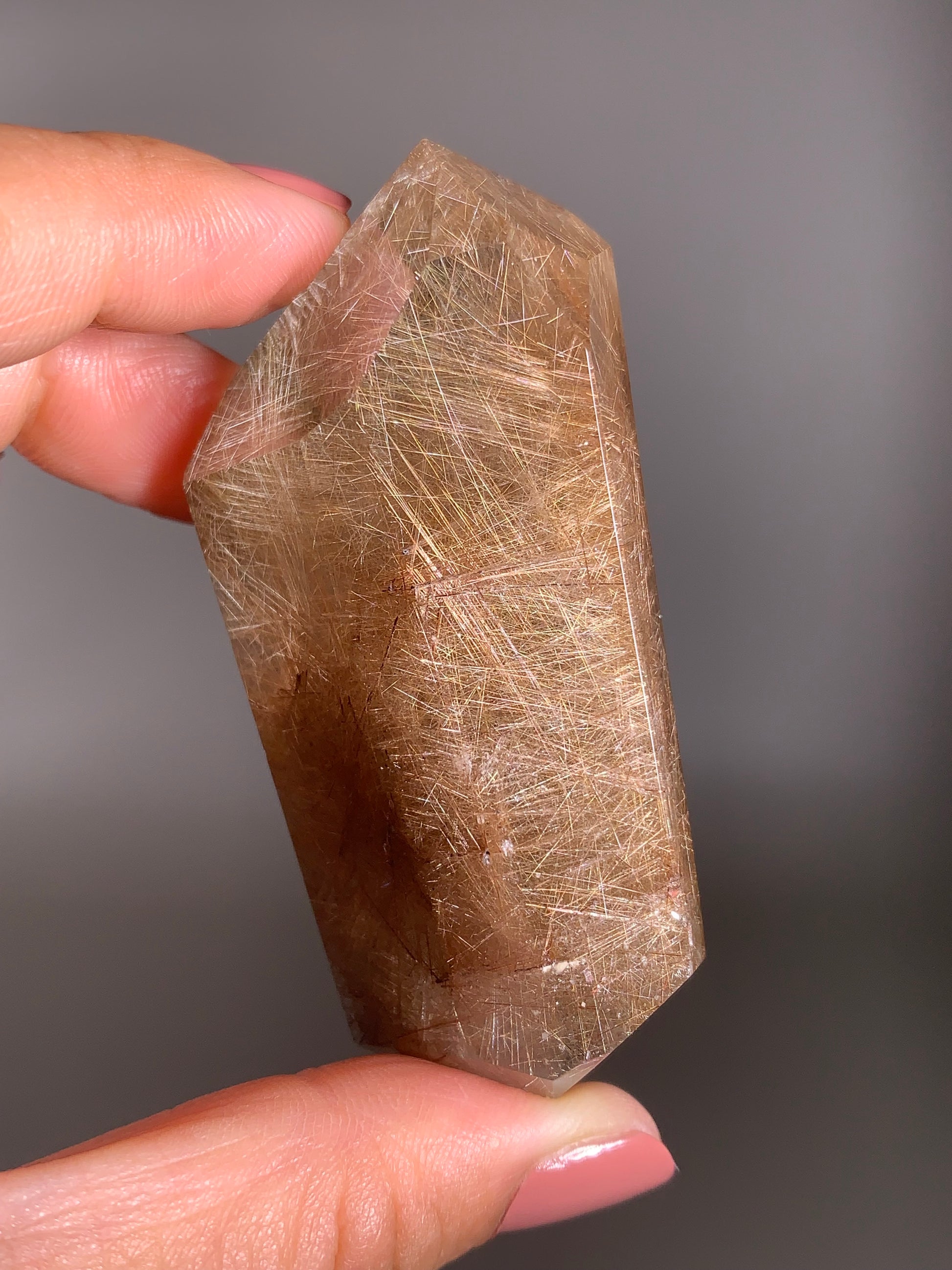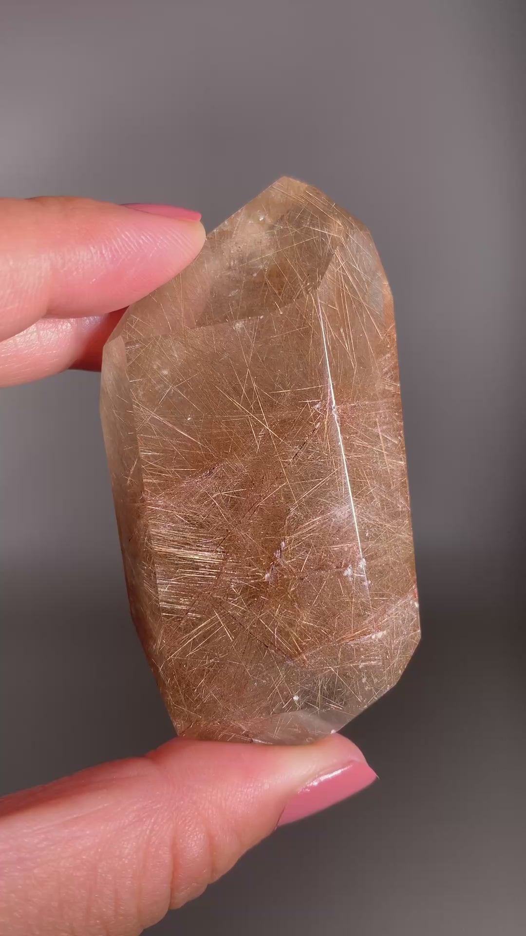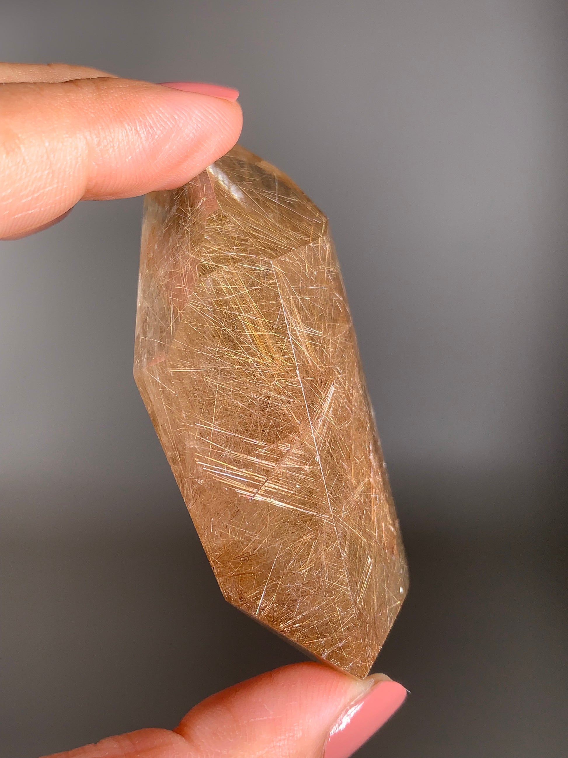 This striking polished freeform features golden rutile needles suspended in clear quartz, creating a radiant, energetic display of natural beauty and light.