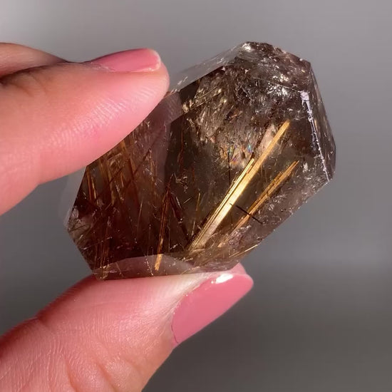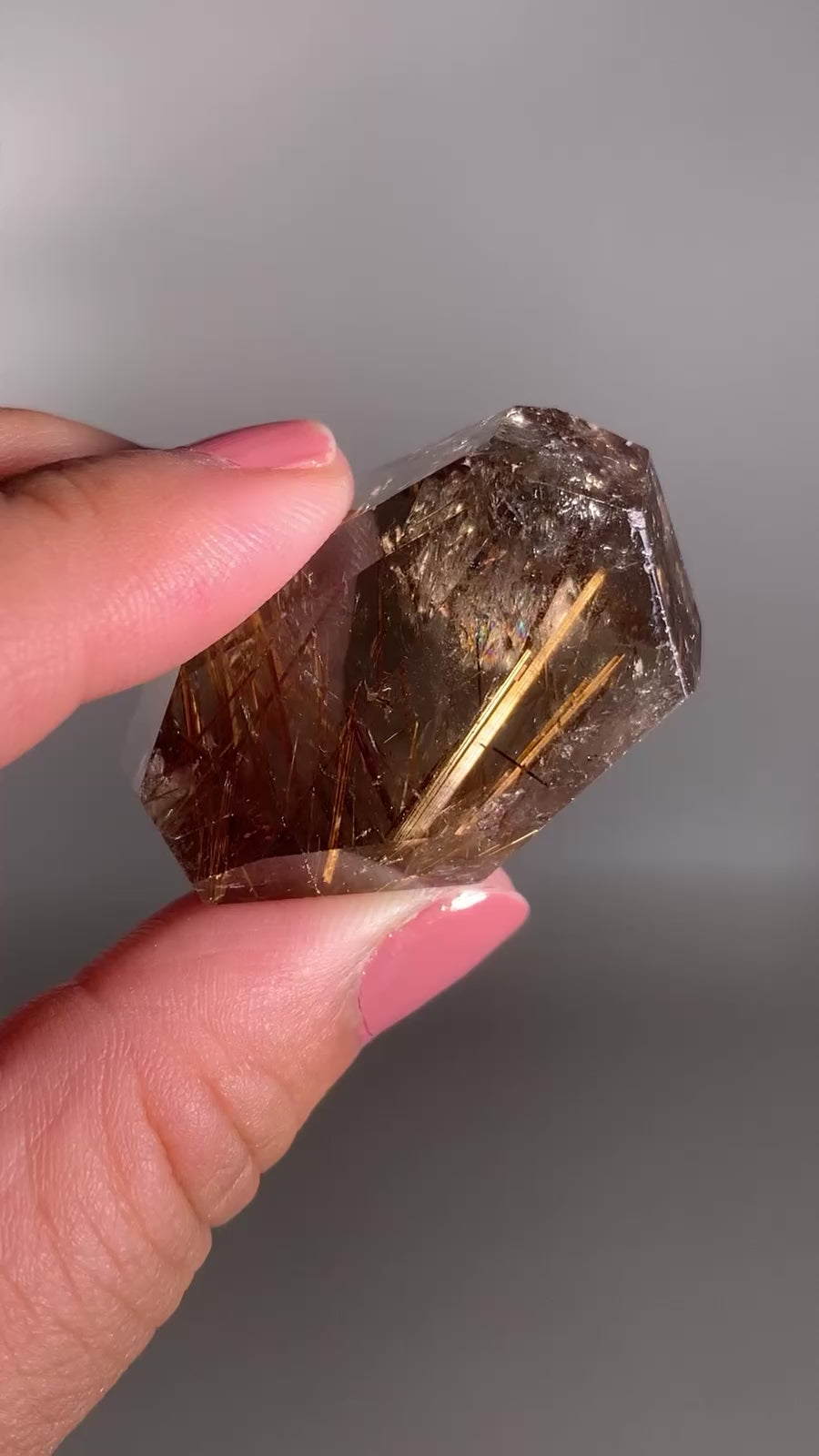 A stunning smoky quartz polished freeform featuring rare gold rutile inclusions. Delicate golden needles radiate in star-like formations, beautifully suspended within the smoky quartz matrix. This unique piece combines visual brilliance with the grounding depth of smoky quartz — a true standout in any collection.