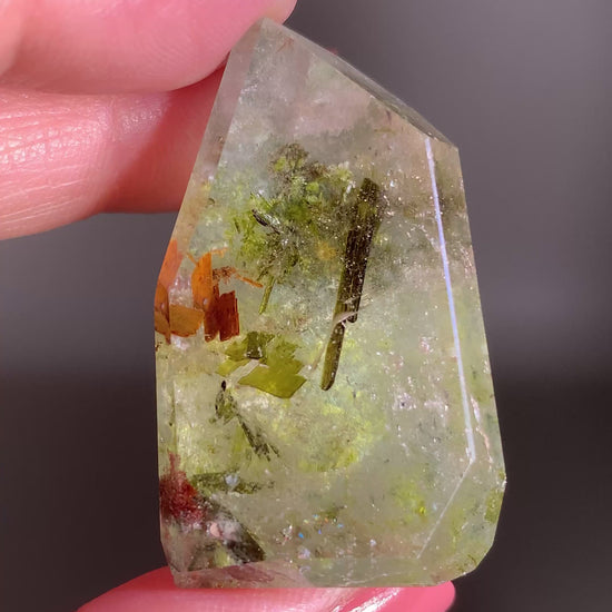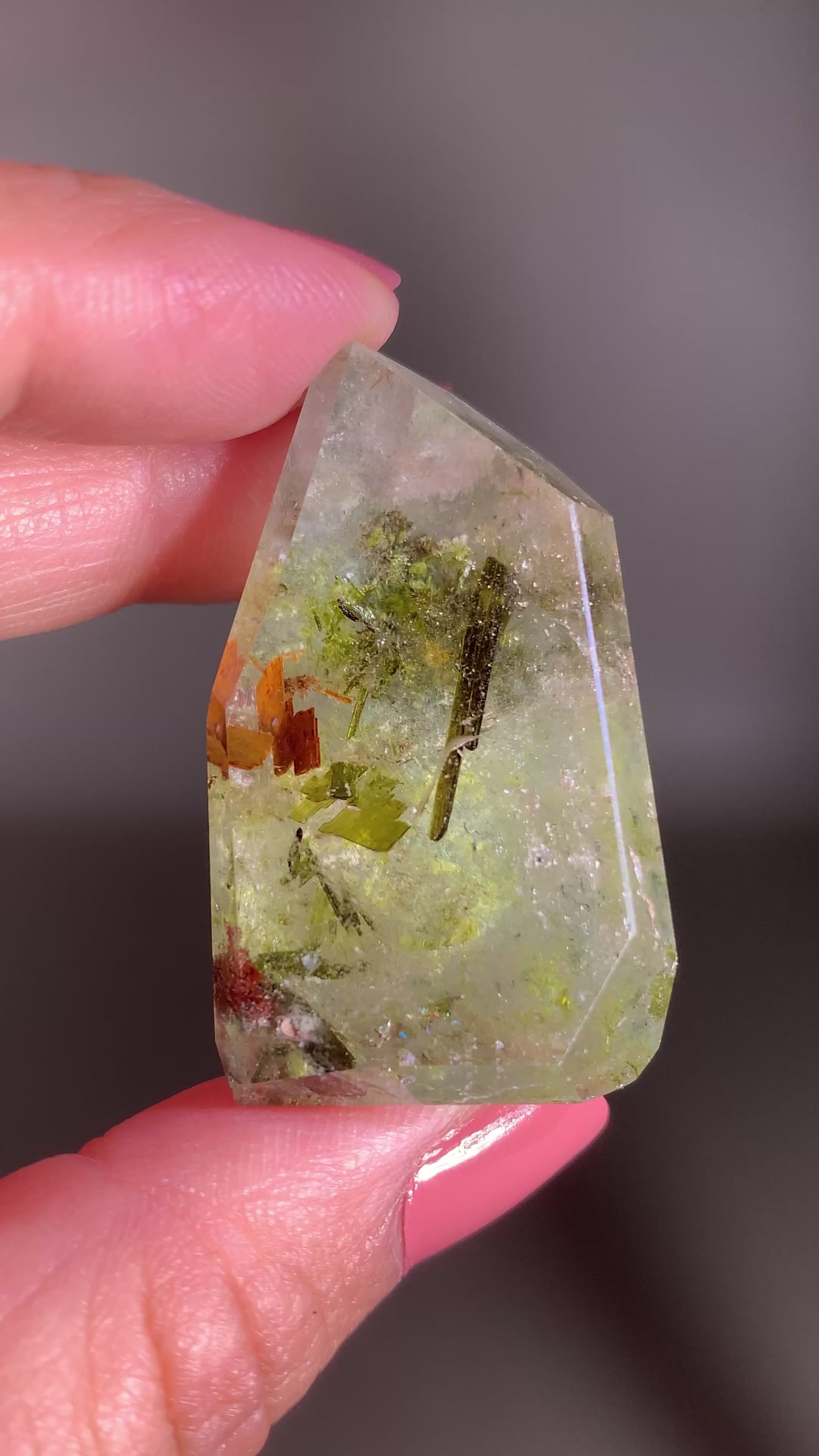 This Green Amphibole Garden Quartz from Zambia features lush green Epidote and sparkling Tourmaline inclusions, creating a vibrant internal landscape. The combination of textures and colors forms a miniature garden within the crystal. A captivating collector’s piece with exceptional clarity, depth, and visual interest.