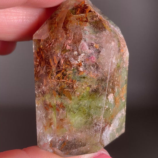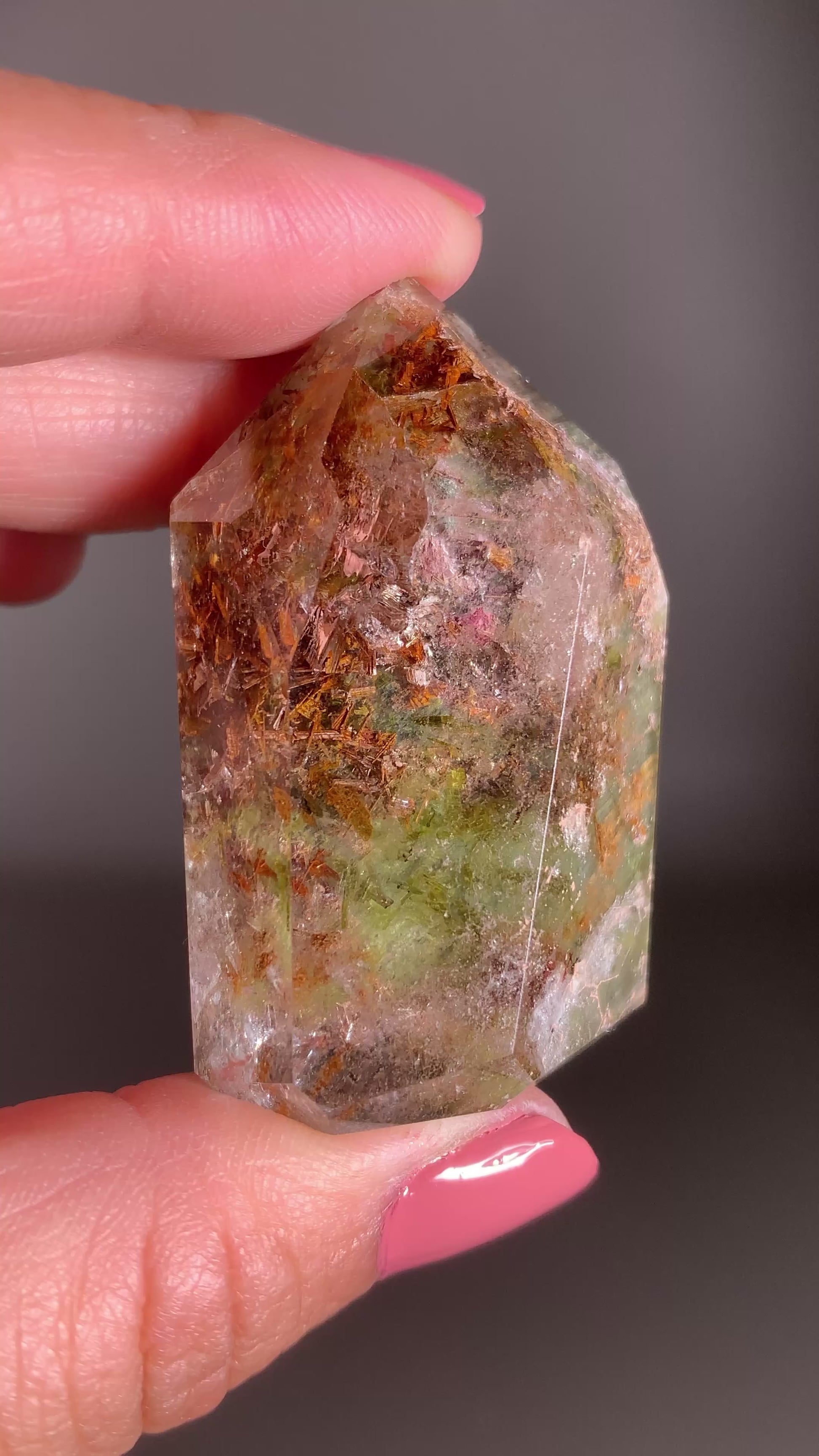 This Green Amphibole Garden Quartz from Zambia features lush green Epidote and sparkling Tourmaline inclusions, creating a vibrant internal landscape. The combination of textures and colors forms a miniature garden within the crystal. A captivating collector’s piece with exceptional clarity, depth, and visual interest.