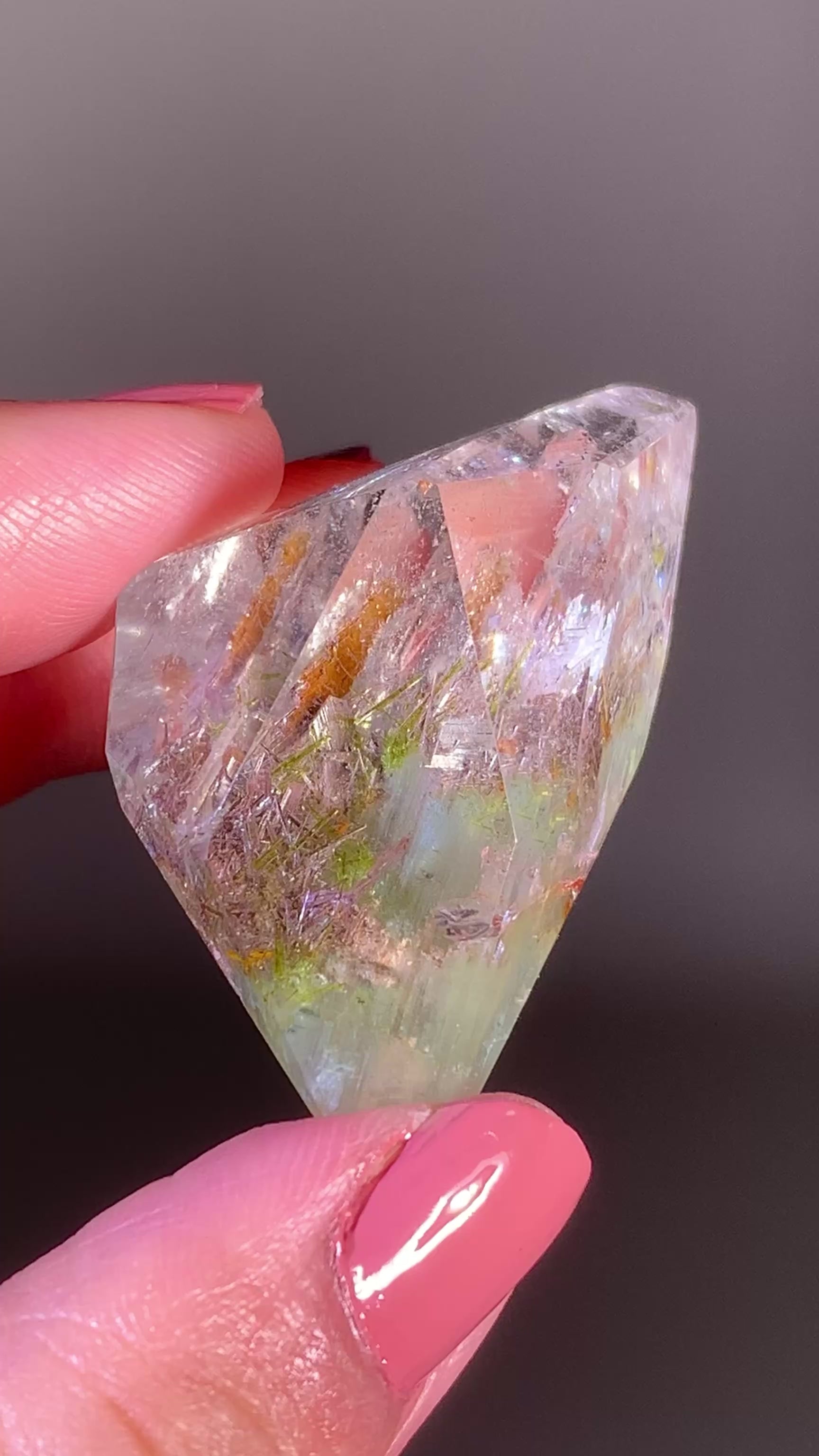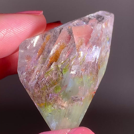 This Green Amphibole Garden Quartz tower from Zambia features lush green Epidote and sparkling Tourmaline inclusions, creating a vibrant internal landscape. The combination of textures and colors forms a miniature garden within the crystal.