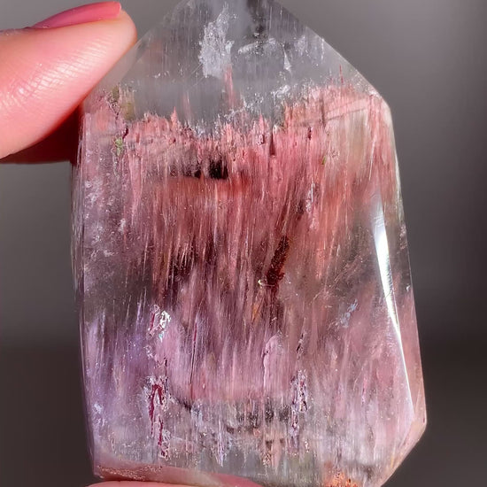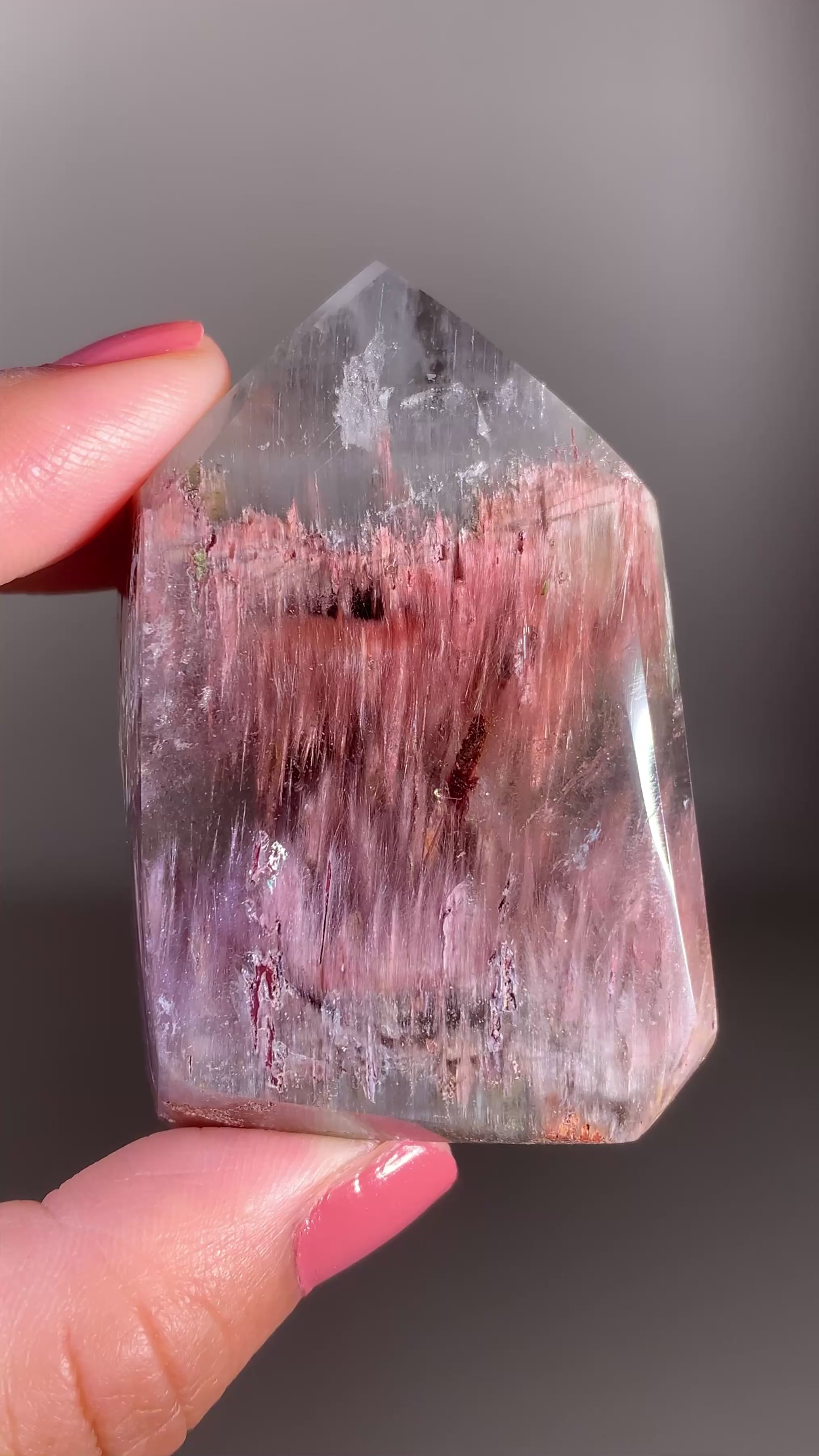 High-grade Pink & Grey Amphibole Quartz polished tower from Congo featuring beautiful silky inclusions and soft natural tones. A unique collector crystal with elegant patterns and stunning depth.