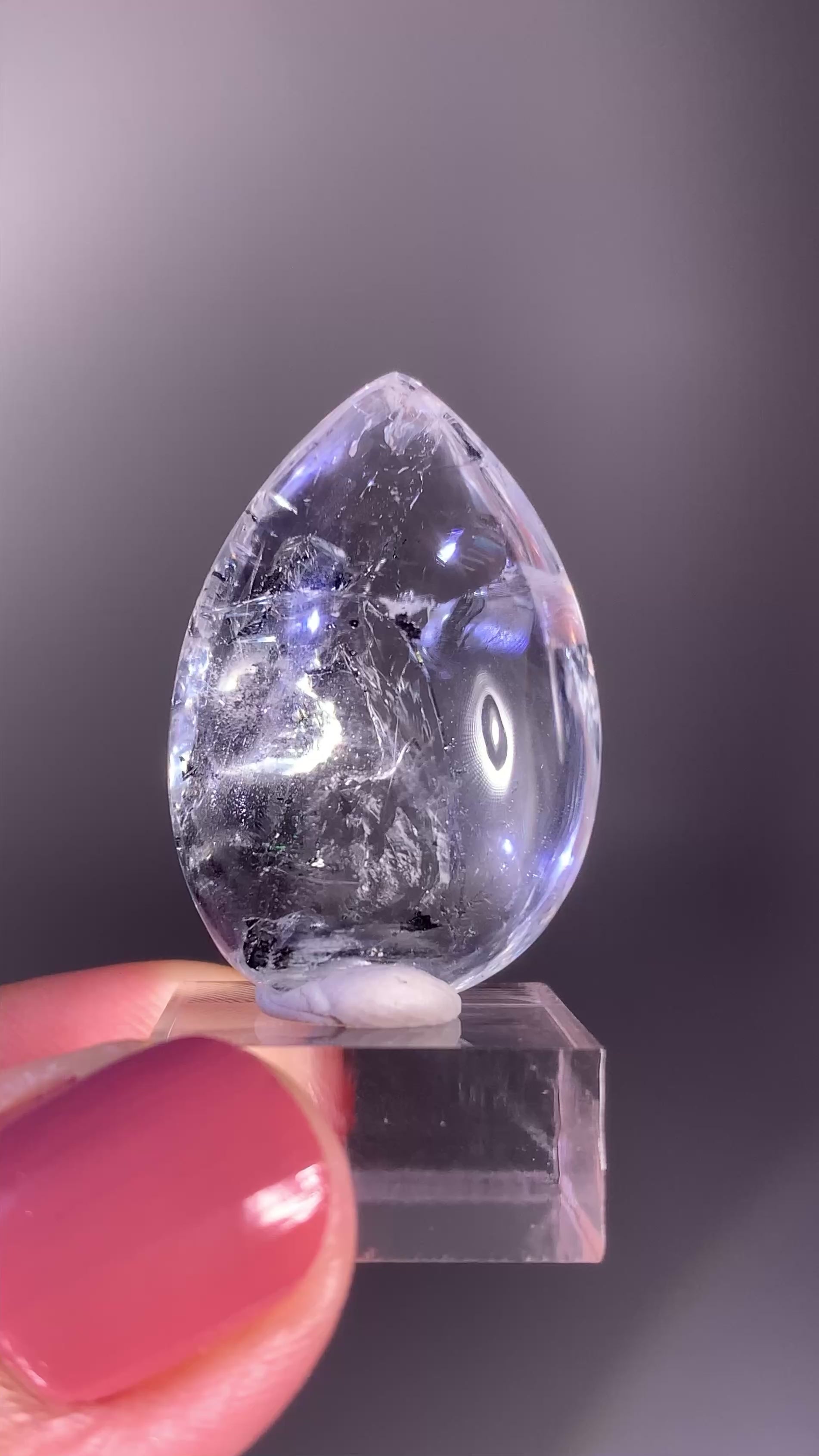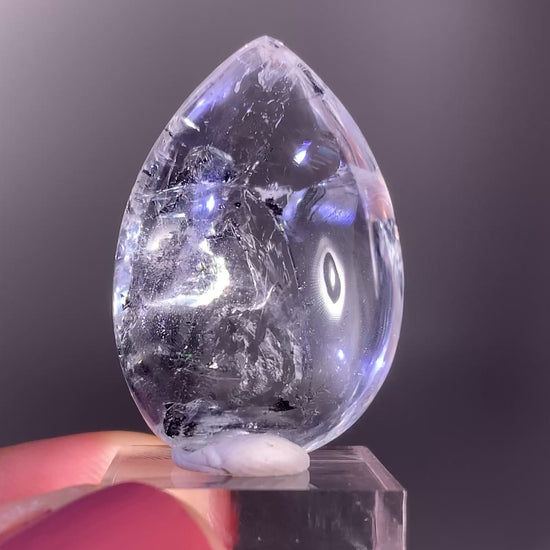 A high-grade polished teardrop of clear quartz featuring a rare enhydro bubble with falling carbon sand. When tilted, the tiny dark particles naturally shift and cascade inside the bubble, creating a mesmerizing “falling sand” effect. This dynamic movement and exceptional clarity make it a unique and highly collectible piece.